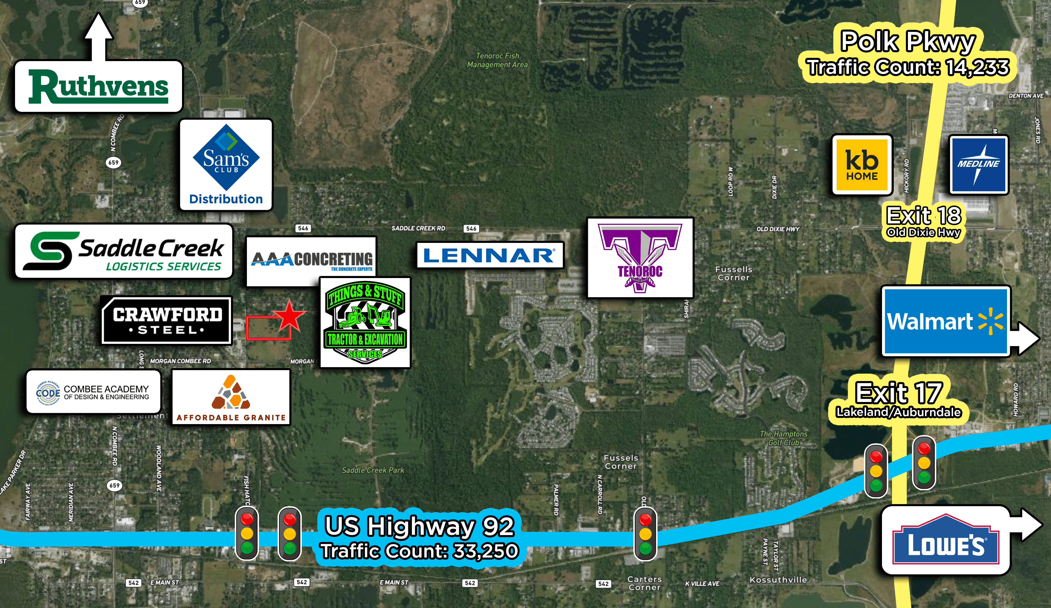 Discover the potential of this 19.72-acre property located on Fish Hatchery Rd in Lakeland, FL. With RL-1 zoning permitting one single-family residence per acre, this land offers an exceptional opportunity for various uses. Possible industrial- Nearby Industrial users such as Allied Crawford, Saddle Creek Logistics, and the Sam's Club Distribution Center. Nature enthusiasts will appreciate the proximity to Saddle Creek Park, offering fishing, hiking, and picnicking opportunities. Tenoroc High School is just 2 miles away, making it convenient for families.