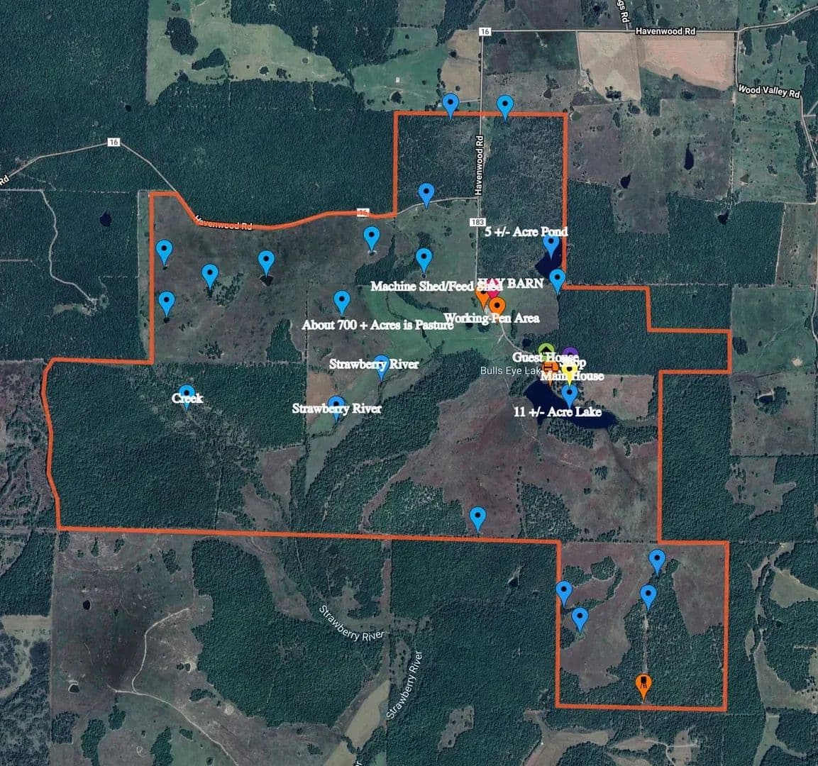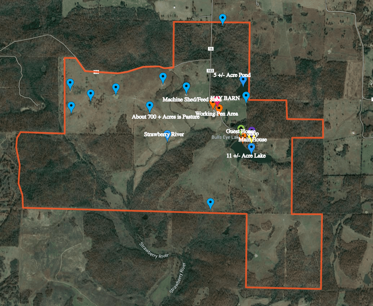 1,242± Acres of rolling pasture, hay ground, timber, river bottoms & mountaintop views15± Acre Bulls Eye Lake plus 20+ ponds, creeks, springs, and Strawberry River frontage700+ Acres of Pasture – fenced & cross-fenced, ready for cattleCorral & Working Pens with permanent setup, head chute, and multiple access pointsMultiple Outbuildings – large shop with concrete floors, machine sheds, hay barns