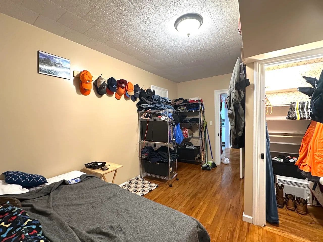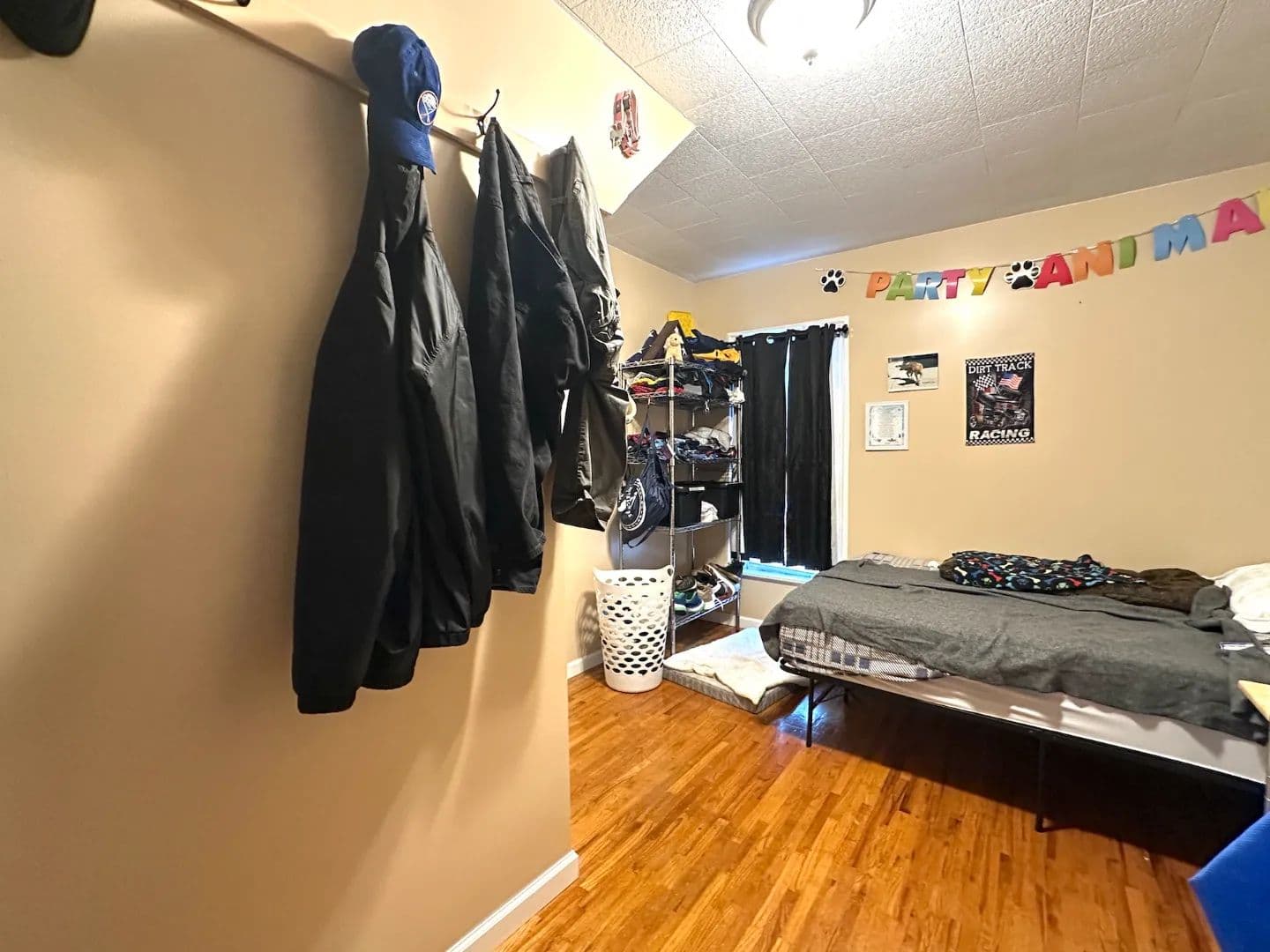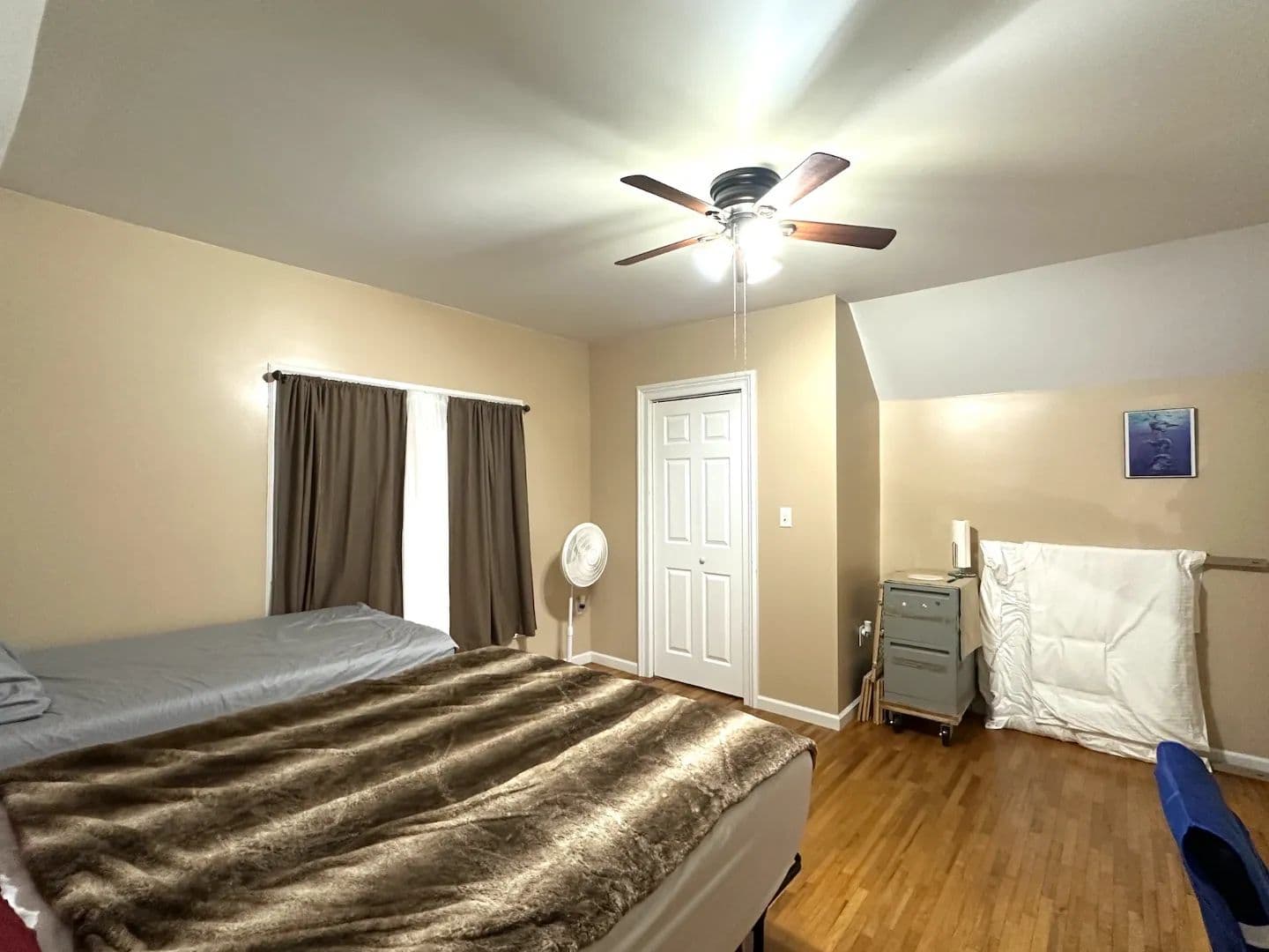 The upper level features two generously sized bedrooms with ample closet space, along with a spacious landing that can serve as a cozy reading nook, study corner, or flexible sitting area. Hardwood floors throughout the home add warmth and timeless character.