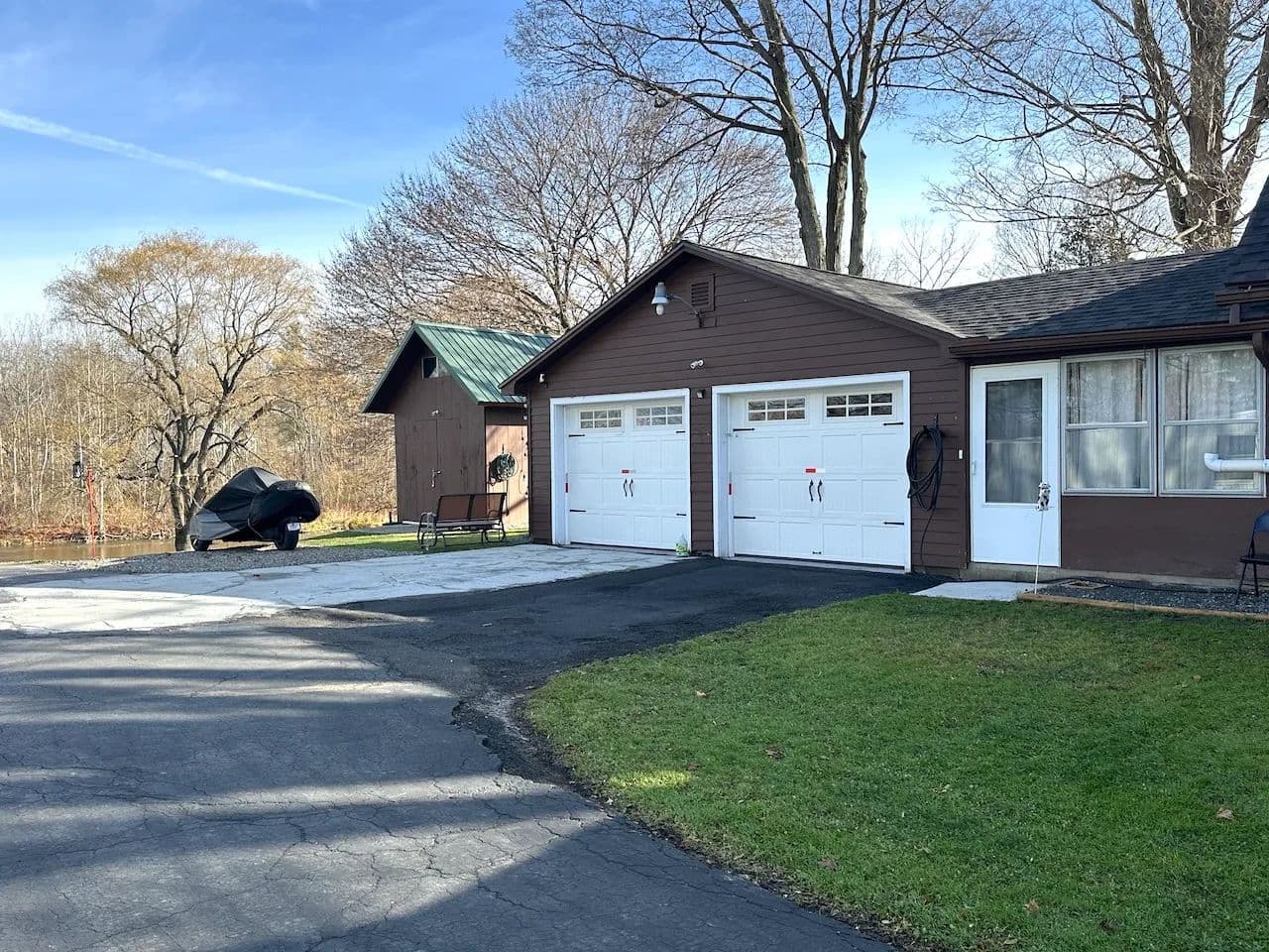 Outside, enjoy tranquil views of the Genesee River from your backyard, an ideal setting for bonfires, relaxation, and play. The property also includes a garden shed with a second-story playhouse for added charm. A blacktop driveway provides plenty of parking and leads to the attached 2-car garage.