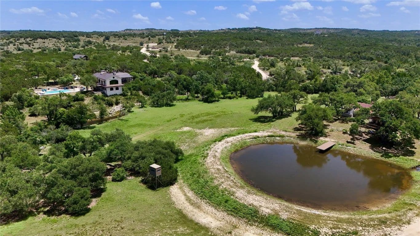Land + Water Features: Elevated views from the main home provide constant breezes and stunning sunsets. The land features varied topography with multiple homesites, open pasture at the entrance, and a wooded creek bottom lined with Live Oaks and hardwoods. A newly built lined pond and 3,300' along spring-fed Cat Hollow creek and the wet weather Storm Creek with five low-water crossings and seven waterfalls enhance the property’s natural appeal. Both creeks merge on the property to then feed into the nearby Onion Creek. The land is teeming with Whitetail Deer and Turkeys and is mostly surrounded by large neighboring ranches, perfect for privacy and wildlife. Three large hunting blinds and nine feeders are in place for hunters and wildlife lovers alike.