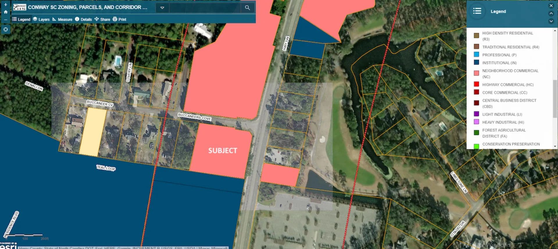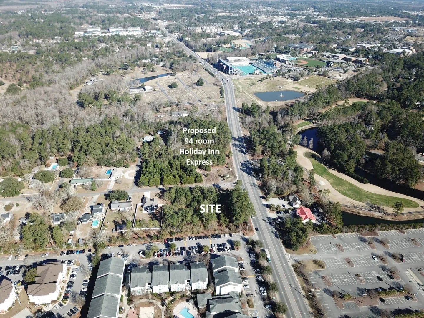 For Ground Lease: 1.75 acre parcel located at the corner of Hwy 544 & Buccaneers Cove in Conway near Coastal Carolina University. 249 ft frontage on Hwy 544. Zoning is NC (City of Conway jurisdiction). Located between The Cove and University Place (student housing) and planned hotel site (94 rooms). 1/2 mile from Brooks Stadium at Coastal Carolina University. ADT on Hwy 544 is 35,700. Measurements are approximate and not guaranteed. Buyer responsible for verification.