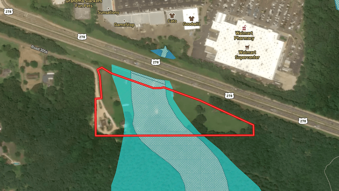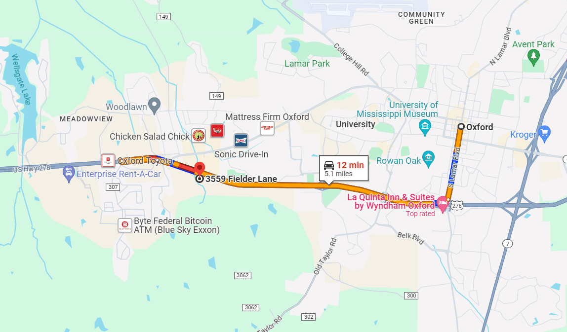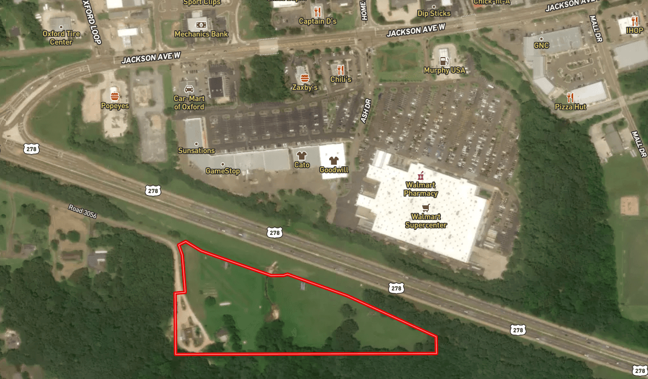 The Lafayette 9.96 is a newly available investment opportunity within the city limits of Oxford, MS. This Lafayette County property has been in the same family for many years as an operational fabrication/welding shop and ranch style residence. Although functional, these improvements likely don’t contribute much value to the property as the highest and best use has changed over the years. The property enjoys a high visibility frontage along the south side of Highway 6, directly south of Walmart and Jackson Avenue (a main travel artery through Oxford). However, the ingress and egress access comes from 3559 Fielder Lane which has a Highway 6 entrance and crossover approximately 1,900 feet to the west. According to MDOT, the most recent Highway 6 traffic count is 38,000 cars per day and is sited just to the east of the property. The topography is relatively hilly and split by a ditch. Approximately 5± acres on either side of the ditch are in the FEMA Flood Zone. The University of Mississippi is nearby, to the northeast, a residential area is to the west, and many commercial establishments are to the north. Interstate 55 (Batesville, MS) is located 23 miles west, and US-278 and US-45 are located 53 miles to the east. This property is currently zoned Suburban/Residential; for more information on zoning and zoning variances, contact the City of Oxford Zoning and Planning office. If you have been searching for a prime location in Oxford, MS, give us a call for your private tour of the Lafayette 9.96.