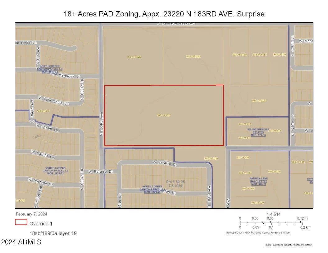 PRIME PAD Zoned 18+ acres ready for commercial or residential development! The North Copper Canyon subdivision borders this acreage on 183rd Ave on the west and also on the south side where Patrick Ln meets 181st Ave. According to the owners, public sewers and water and electricity are on 183rd Ave and waiting for you to take advantage of one of the fastest growing areas in Surprise! Hurry on this one!! Address is Approximate.