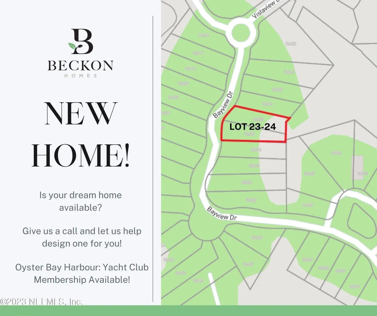 Nestled in a prime location, lots 23 & 24 present an incredible opportunity for buyers looking to build their dream home. These beautiful lots can be sold directly to buyers with their vision for their future home or purchased with the option to partner with Beckon Home Builder. With this partnership, buyers can take advantage of the expertise and experience of Beckon Home Builder to bring their dream home to life. Whether you choose to use one of our floor plans or have a custom design in mind, Beckon Home Builder will work closely with you to ensure that every detail is tailored to your needs and preferences are met. Don't miss out on the chance to create your ideal living space on these exceptional lots. ****96602 Bay View Drive is being sold with 96608 Bay View Drive.