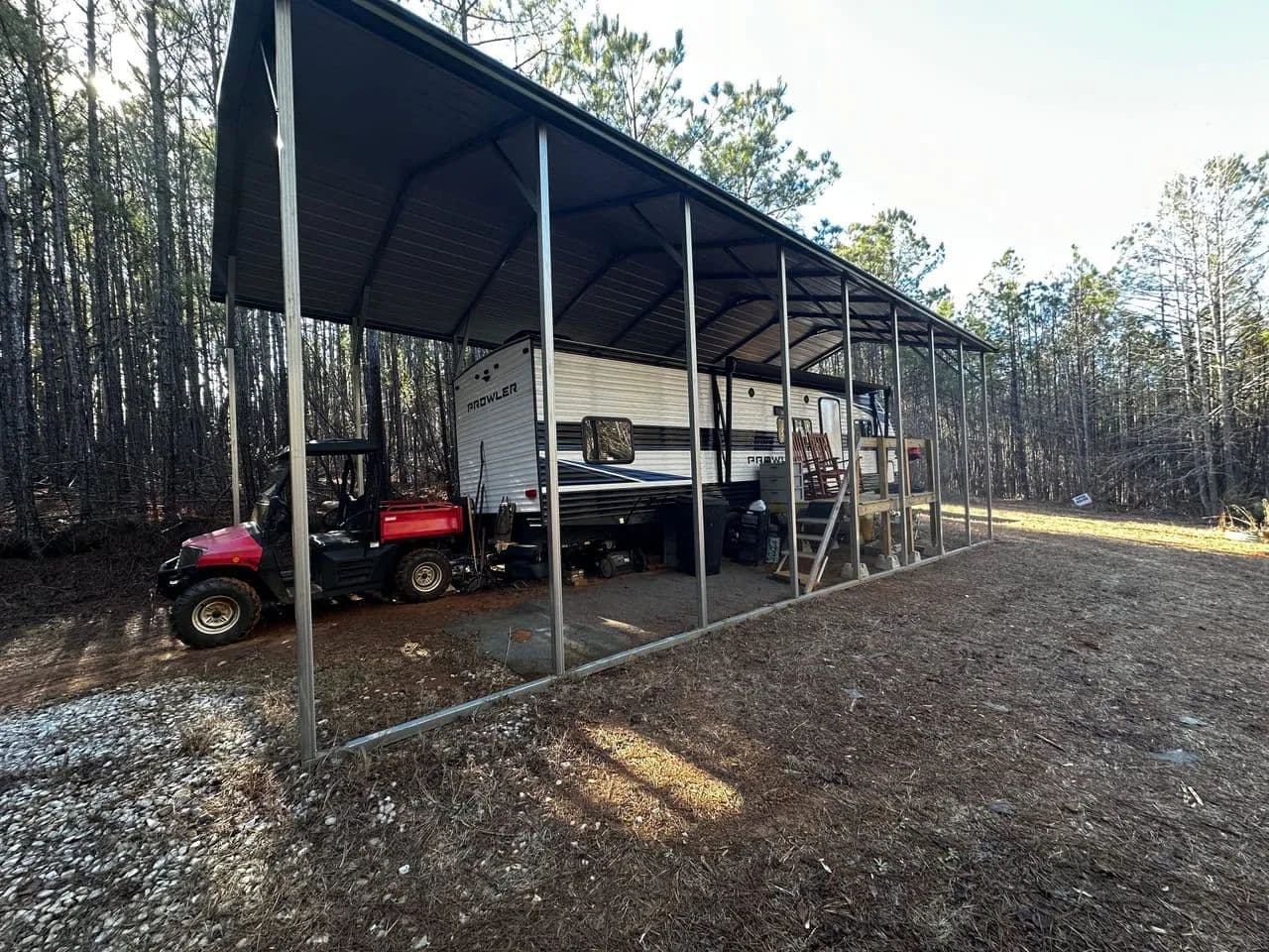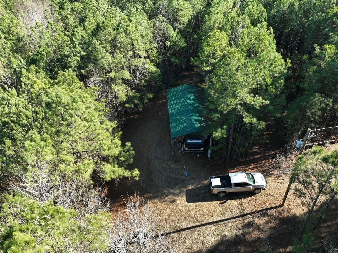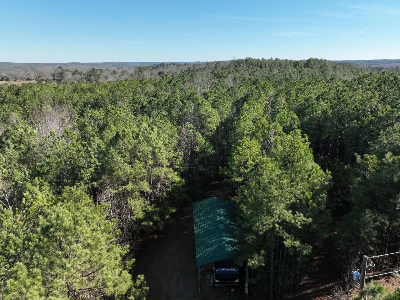 A Prowler camper, located under a covered shed, is included and provides a comfortable and convenient base for weekends at the camp, extended stays during hunting season, or while building your dream home or hunting cabin. This setup allows you to enjoy the property while planning for future improvements immediately.
