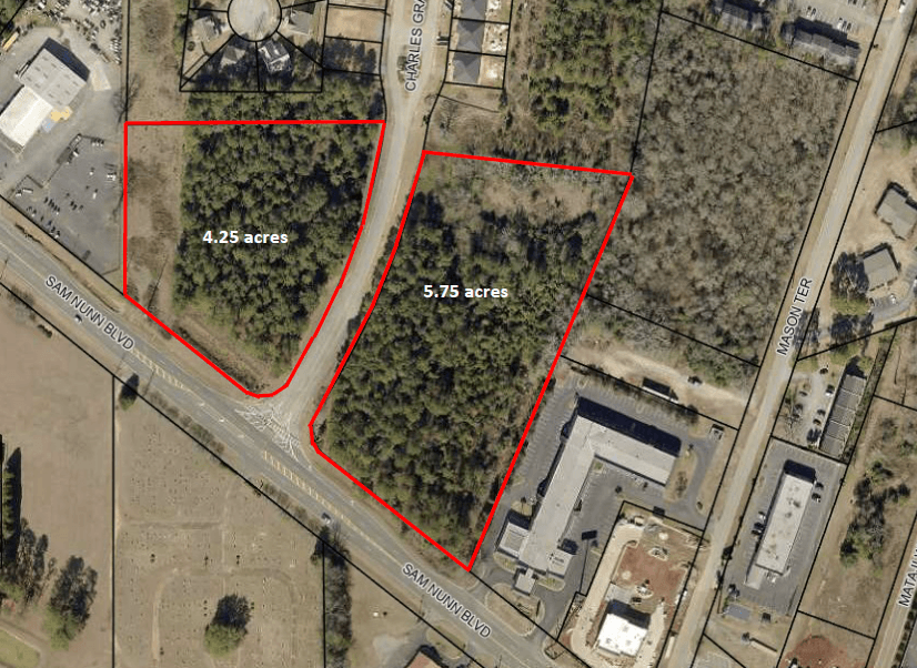 10 acres zoned commercial on Sam Nunn Blvd. Can be subdivided. City utilities and close to I-75. Surrounded by restaurants, hotels, and shopping.
