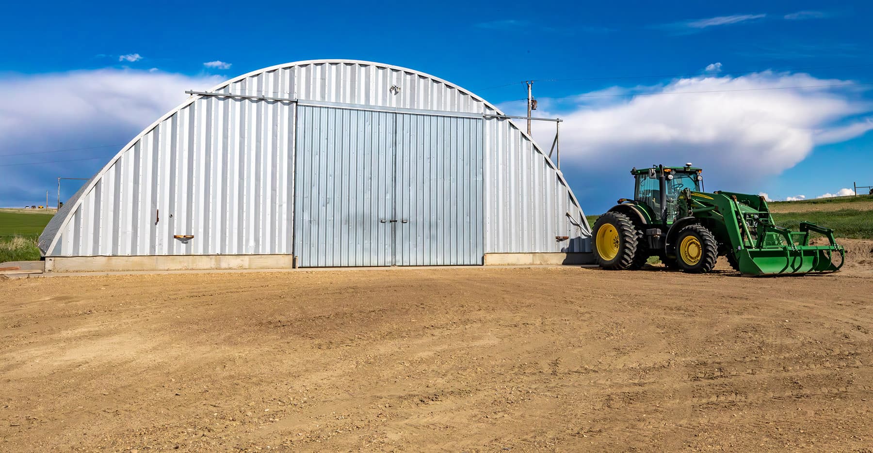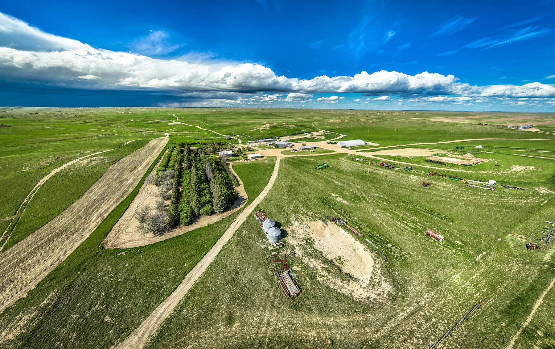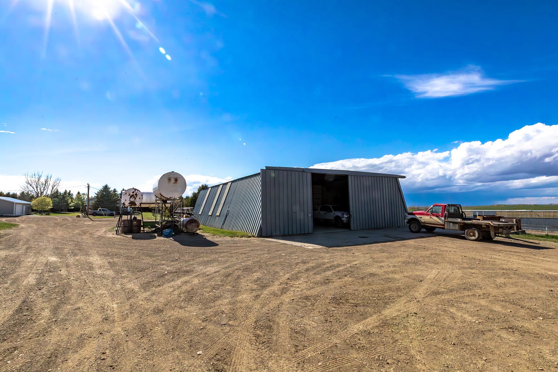 ~ Full complement of agricultural buildings, including grain storage, multiple shops, and sheds