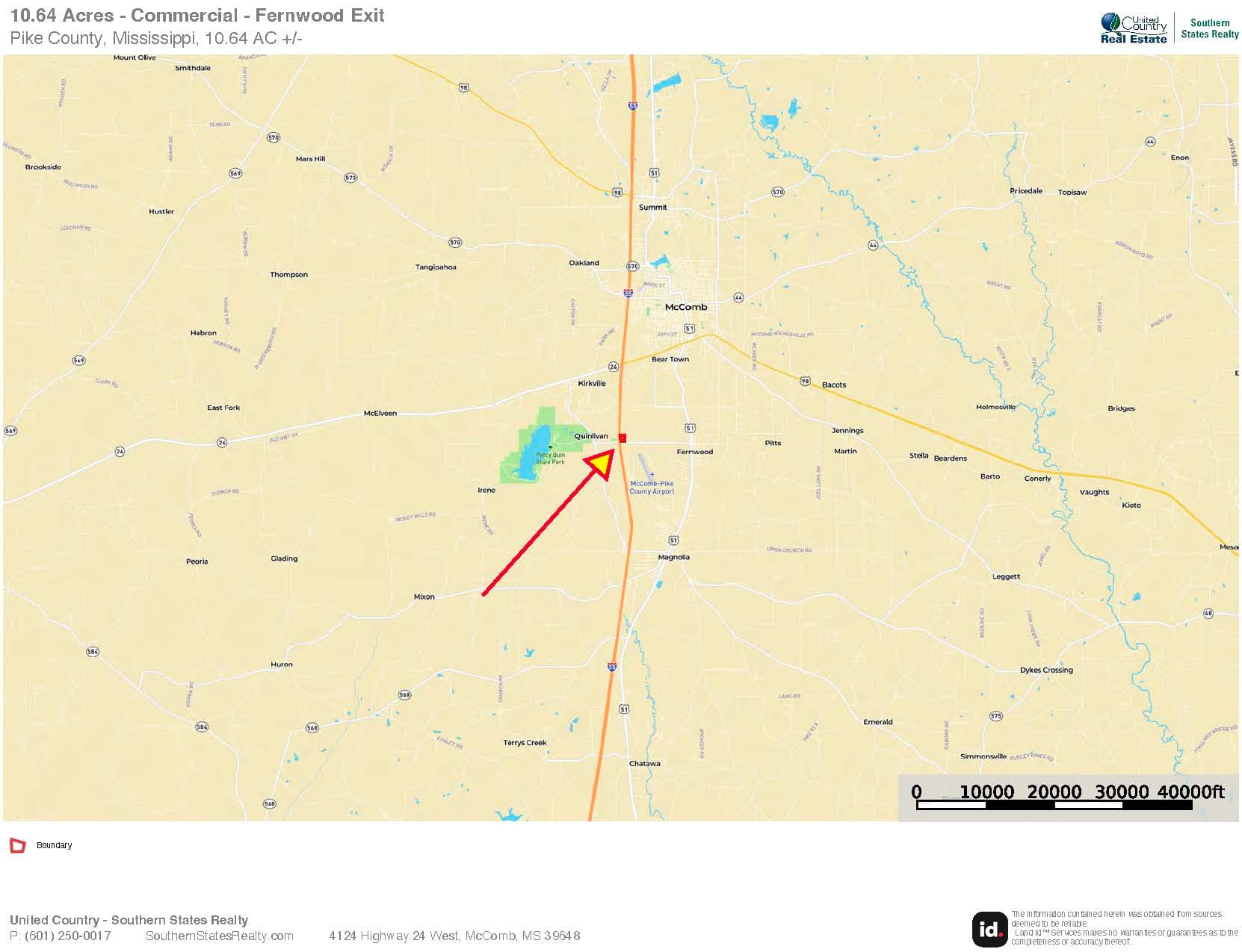 Prime Commercial Property on the Fernwood Exit on I-55 in Pike County, Mississippi. Sewer and water on site. Excellent visibility from I-55 and road frontage on Airport Fernwood Rd and Gateway Rd. Located across from Love's Truck Stop and McDonald's and at the entrance of Pike County's Gateway Industrial Park where new projects include a Coca-Cola distribution center, John Deere dealership and service center, a national trucking logistics company, and a state-of-the-art National Guard Readiness Center.
