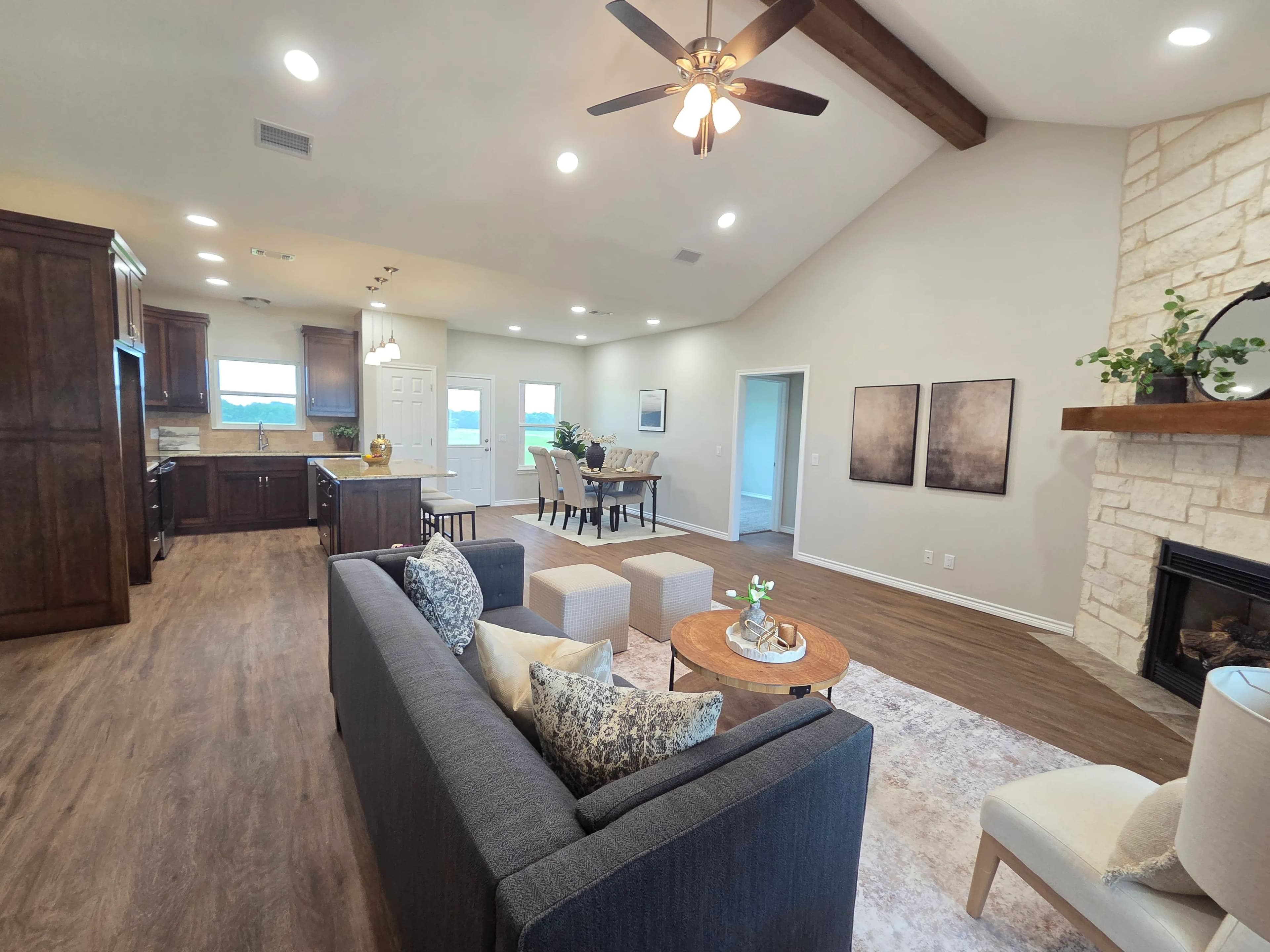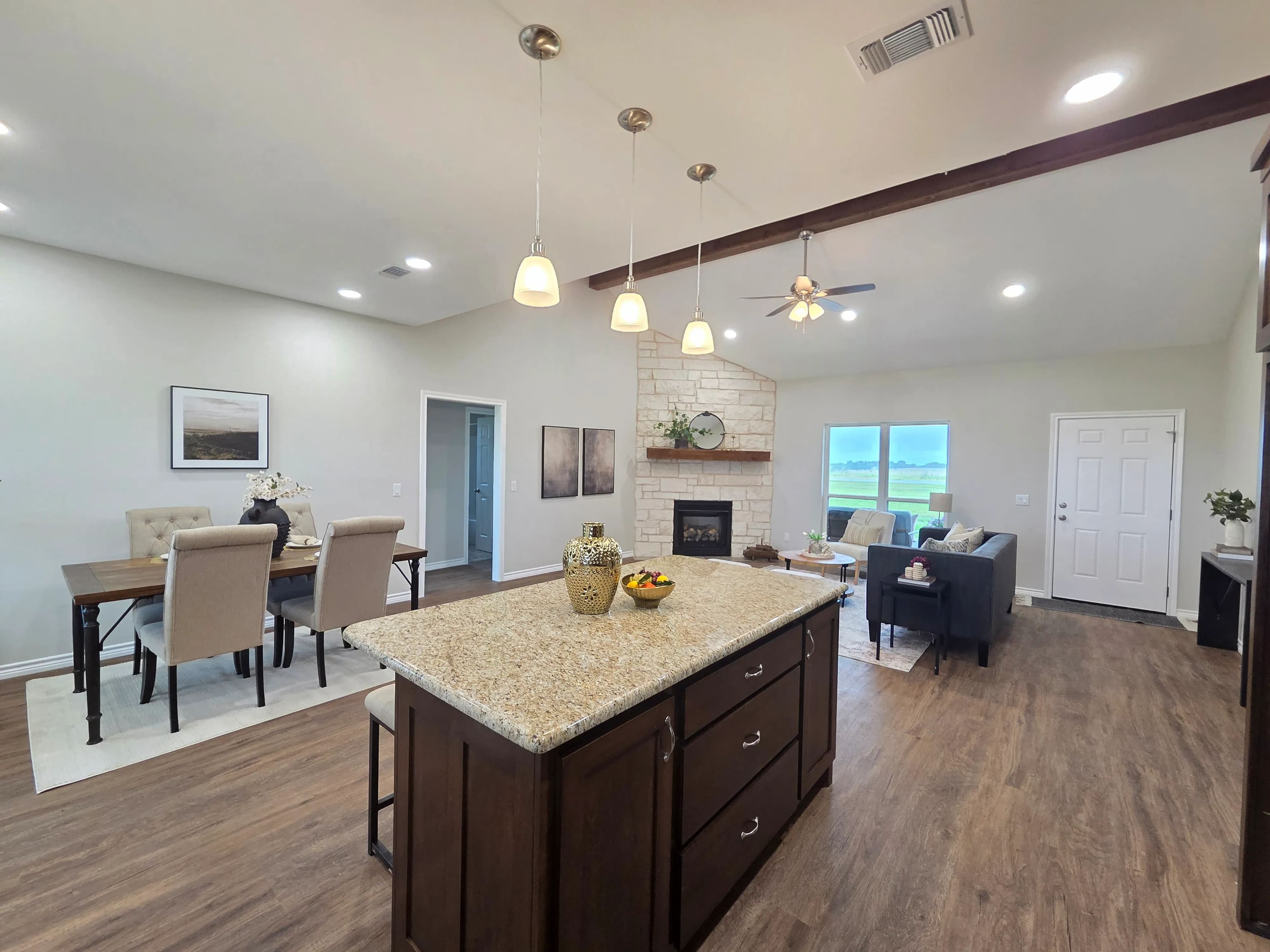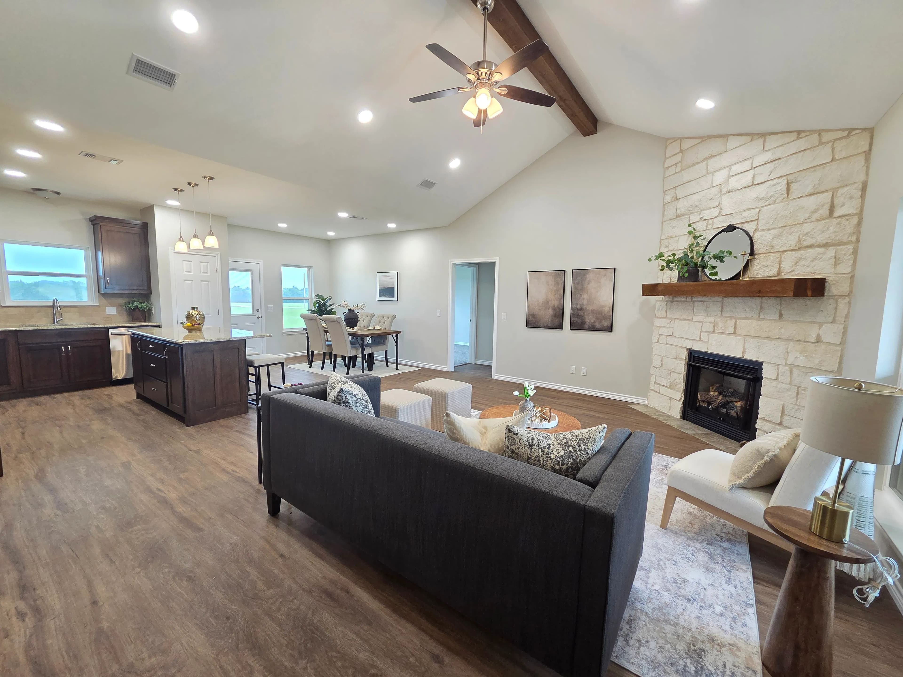 Step inside to discover a thoughtfully designed split-bedroom floor plan, offering privacy and comfort. The kitchen features custom cabinets and sleek granite countertops, providing both style and functionality. A vaulted ceiling enhances the open-concept living area, while the cozy fireplace in the living room adds warmth and charm—perfect for relaxing evenings.