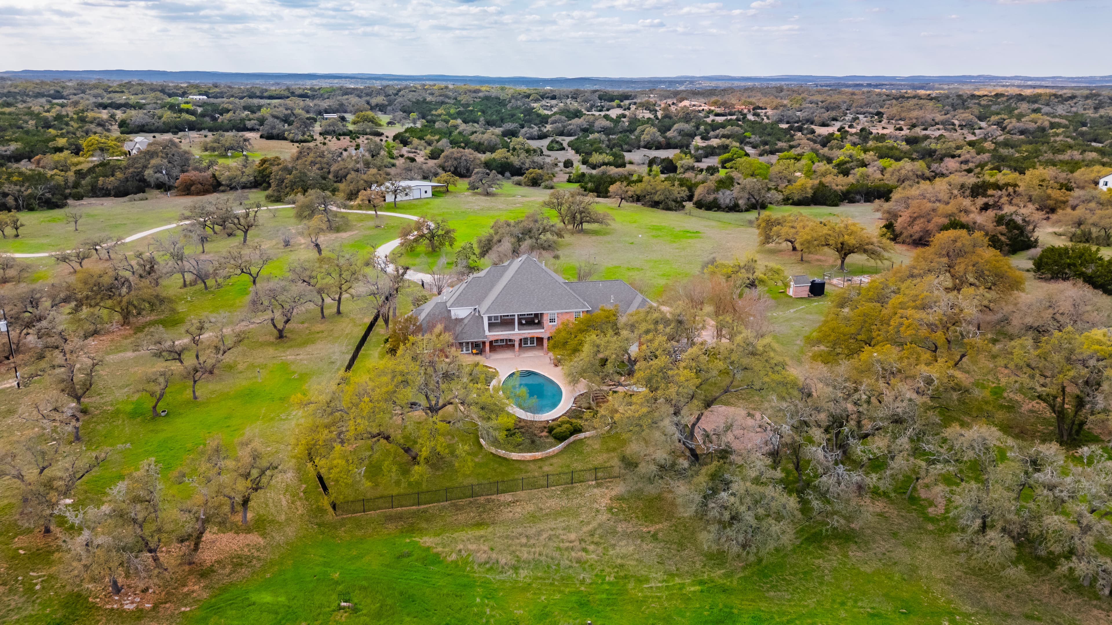 Discover the allure of 1601 Panther Creek Rd, Driftwood, a secluded retreat on over 26 acres of fenced countryside, just a short drive of the vibrant communities of Dripping Springs and Austin. Refresh your soul as you immerse yourself in an outdoor sanctuary featuring a pool and expansive covered living area, set against a backdrop of stately live oaks and the vibrant symphony of local birdlife. Then, feel the world melt away as you retreat to this spacious and stately home with 4 bedrooms, 5 baths and ample living spaces with living room, two dining areas, library/office, game room and incredible storage. The large primary suite is on the first floor and has direct access to the exterior. In addition, a versatile insulated workshop on the property provides an ample area to tinker, create or park your toys, including a covered area to park an RV or boat. Escape to your own private sanctuary! Enjoy panoramic views, including a long-range vista from the second-floor balcony. The historical and picturesque windmill on the property completes the Hill Country ambiance you truly desire! Wildlife management valuation for low taxes.