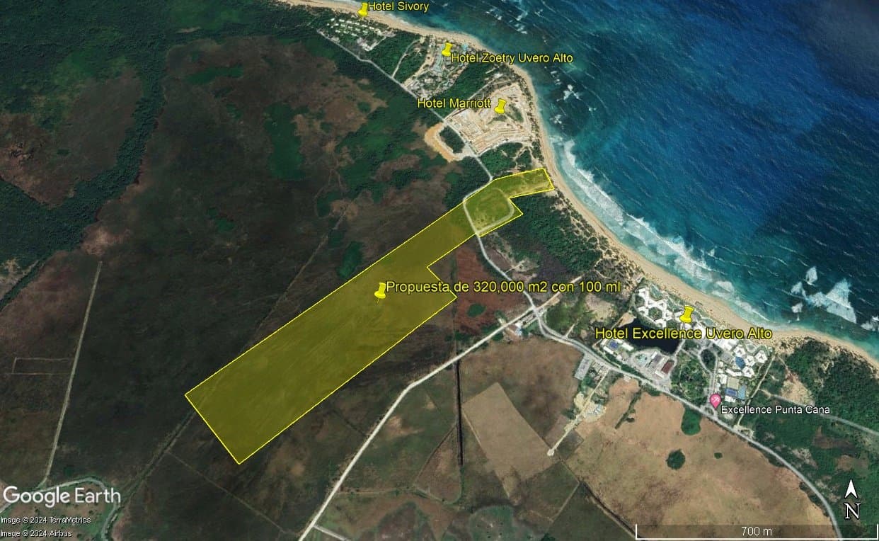 Embark on the epitome of coastal luxury living with this exclusive commercial land in UVERO ALTO beach - PUNTA CANA. Positioned strategically between the soon-to-be iconic JW MARRIOTT Hotel and the renowned EXCELLENCE PUNTA CANA HOTEL, this rare offering presents you with an expansive 320,000 m2 of paradise, featuring an impressive 100 meters of coveted beachfront. Immerse yourself in the allure of Uvero Alto, where prestigious hotel chains like ROYALTON CHIC, BREATHLESS PUNTA CANA, NICKELODEON, DREAMS PUNTA CANA, LIVE AQUA, OCEAN EL FARO, EXCELLENCE EL CARMEN, DREAMS ONYX, ZOETRY AGUA, LE SIVORY, and many more call home. Enjoy seamless access by road, backed by a reliable power supply from CEPM, a convenient drinking water connection, and efficient sewage disposal. With a wastewater treatment plant service at your disposal, we prioritize your comfort and convenience. Situated a mere 5,000 meters from the El Coral highway, this exclusive commercial land is not just an investment, it's a connection to the heartbeat of Punta Cana. And, of course, it boasts an extensive 100-meter beachfront line that provides unparalleled access to one of the Dominican Republic's most breathtaking beaches. Seize the extraordinary opportunity to own an immense piece of paradise and elevate your business with our exclusive 320,000 m2 commercial land in Uvero Alto. Act now, as opportunities like these, complete with a generous beachfront, are as rare as the beauty that surrounds them. Other available options: Exclusive Coastal Oasis - 254,000 m2 with 50 m2 Beachfront Grand Coastal Retreat - 680,000 m2 with 300 m2 Beachfront