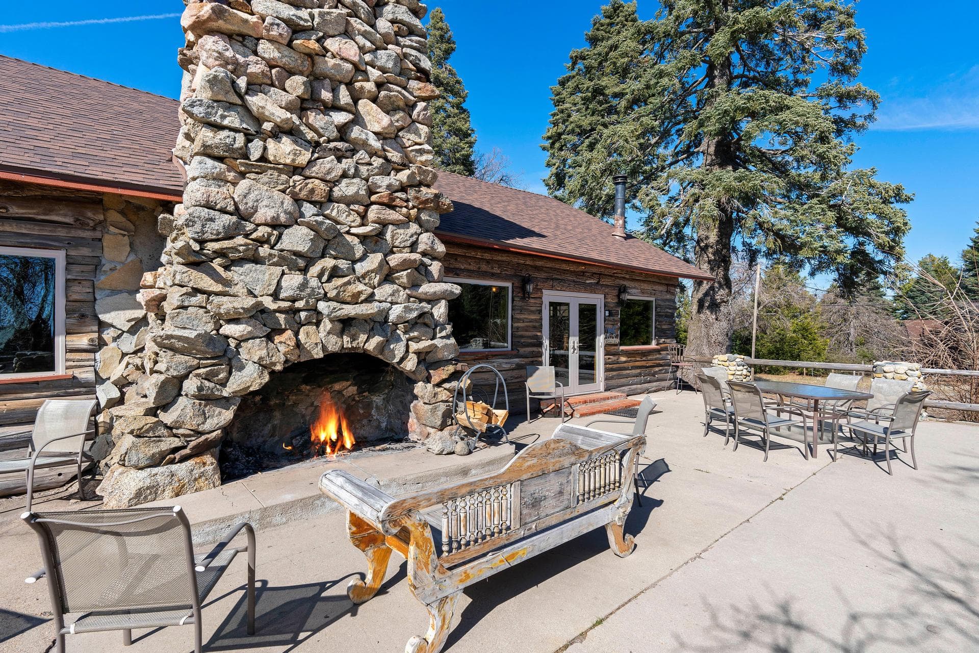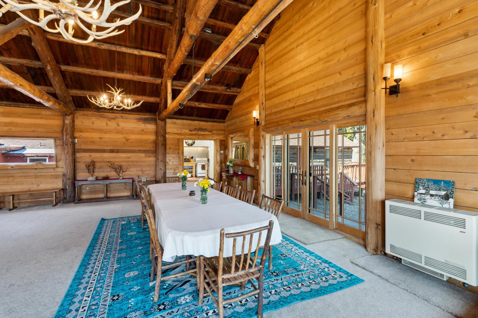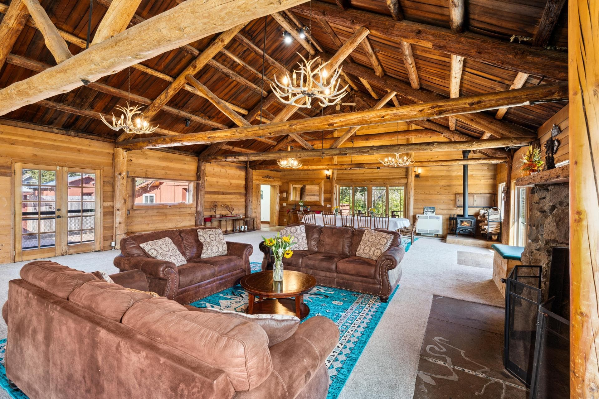 Situated on a relatively flat, scenic 3.74-acre estate, The Lodge offers an unparalleled mountain experience, enhanced by a series of modern upgrades. Step into the grand 1,800 +/-sf. great room, featuring soaring log-beam ceilings and a stunning natural stone fireplace that instantly sparks a sense of serenity. Ten inviting guest rooms, completely remodeled for contemporary comfort, await. New doors and windows bathe the Lodge in natural light, while new carpeting ensures a touch of plush luxury underfoot. An efficient solar system tops it all off, reducing your environmental impact and energy costs.