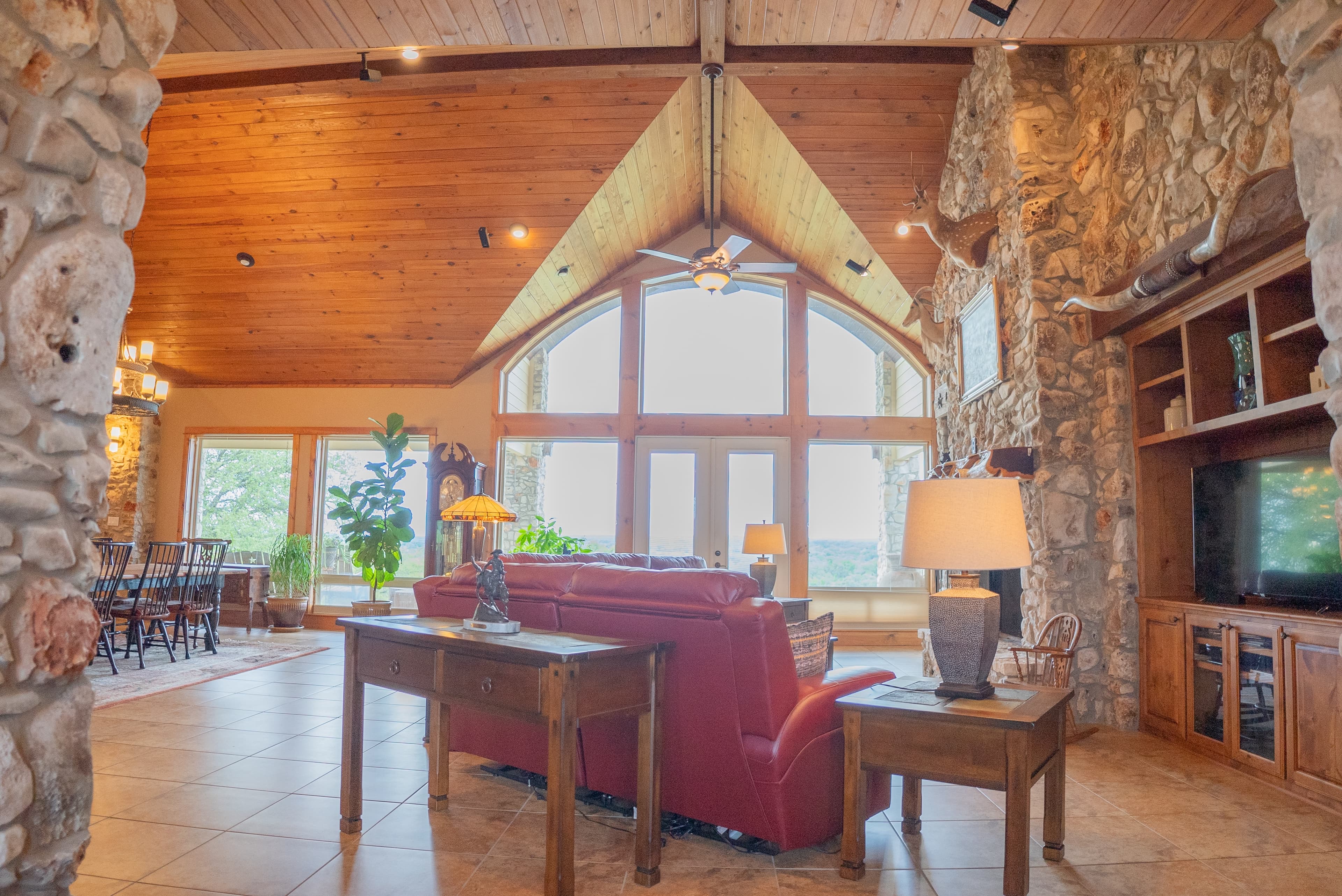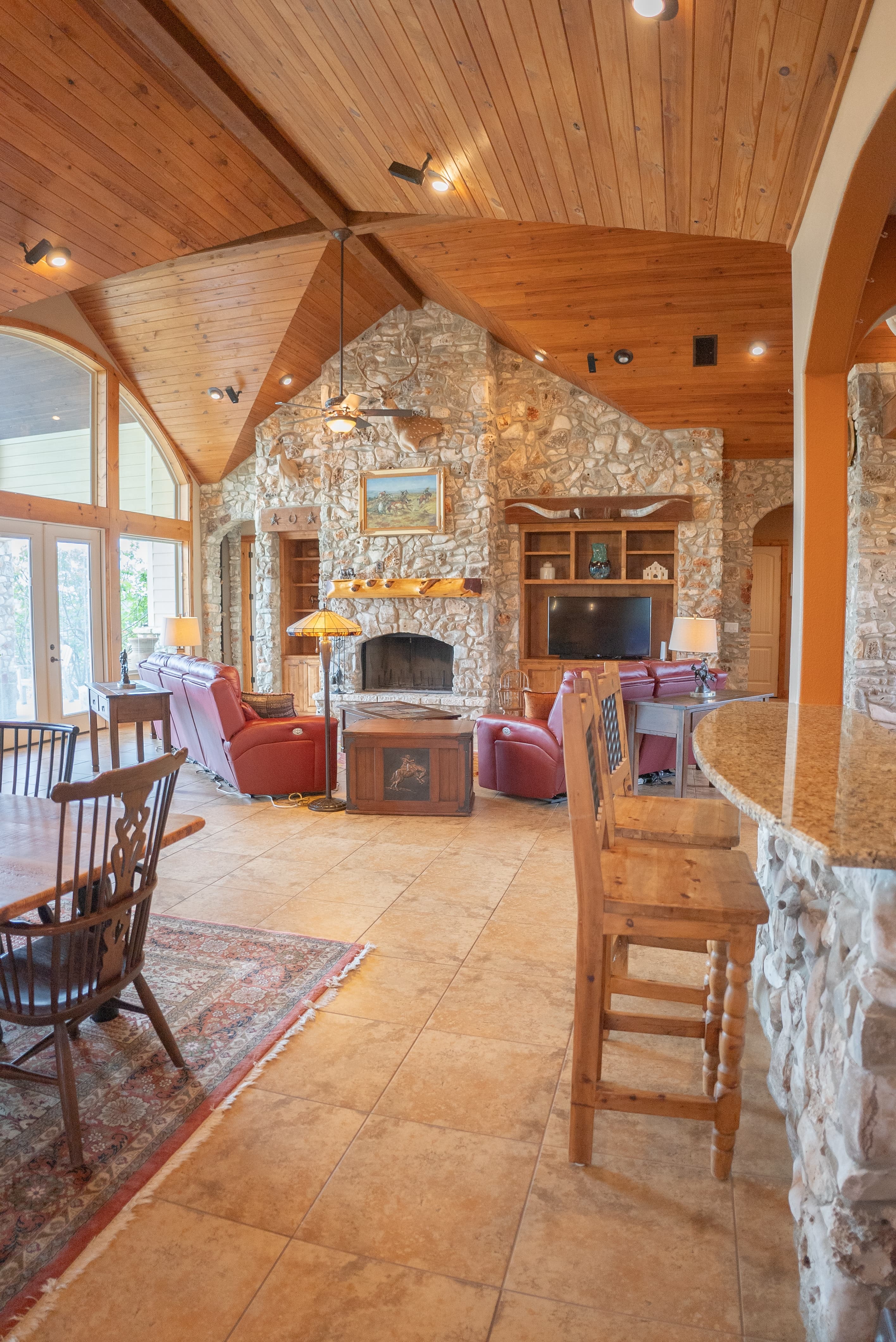 As you enter this beautiful home you will notice the magnificent stonework made from stones gathered from the property. The custom finish, along with the abundant window views, will take your breath away. The amazing tile and wood floors along with the custom woodwork and cabinetry indicate the excellence in craftmanship that went into this home. The vaulted wooden ceilings will amaze you as the interior incorporates with the openness and incredible window views. The entire home is wheelchair accessible with smooth floor transitions, an additional lower sink/counter in the kitchen, and primary bathroom for wheelchair access if needed.