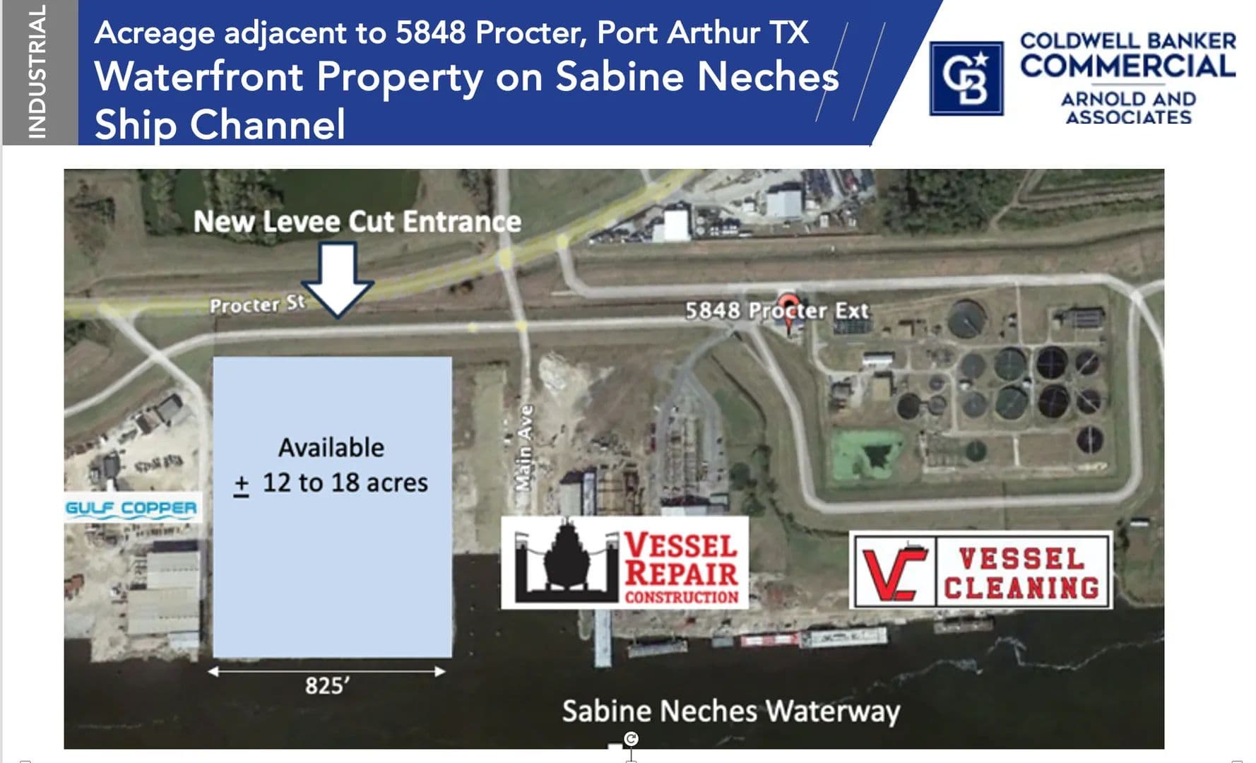 • Option #1: 12 Acres – with 500 lineal feet of water front property • Option #2: 18 Acres– with 825 lineal feet of water front property • Approximately 12’14’ depth at dock and quickly slopes to 20’ • Common spoils site for maintenance dredging • New rip rap material installed along the entire waterfront • New monopiles (32” diameter/ 60’ length with 25’ above mudline / 7/8’s inch wall thickness) • Corps permit for dredging up to 45 ft deep allowing up to a Panamax ship to be breasted • Located at water way mile marker 280 / Property within city limits of Port Arthur • City water on site / natural gas and city sewar at entrance near Procter • Electricity on site: 3 phase 480 volt • Ground core samples show medium to dense clay at 2 feet • Abandoned rail spur easement – possible for pipeline right of way • Parts of the property elevated to levels that have never been affected by flooding • Zoned “Industrial” / City of Port Arthur