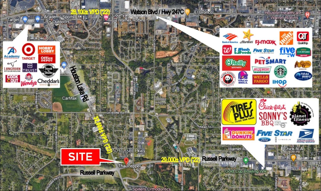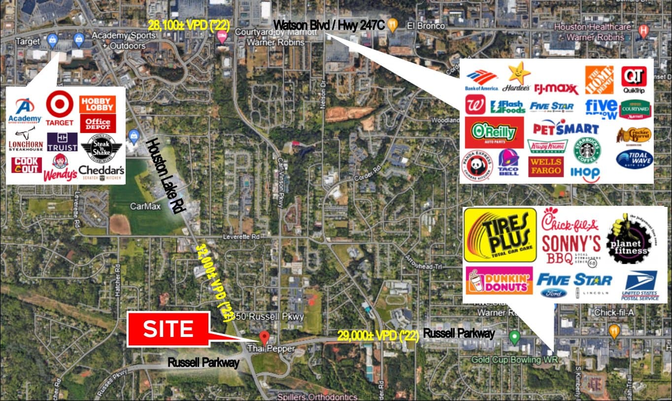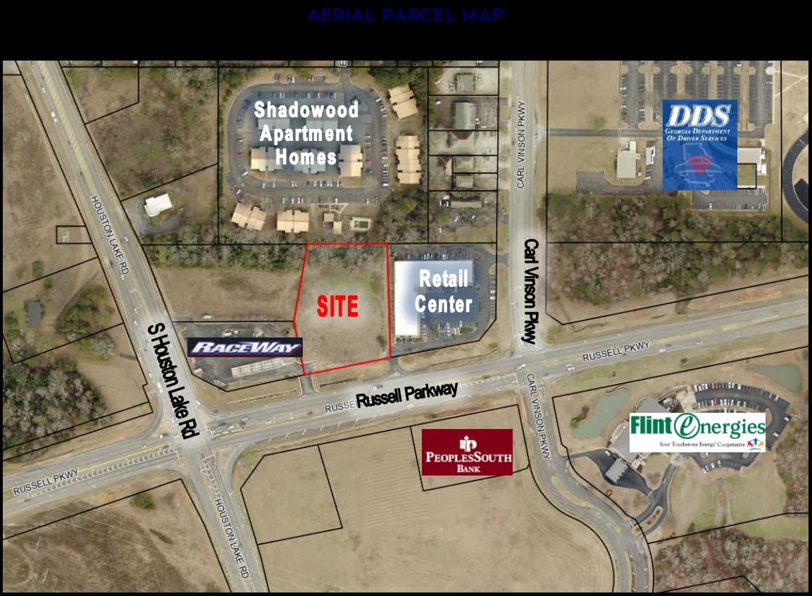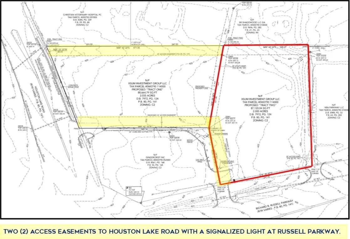 2± Acre Commercial Development Site Two access easements to Houston Lake Road with a signalized light at Russell Parkway 247.4’± Frontage on Russell Parkway Great visibility with an easement access to Houston Lake Road 29,000± AVG VPD on Russell Parkway (2023 GDOT) 32,000± AVG VPD on Houston Lake Road (2023 GDOT) Topography: Level, at road grade All utilities available to the site Zoned C2