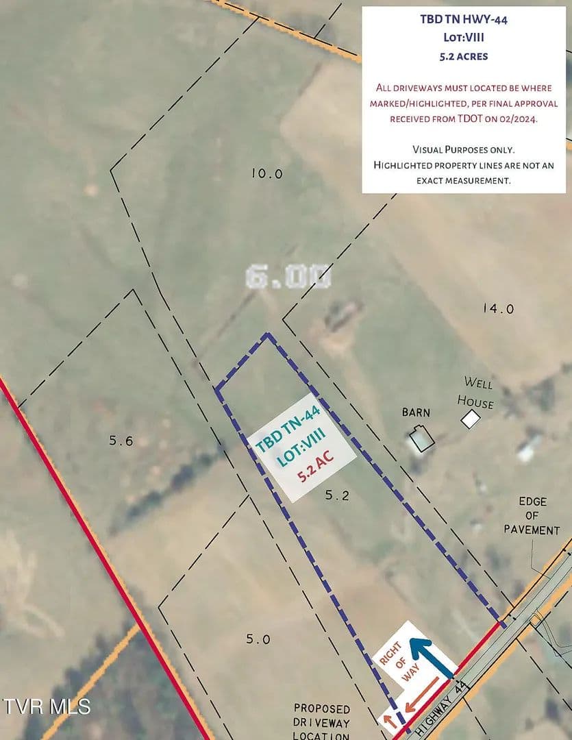 Additionally, the property has a right-of-way easement (at the road) for access to the Lot 7 driveway. TDOT has approved the driveway locations as marked on the survey, ensuring all state highway regulations are met. For those looking for more space, additional acreage tracts are available for purchase. Please note that the minimum tract available is 5 acres, and the seller will not divide existing lot listings into smaller (lesser acreage) parcels.