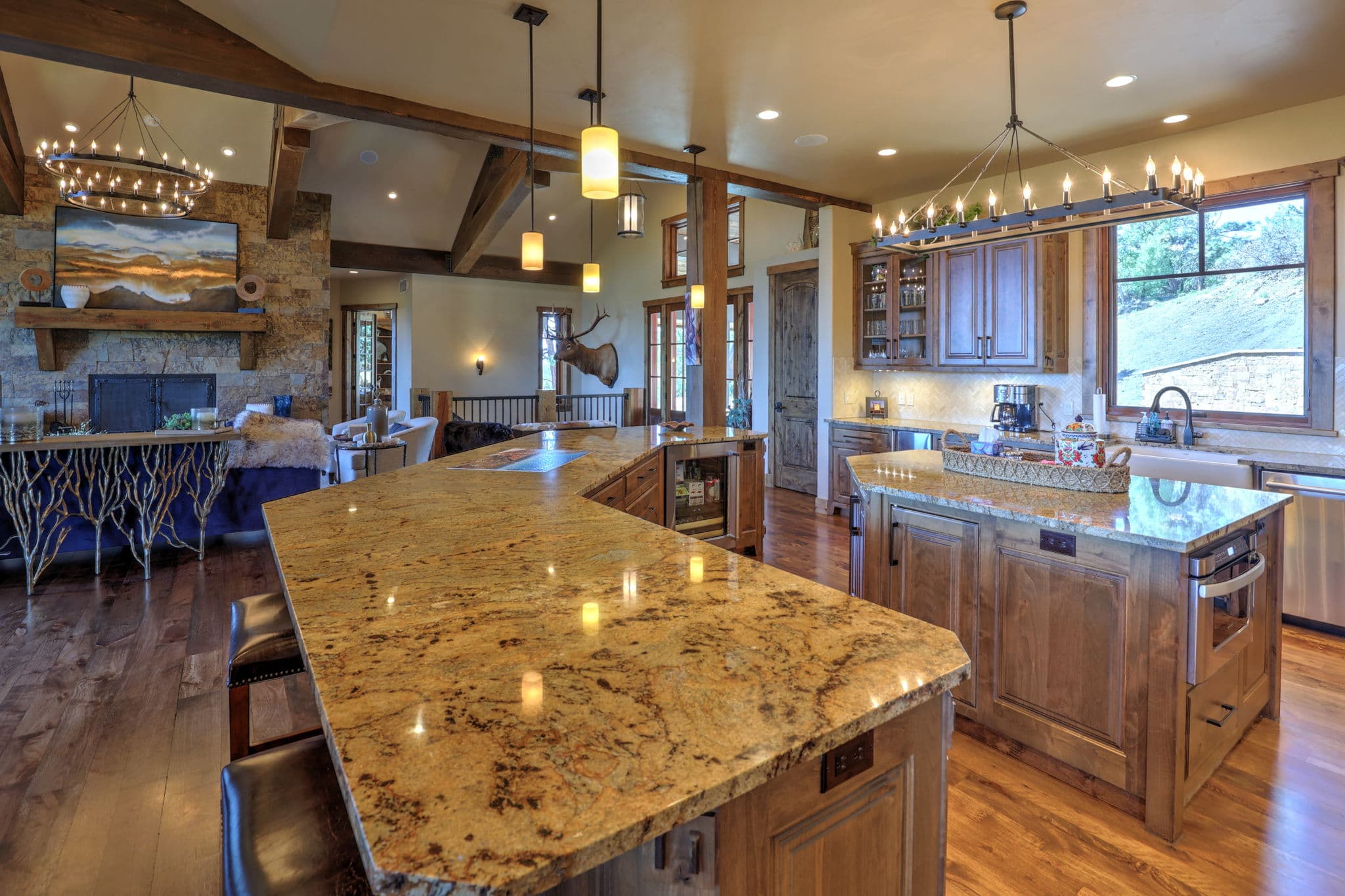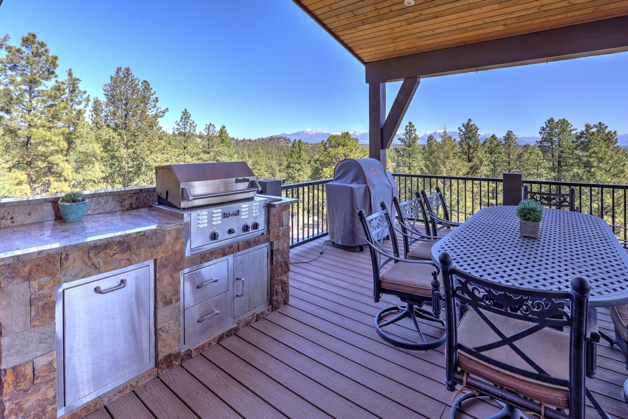 Presenting 189 Kelseya Circle in Pagosa Springs.............an absolutely stunning home located in the highly sought-after Timber Ridge Ranch! Perched high on a 3.8 acre parcel, this home offers incredible views of the San Juan Mountains including both the north and east ranges. From the moment you enter the front door, you feel the quality of this impeccably designed home built by Chanelle Harwood Homes. The great room shows off a fireplace with a stone wall, wood trusses, and ideally situated floor to ceiling windows capturing the mountain views. The gourmet kitchen is open to the living and dining areas with a wrap-around bar, center island, granite counter tops, and custom alder cabinets. The appliances are top of the line including Wolf and Sub-Zero, wine cooler and an over-sized walk-in pantry with ample storage. The master suite is across the hall from your home office and includes a beautiful gas fireplace, amazing mountain views, vaulted ceiling, a massive walk-in closet, custom shower with body jets, remote controlled functioning blinds and a soaking tub. Each of the three additional bedrooms have their own ensuites. The lower level consists of an additional family room with a game room, built-in bar, pool table, and a gas fireplace. Additionally you will find a theater room which seats 11, sauna, fitness room and flex space which would be perfect for a wine room. You also have access out to your hot-tub and fenced area for your pups. The two attached garage spaces boasts over 1400 square feet on the main and lower levels. The entire driveway is paved and the internet is Starlink. Upgraded features include 8-foot knotty alder doors, hardwood floors, alarm system, built-in speakers, air-conditioning, whole-house humidifier, and custom tile through-out. Home is being sold furnished!