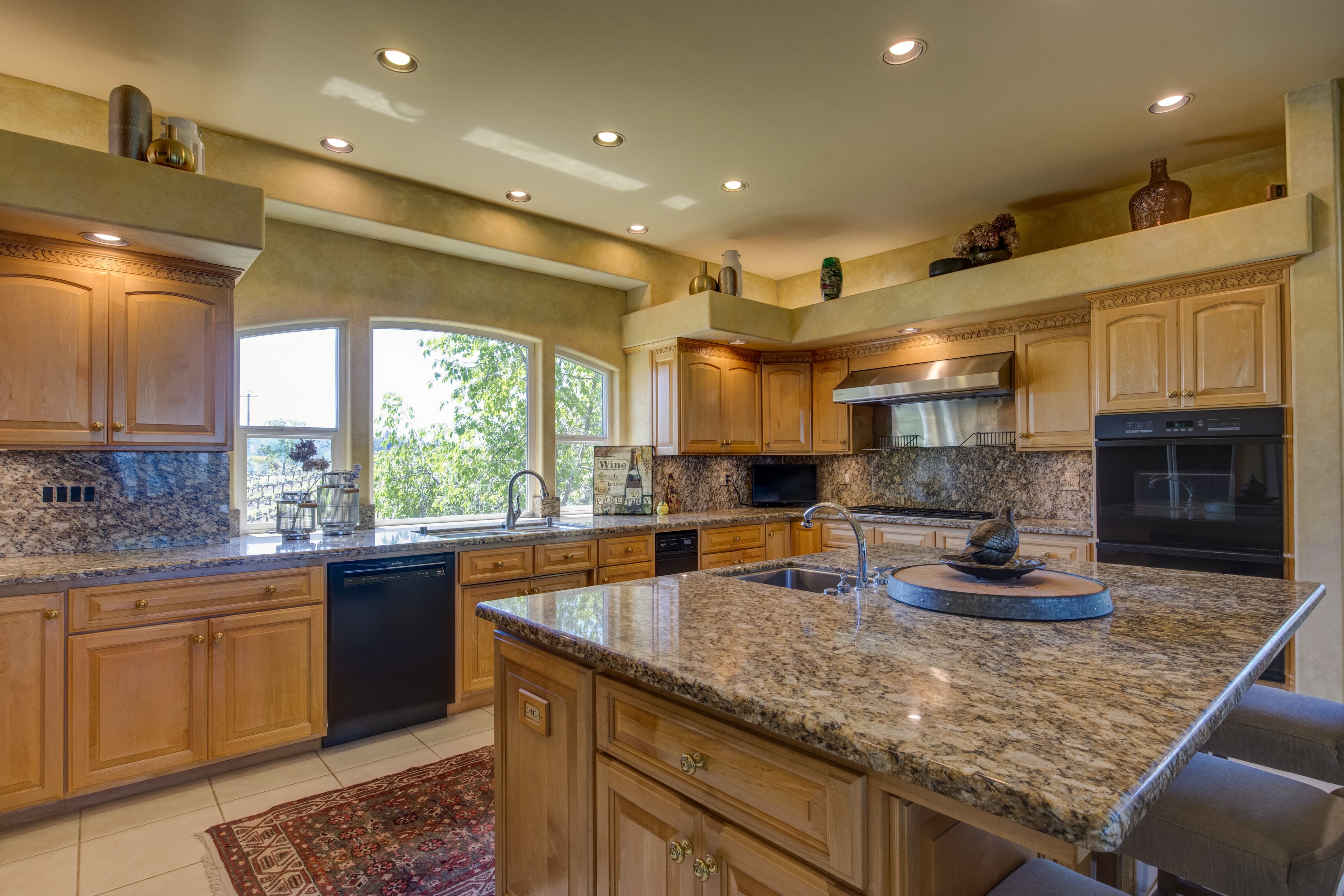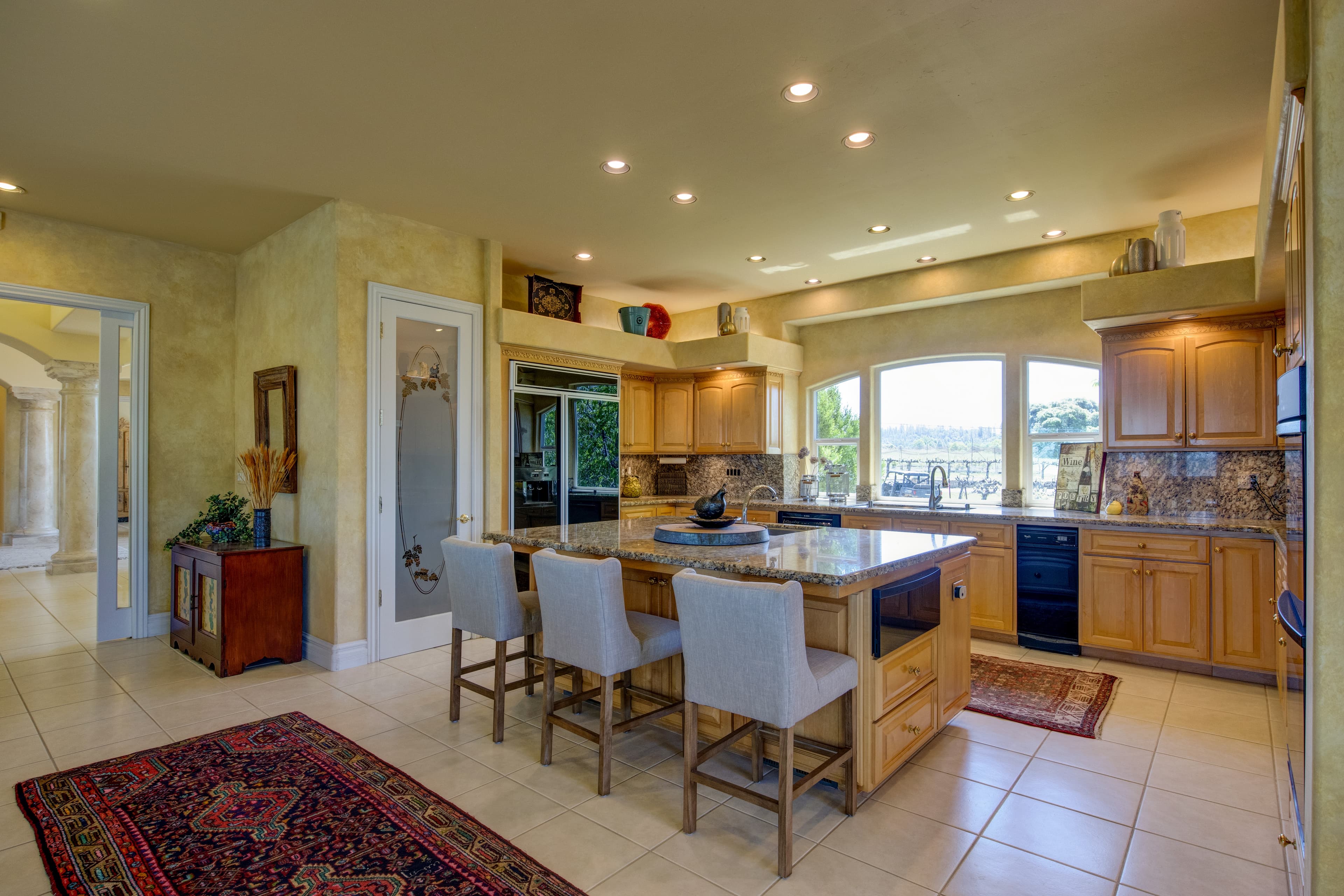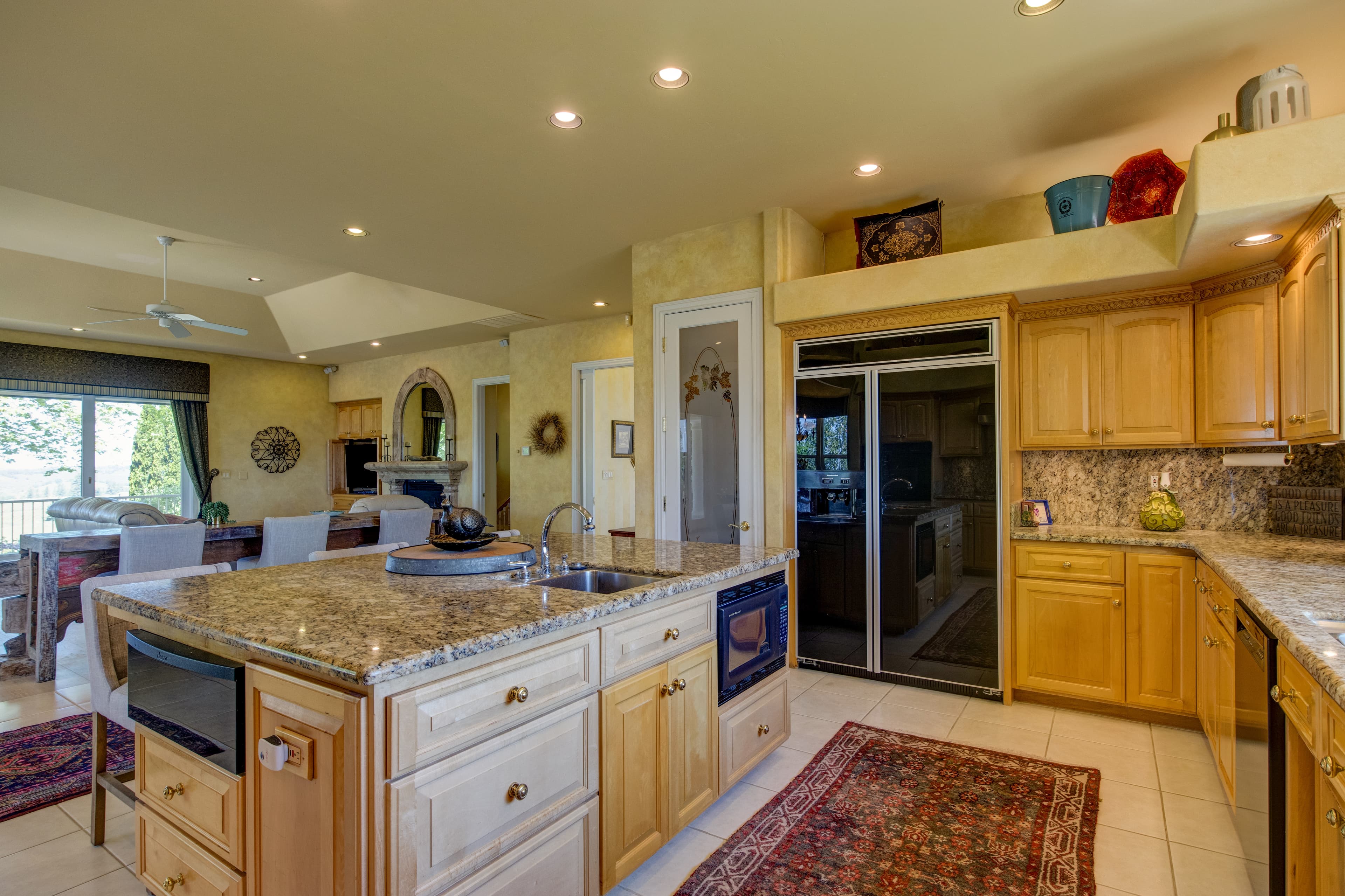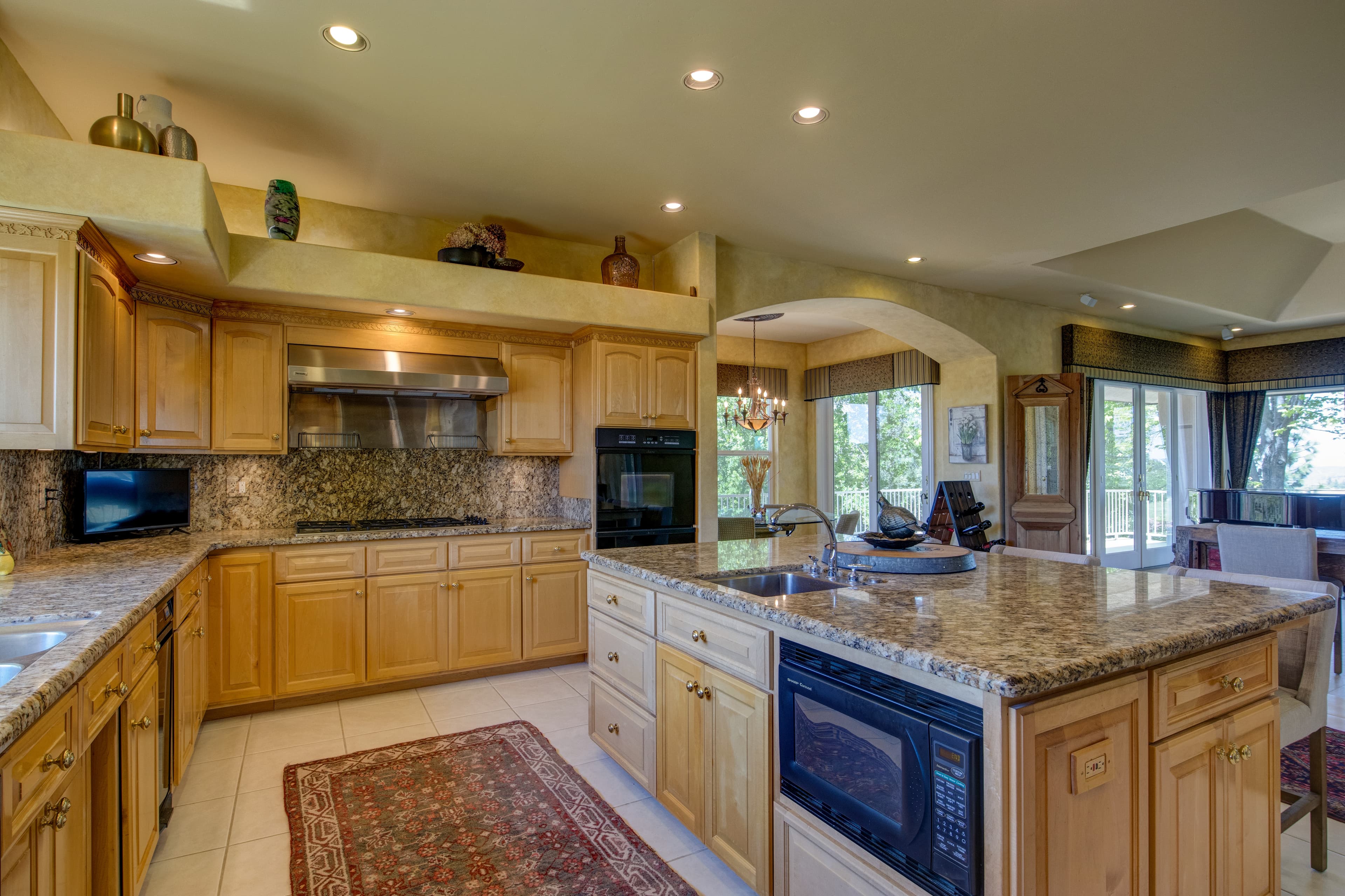 • Expansive kitchen w/granite counters and island; double ovens; microwave; 6 burner gas cooktop; warming oven; trash compactor