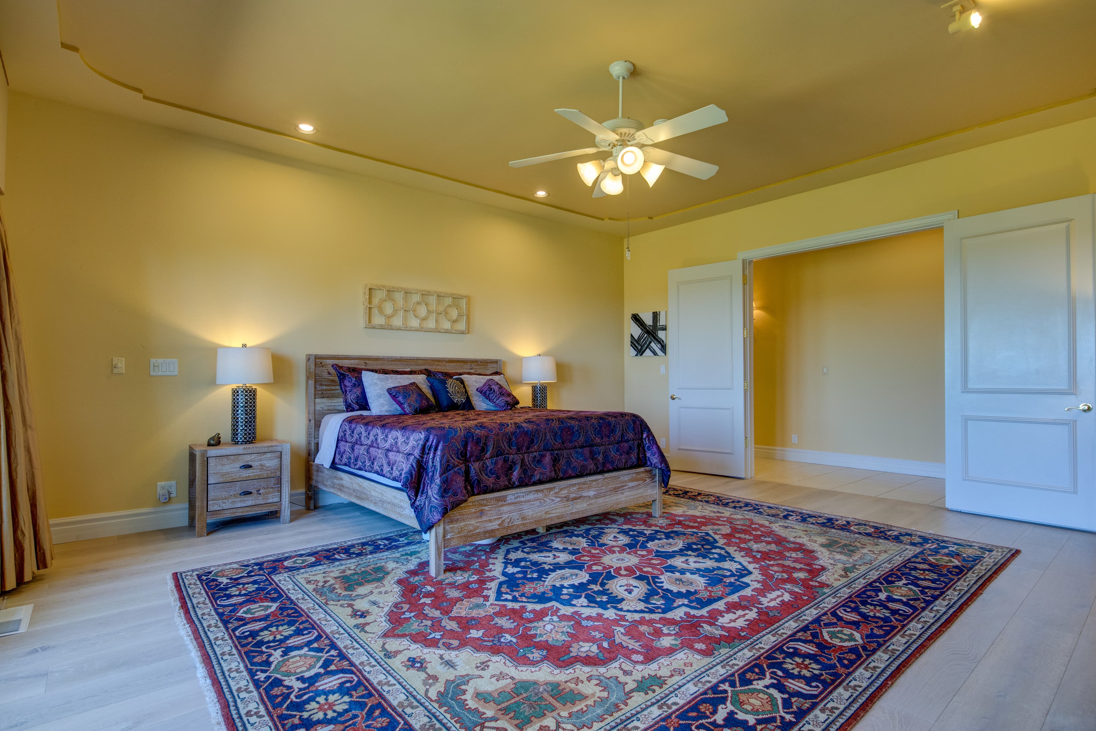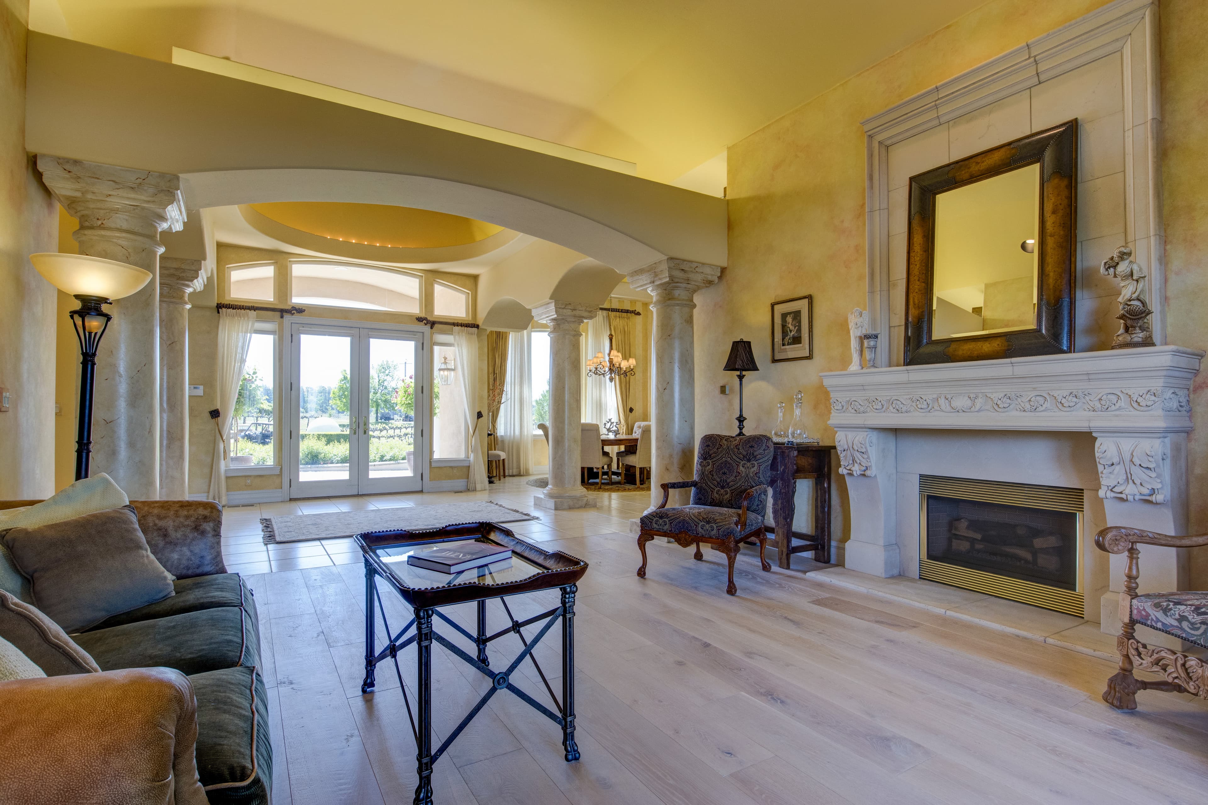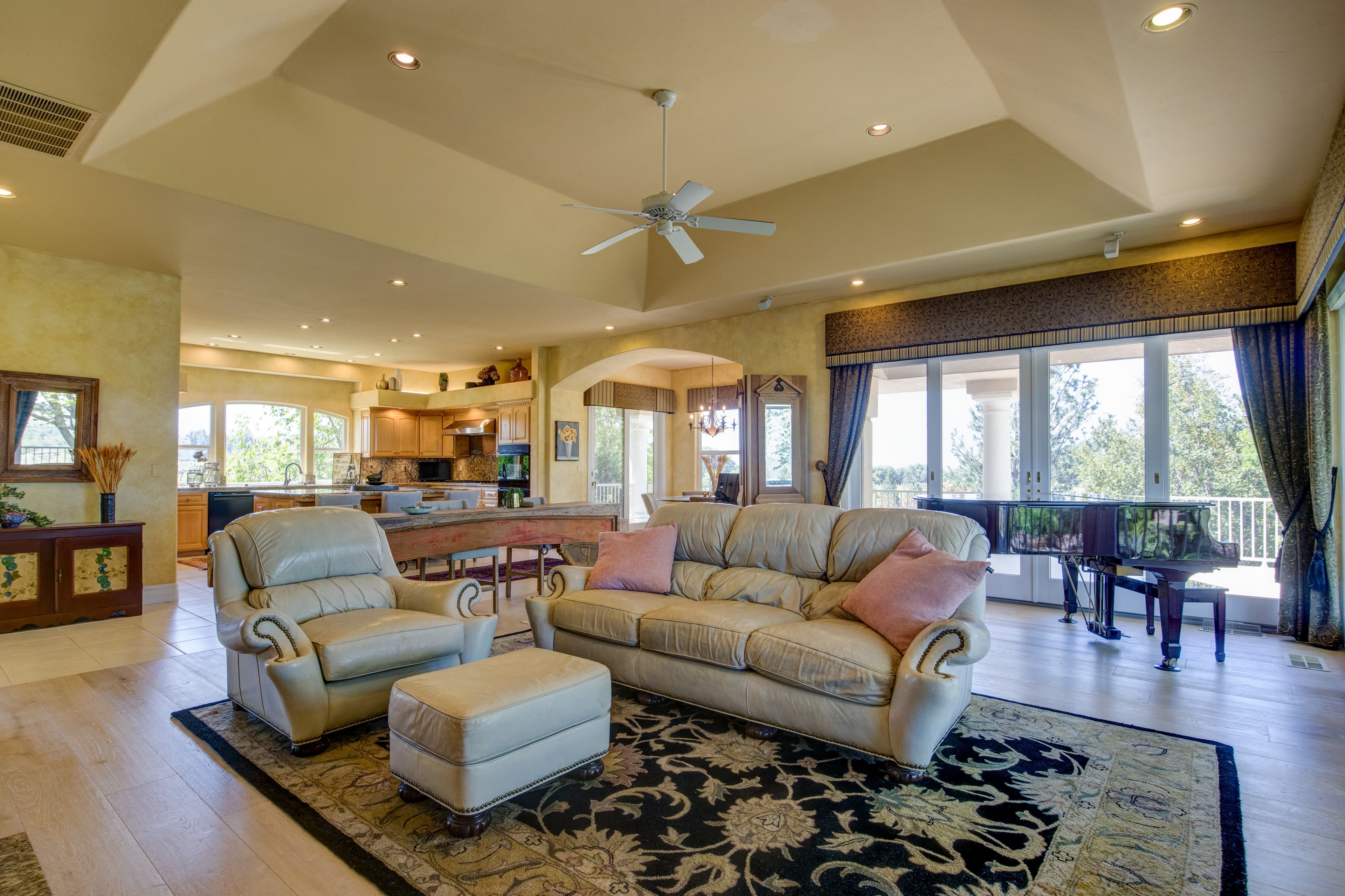 • Living Room with 14-foot vaulted ceilings, french doors that lead to Veranda, with expansive views.