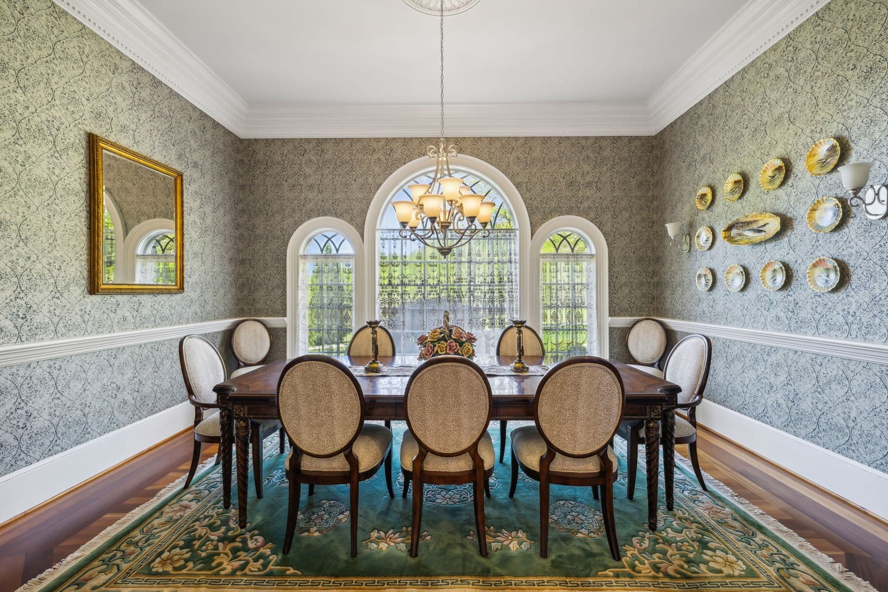 Dining Room: Features extensive molding, built-in cabinets, and new custom wallpaper.