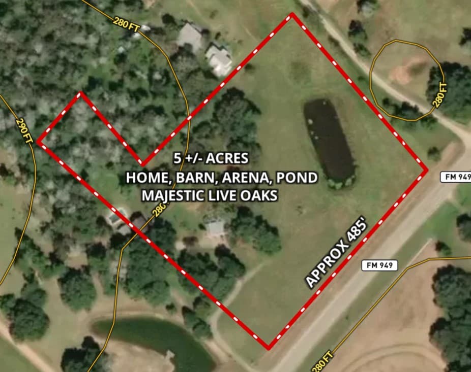 5 +/- Acres, Home, Barn, Riding Arena and Pond...Cat Spring area. This beautiful unrestricted tract has some of the prettiest Live Oak trees you’ll ever find. The circle driveway and parklike acreage is adorned with these majestic beauties. Property features sandy soils, slopping topography and approx. 485’ of frontage on FM 949. This is one of those tracts that’s just the right size for budgetary purposes but large enough for just about whatever you choose, residential or business. Improvements include pipe fencing & cross fencing, Pro Style lighted arena with deck, water to paddocks and arena, 4 stall barn with feed & tack area. The 4 bedroom 3 1/2 bath home had a recent update to the floorplan...open concept, Living, Dining and Kitchen area. New owners will have the opportunity to finish it out to their preference. Great setting for your family, pets and livestock...enjoy the country life minutes from Bellville, Sealy, Katy and Columbus. Approx. one hour to Houston & College Station!