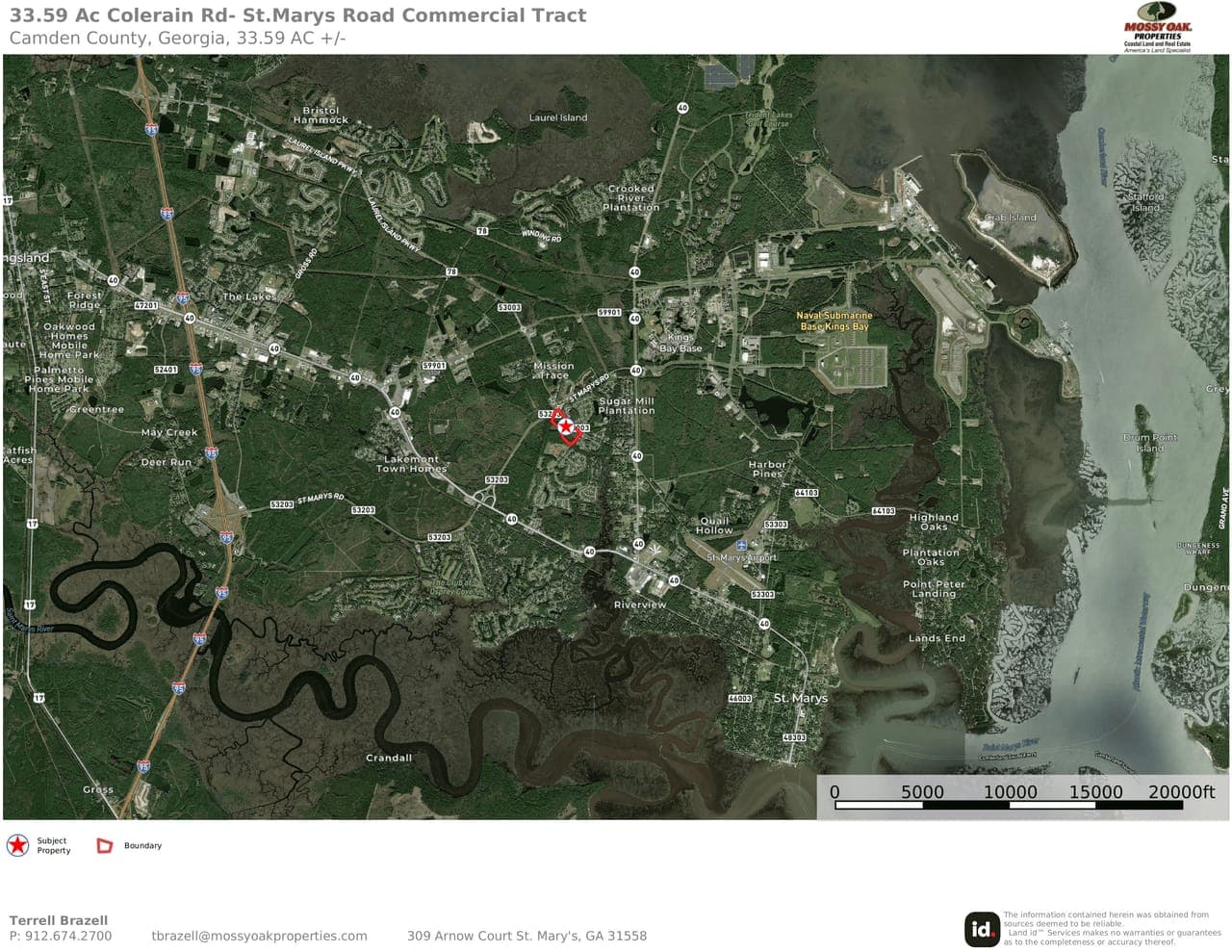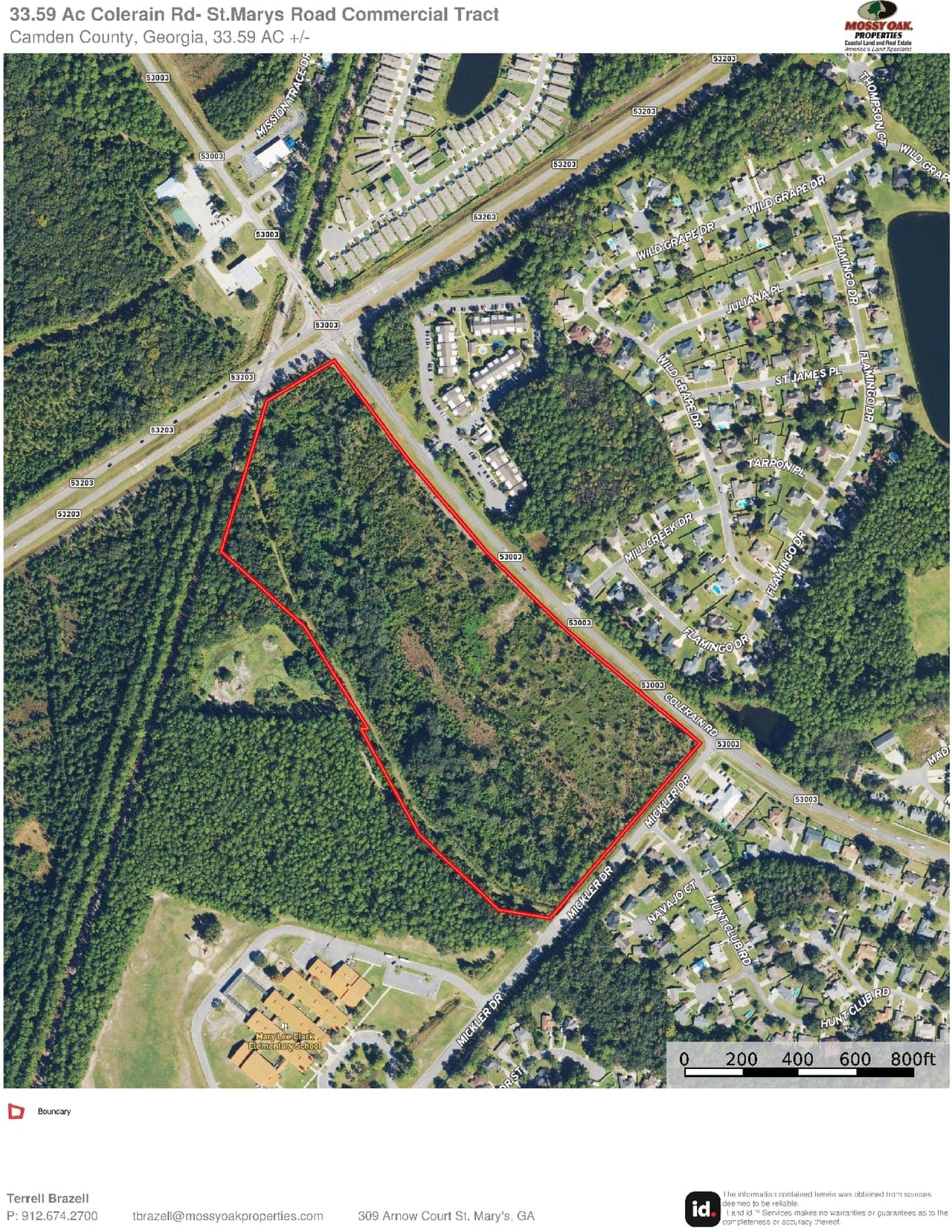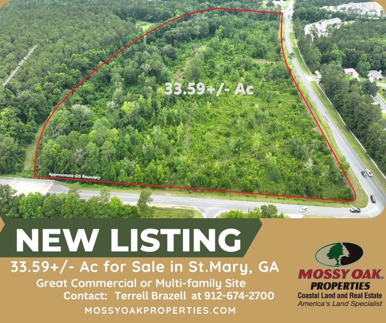 Rare Commercial/Multi-Family Opportunity in St. Marys, GA! 33.59-acre tract located in St. Marys, GA, presents an exceptional investment opportunity. Less than a mile from the main entrance to Naval Station Kings Bay, this property boasts an ideal location for a multi-family development, storage facility, or commercial venture. Featuring two major corners—one on Laurel Island Parkway and St. Marys Road, and another on Laurel Island Parkway and Mickler Drive—this parcel offers unparalleled visibility and accessibility. With over 2,900 feet of paved road frontage and access to water and sewer lines, this property is primed for development. Currently zoned C-2 in the city of St. Marys, the possibilities are endless. Don't miss out—contact Terrell Brazell with Mossy Oak Properties today at 912-674-2700 or for more information on this property or others like it!
