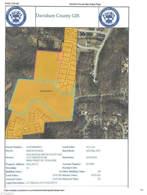 list agent has ownership in property Pins 6890140781/6890141906/1630200000067/1630100000033/1630100000033E being sold together (2 MLS numbers) Same family owns all properties and selling together. TV on 1751 Country Club only About 39 acres subject to survey. Some in Guilford Co, some Davidson Co. All City of High Point. List price includes MLS # 1134859