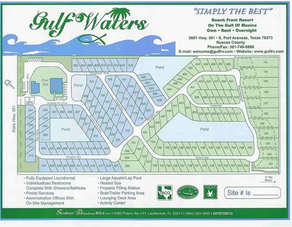 Own a slice of paradise in the premier Gulf Waters Beach Front RV Resort! This site offers a fantastic location just behind the dunes and steps to the beach boardwalk. Resort amenities include a large, heated swimming pool and jacuzzi spa, on site laundry facilities, restrooms with private showers, an activity center/clubhouse and a cart accessible boardwalk over the dunes to the beach and on into Port A. The lot has palm trees and an owner's storage shed and is currently a rental space with Gulf Waters. This is the only RV park of it's kind on Mustang Island. Enjoy island time with family and friends, rent the space when not in use and offset expenses of ownership. Gulf Waters retains 25% of gross income for handling rentals. Site 743 is a "back in site", not restricted to RV's.