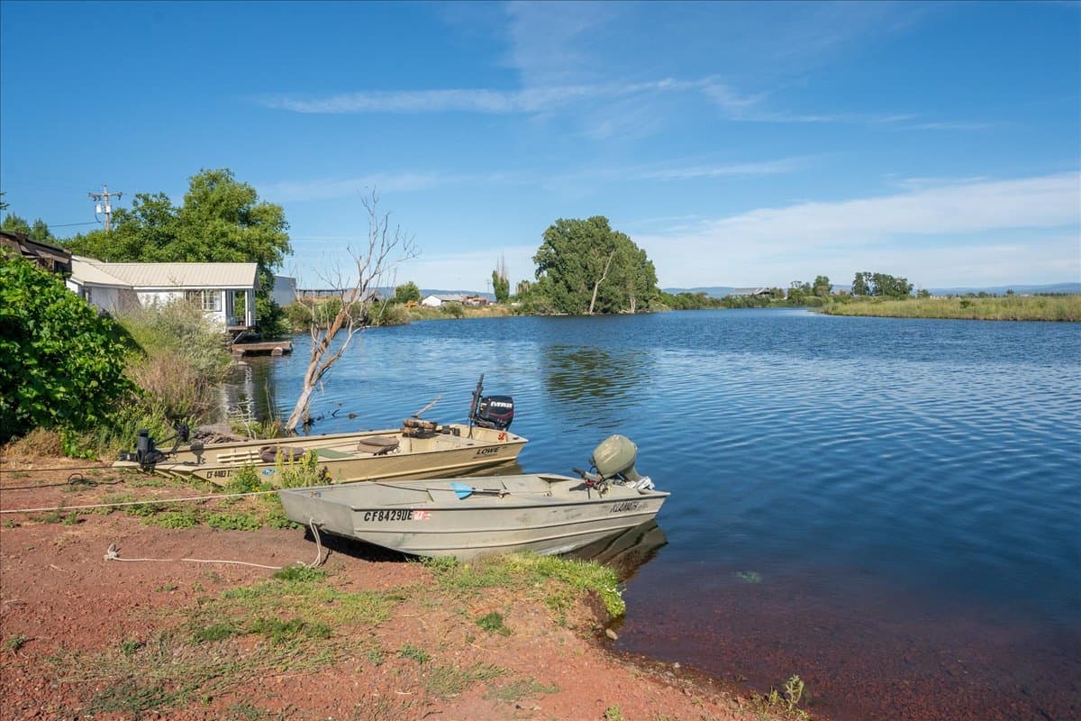The Bar 13 Ranch’s 290 acres comprise leveled irrigated farmland, pastures, corrals, barns, and a two-bedroom, two-bath riverfront home with a deck and boat dock.