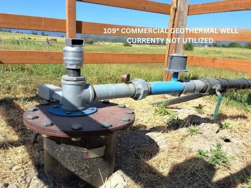 The geothermal well is commercial-sized, with 108-110 degree water flowing from a 12″ casing at 60 GPM. The well is 200′ deep and was initially designed for commercial use.