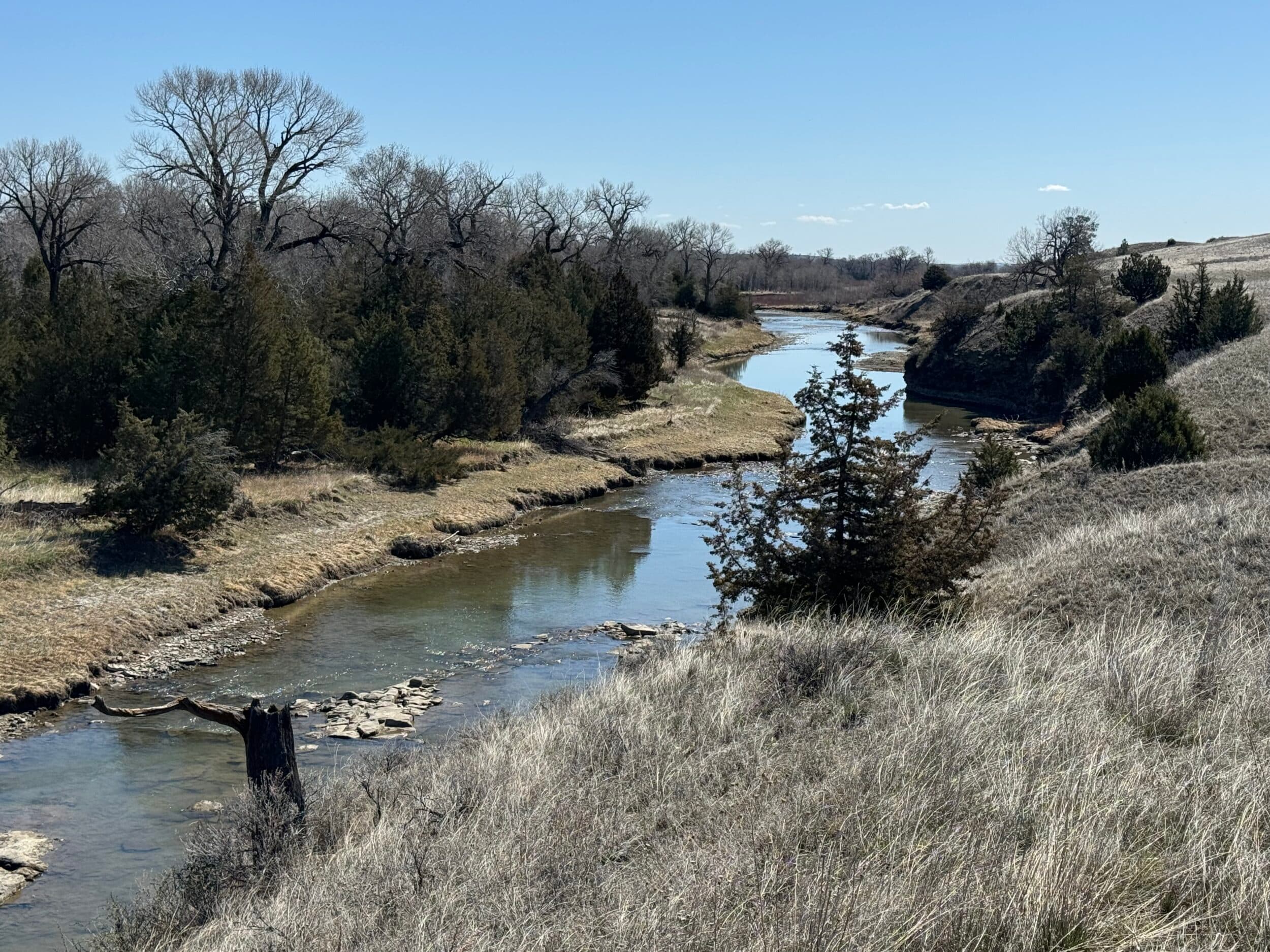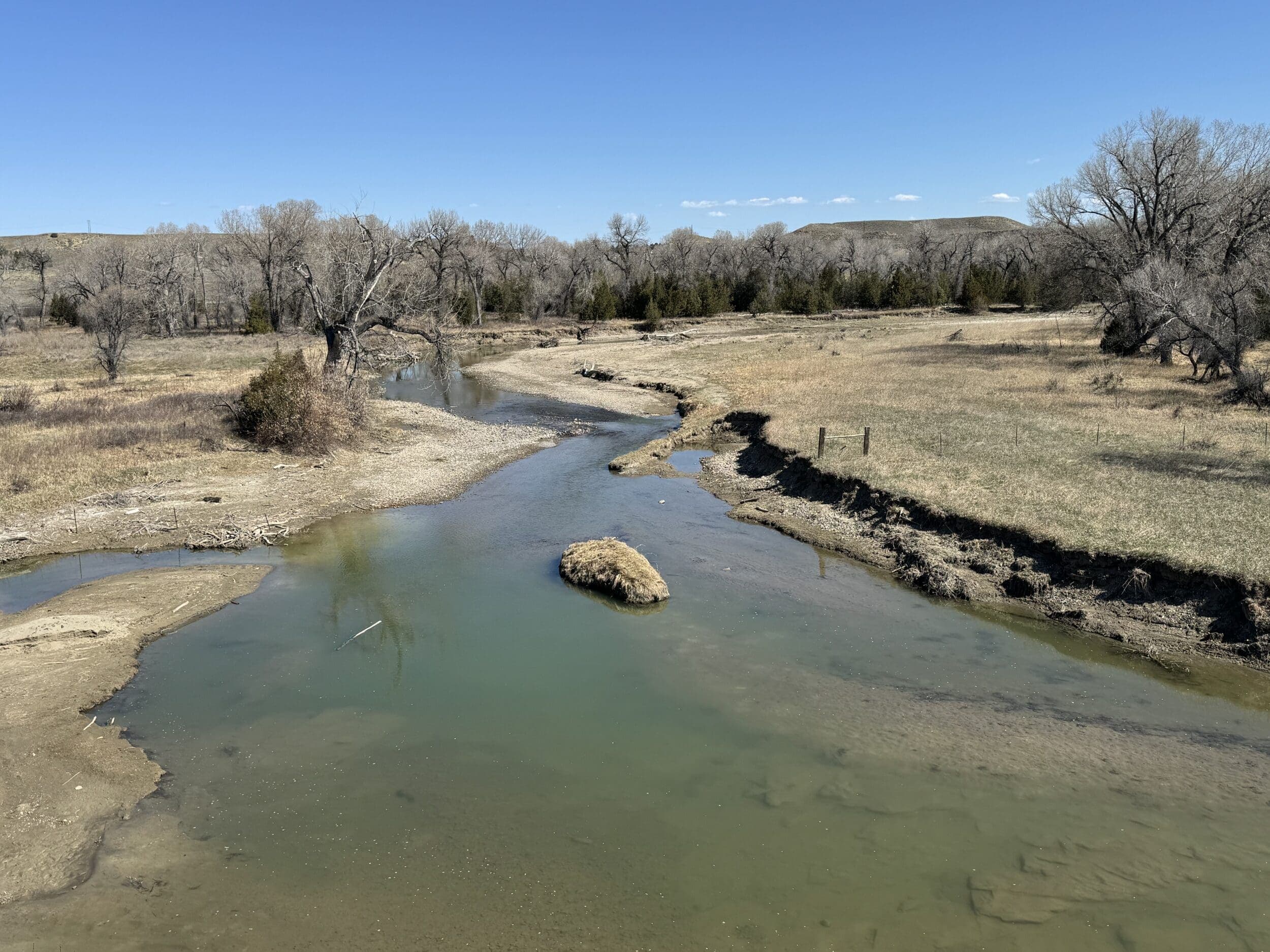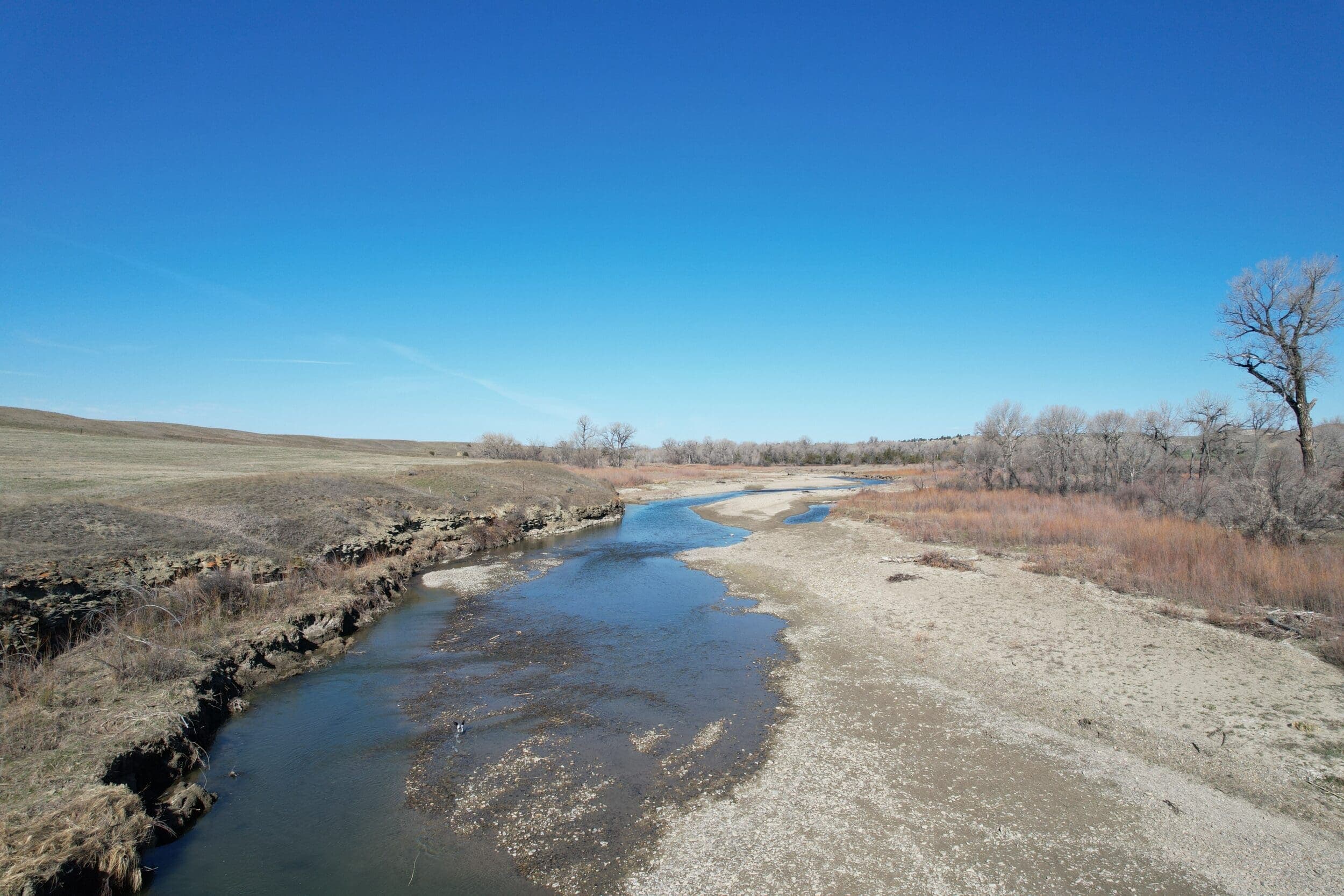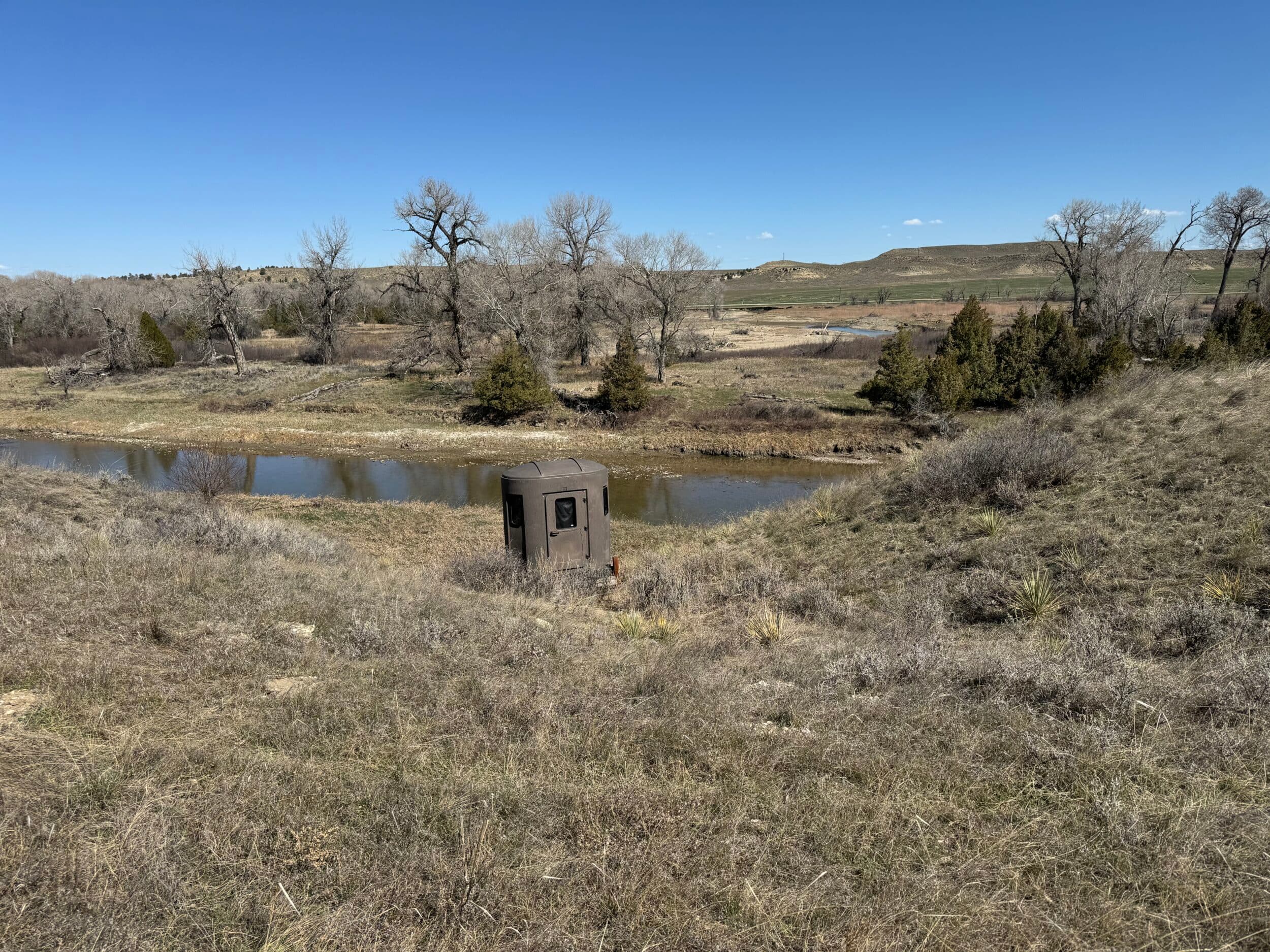 The mule deer, whitetail, and elk benefit from the wildlife management practices the owners have put in place. The Musselshell River has always been home to awesome whitetail and turkey hunting. The timber draws open itself up to elk hunting on the Table Rock Ranch. The one room solar powered dry cabin up at the south end of the ranch allows for overnight stay so one can be ready for the elk coming off of the food plots heading towards the spring tank for water and then returning back to the timber for the day.