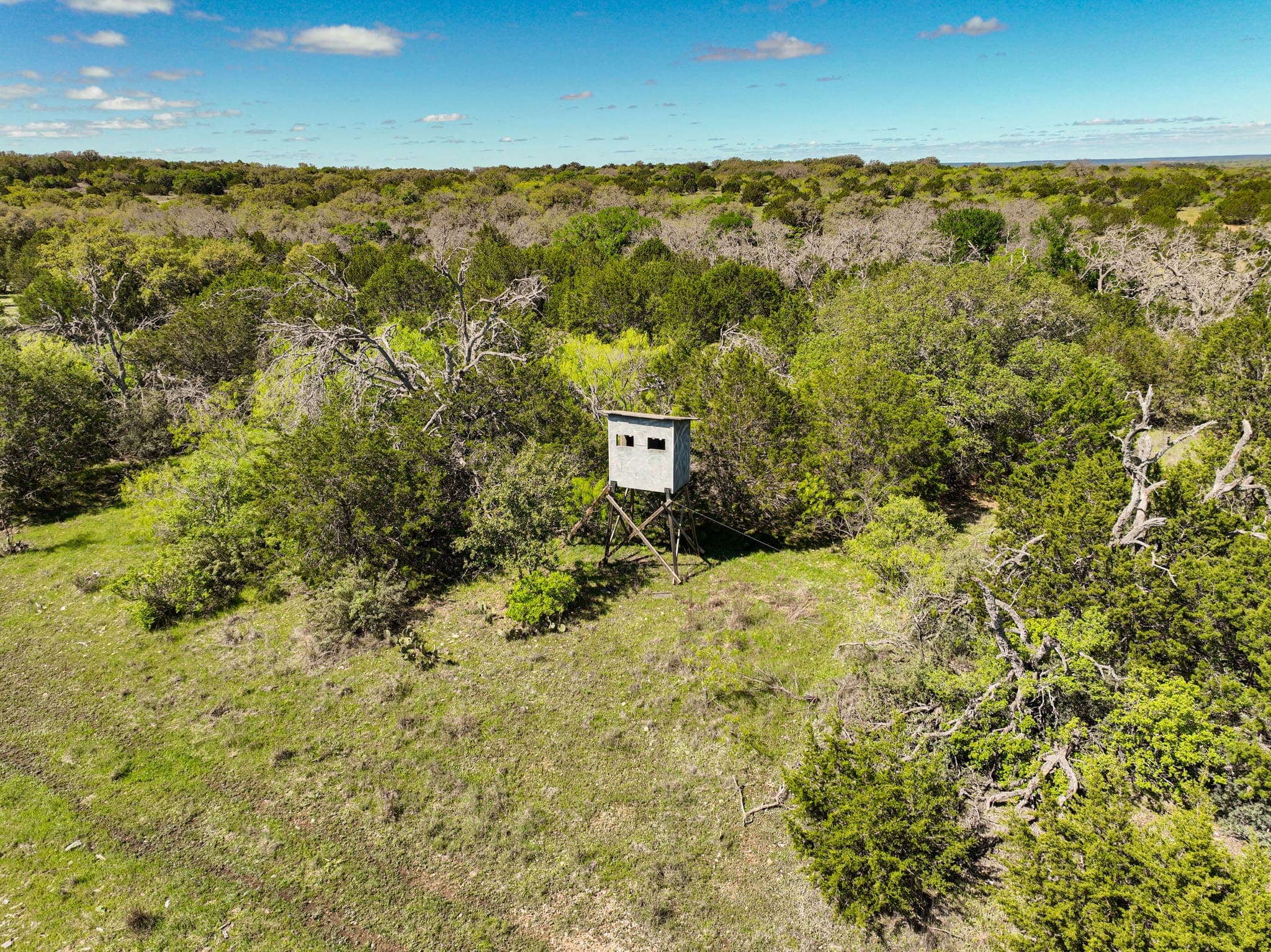 The high-fenced ranch offers multiple game species, including whitetail deer, turkeys, pigs, jackrabbits and popular Texas hill country exotics such as axis, blackbuck, fallow, red deer, aoudad and white-bearded gnu. Enjoy terrain that features elevation changes of more than 200 feet, providing varying views of the ranch’s 2,275 acres and multiple sites for an additional home or cabin amid the live oak, post oak, walnut, pecan, elm, mesquite and cedar trees. Native vegetation includes yucca, prickly pear cactus, desert spoon and, in spring, renowned Texas Hill Country wildflowers, including iconic bluebonnets.