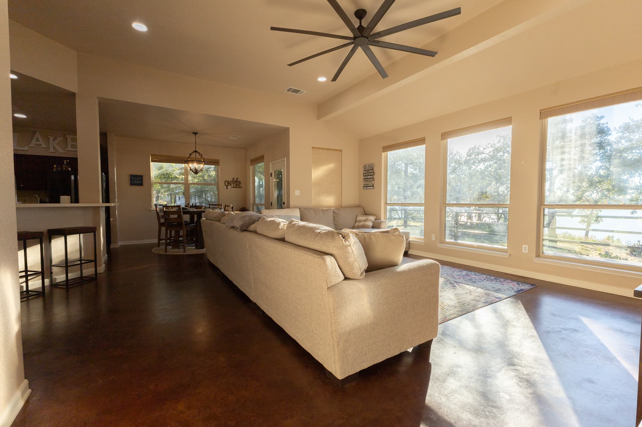 Inside, the home features an open-concept design with vaulted ceilings, large custom windows showcasing stunning lake views, and stained concrete floors for low-maintenance living. The spacious kitchen is a chef’s dream with custom cabinetry, pantry, island, eat-in bar, gas cooktop, refrigerator, microwave, wine cooler, and new granite countertops being installed in the kitchen and living areas.