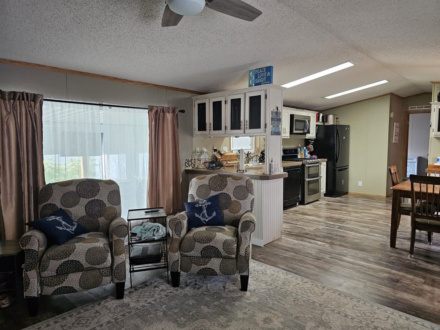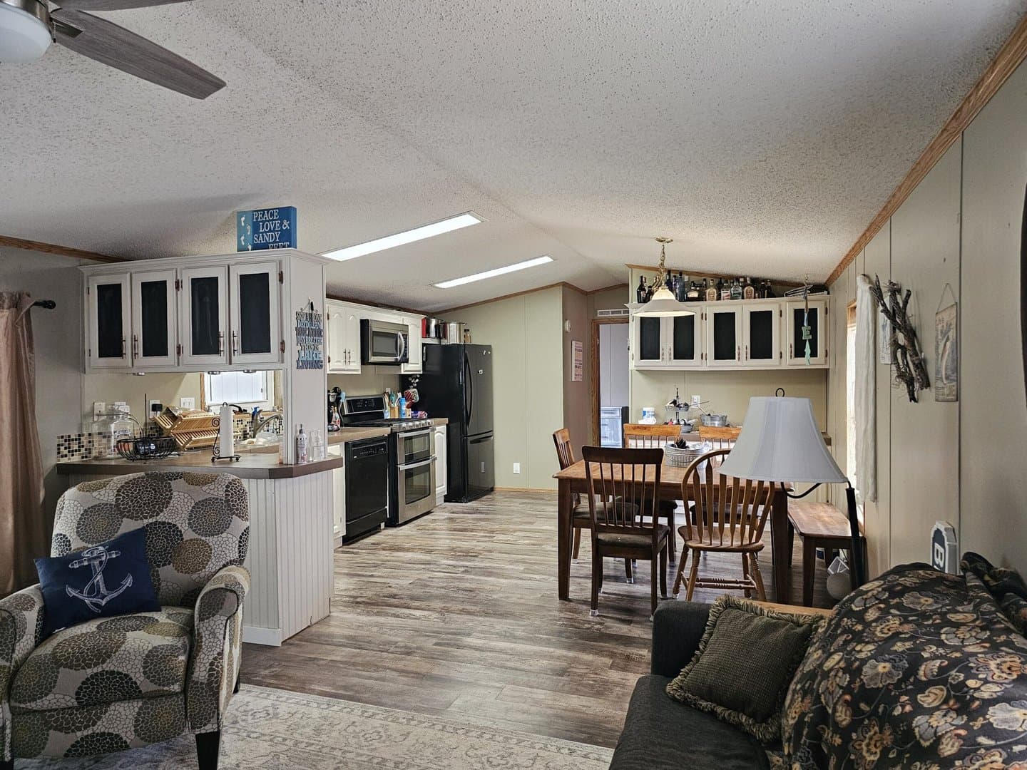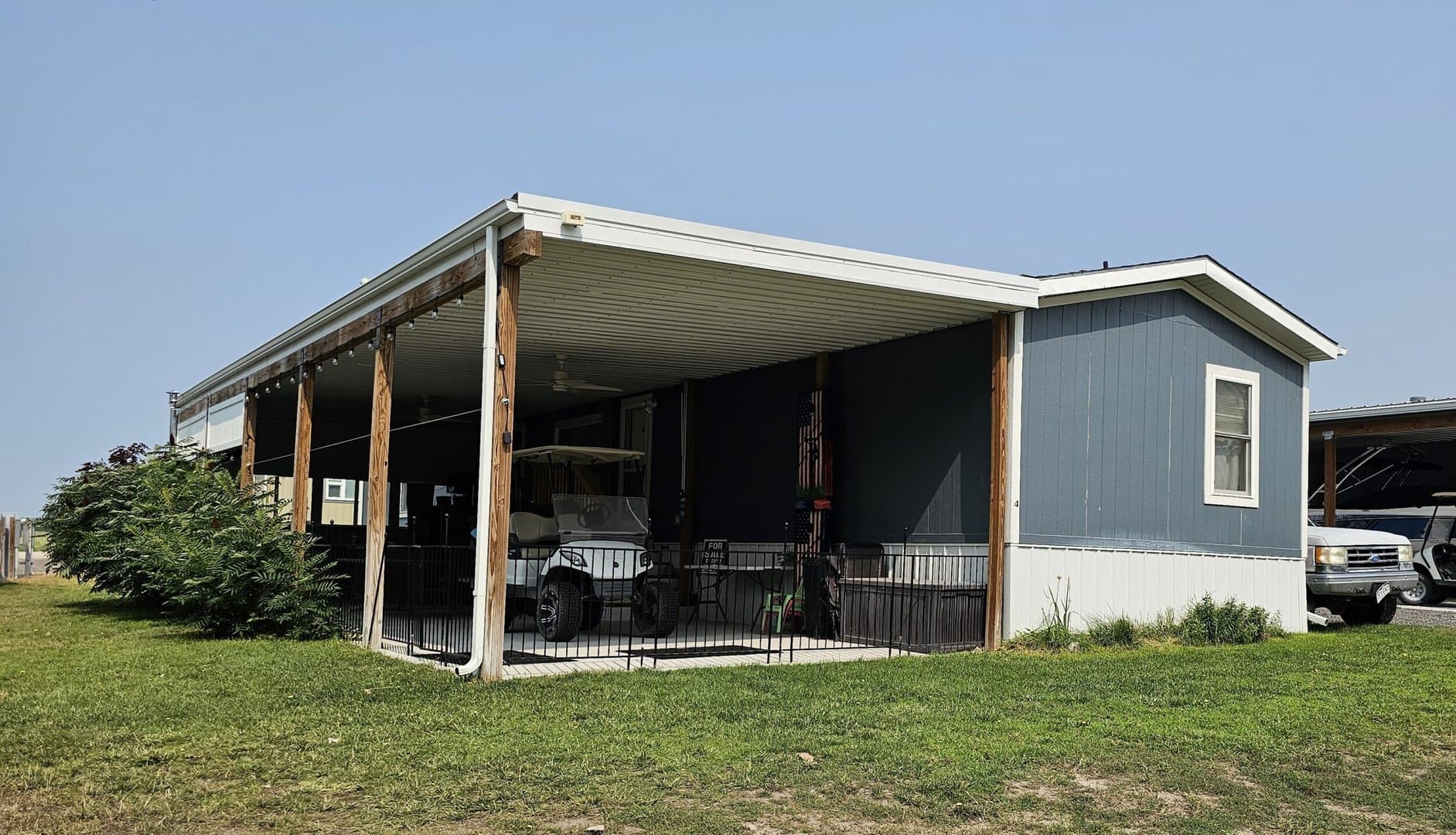 Updated in 1997, this 16x76, 3-bedroom, 2-bath, furnished mobile home has an amazing 16x50 covered fenced patio with an outside kitchen and entertainment area with a TV and ceiling fans. Entertain family and friends inside the home with a spacious kitchen with refrigerator, gas cook stove with double oven, microwave, and dishwasher. Easy-care waterproof vinyl plank flooring in the living room, kitchen, and master bedroom. $1500 yr. lot lease.