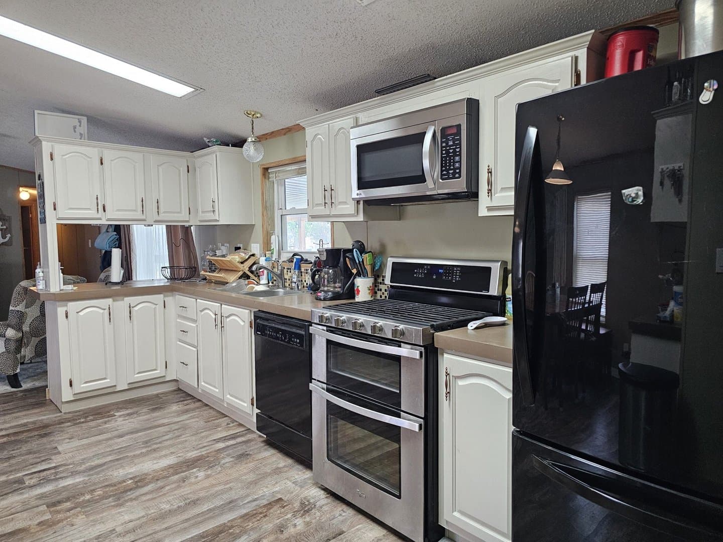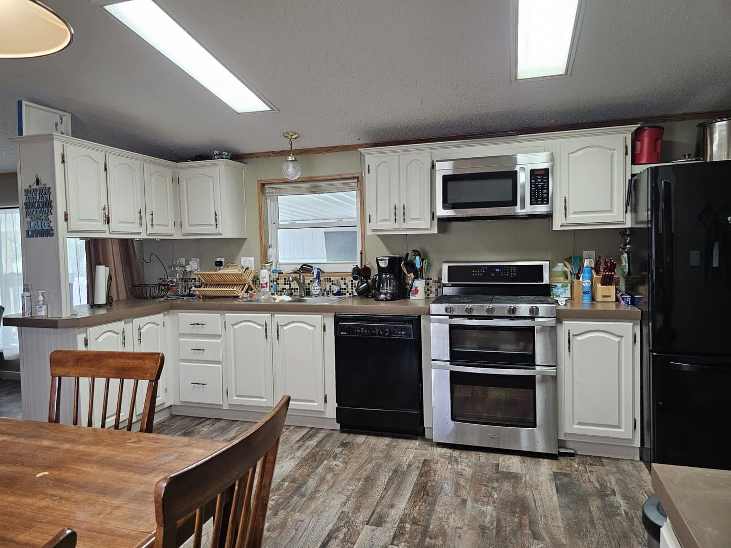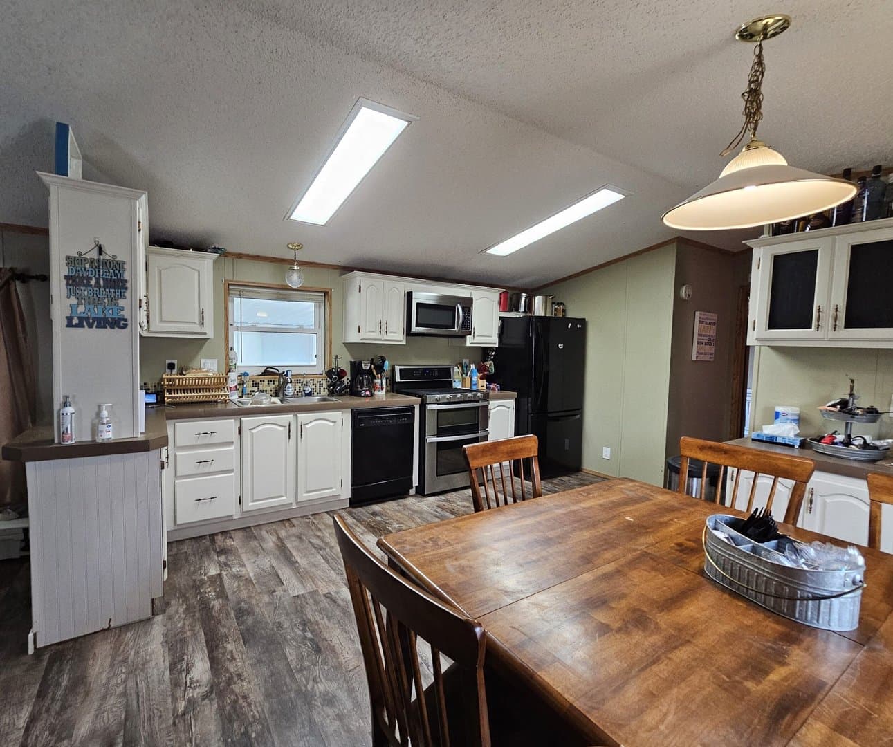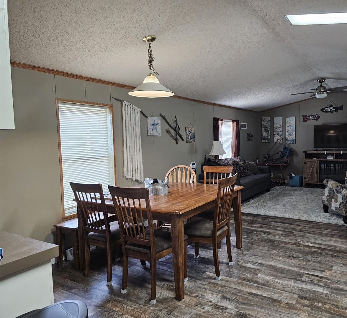 Updated in 1997, this 16x76, 3-bedroom, 2-bath, furnished mobile home has an amazing 16x50 covered fenced patio with an outside kitchen and entertainment area with a TV and ceiling fans. Entertain family and friends inside the home with a spacious kitchen with refrigerator, gas cook stove with double oven, microwave, and dishwasher. Easy-care waterproof vinyl plank flooring in the living room, kitchen, and master bedroom. $1500 yr. lot lease.