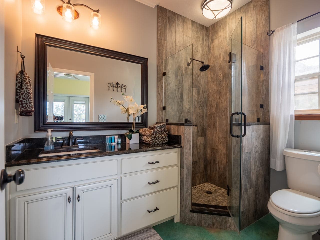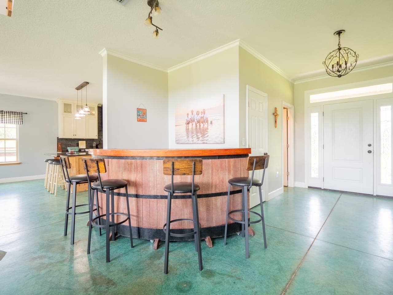 Inside, you’ll find a spacious 4-bedroom, 3.5-bathroom layout with soaring vaulted cypress ceilings, a striking stone fireplace, and an abundance of natural light pouring in from the floor-to-ceiling windows overlooking a tranquil pond and rolling pasture.