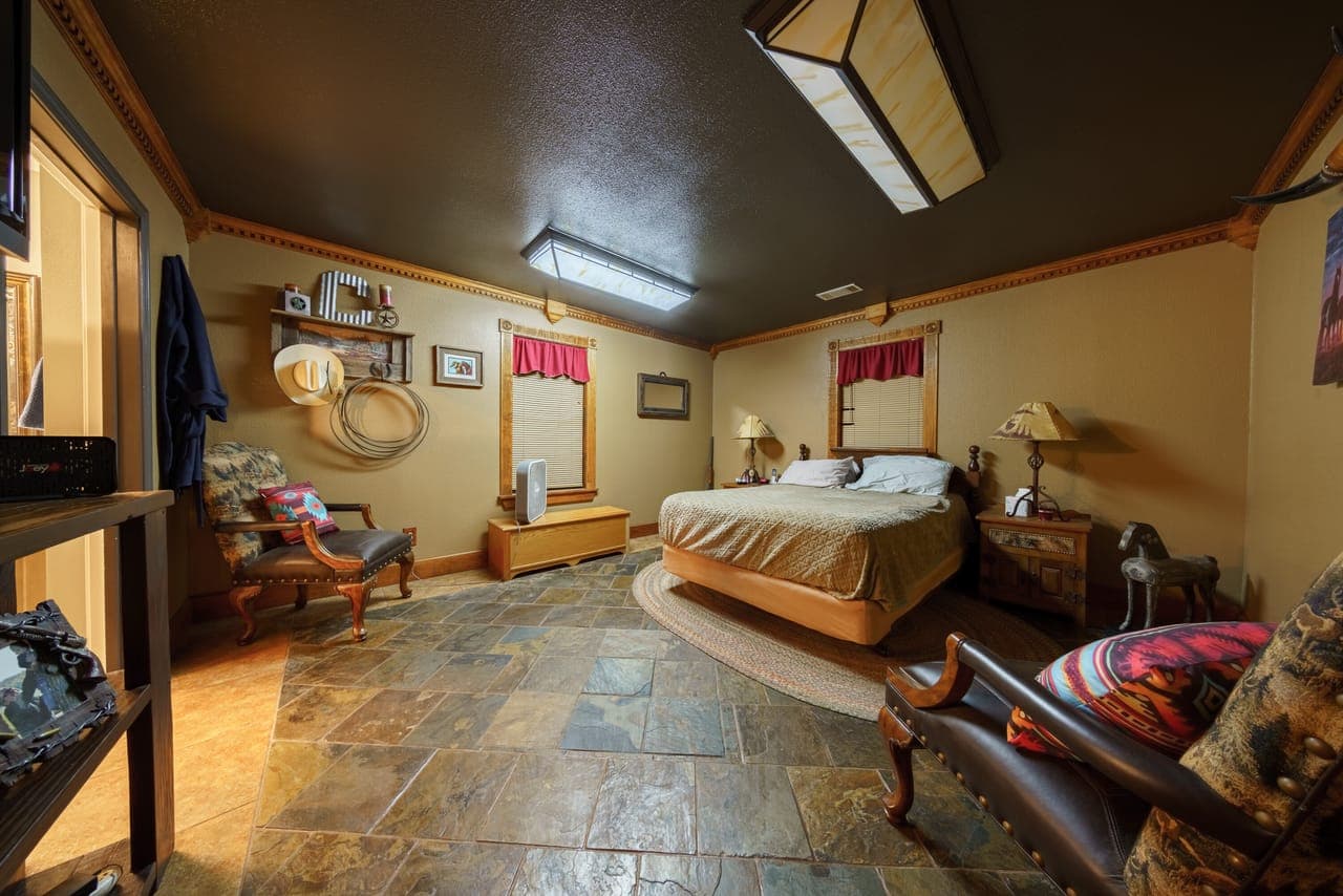 The living room impresses with high ceilings and rich-stained wood accents, creating a warm, inviting atmosphere. The adorable kitchen is well-designed, featuring a natural rock accent wall that adds character, complemented by custom solid oak cabinets, a matching solid oak pantry, and beautiful countertops.