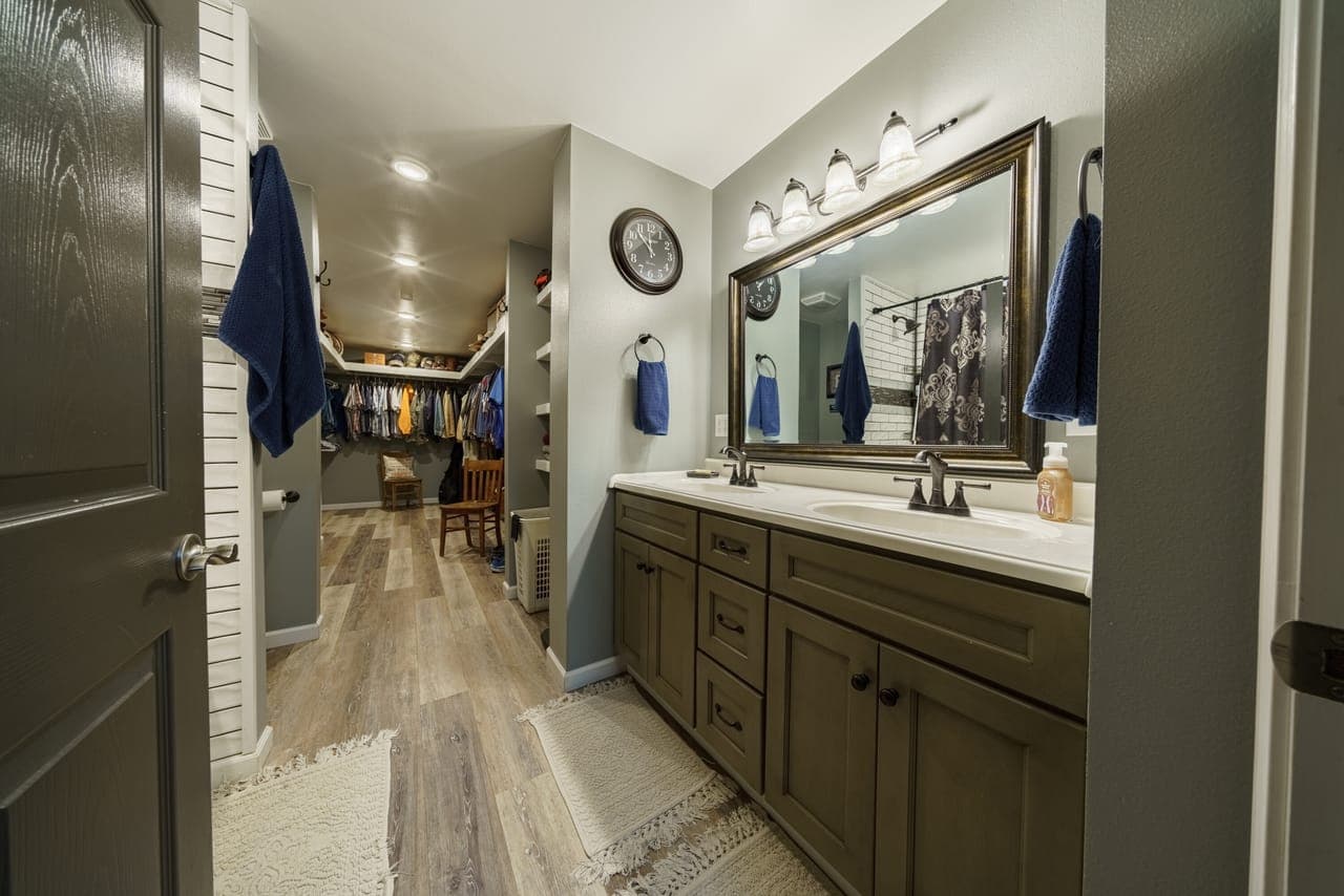 Off the living room, you'll find a toilet and sink on one side and a separate shower and sink on the other, providing convenience before entering the primary suite. The spacious primary bedroom boasts its own luxurious bathroom, complete with an air-jetted tub and shower combo, double vanity, and an oversized walk-in closet.