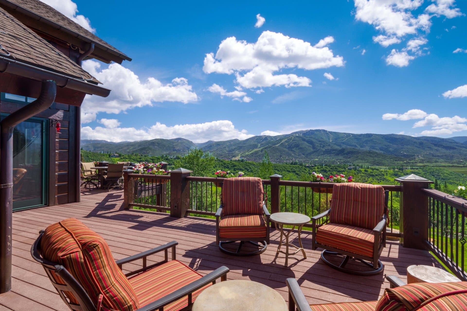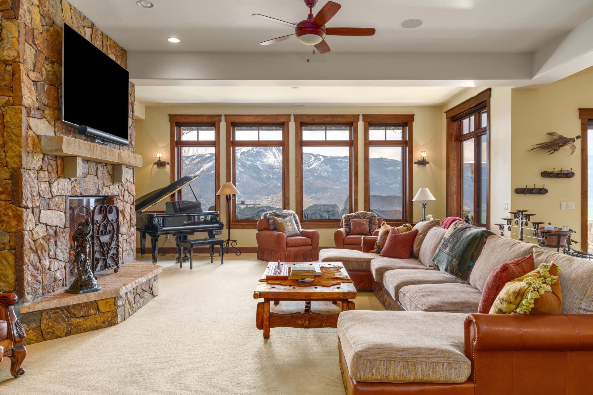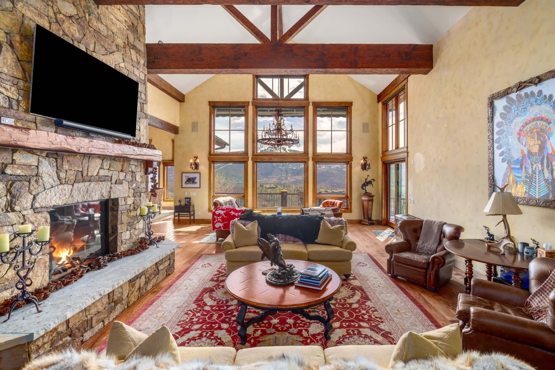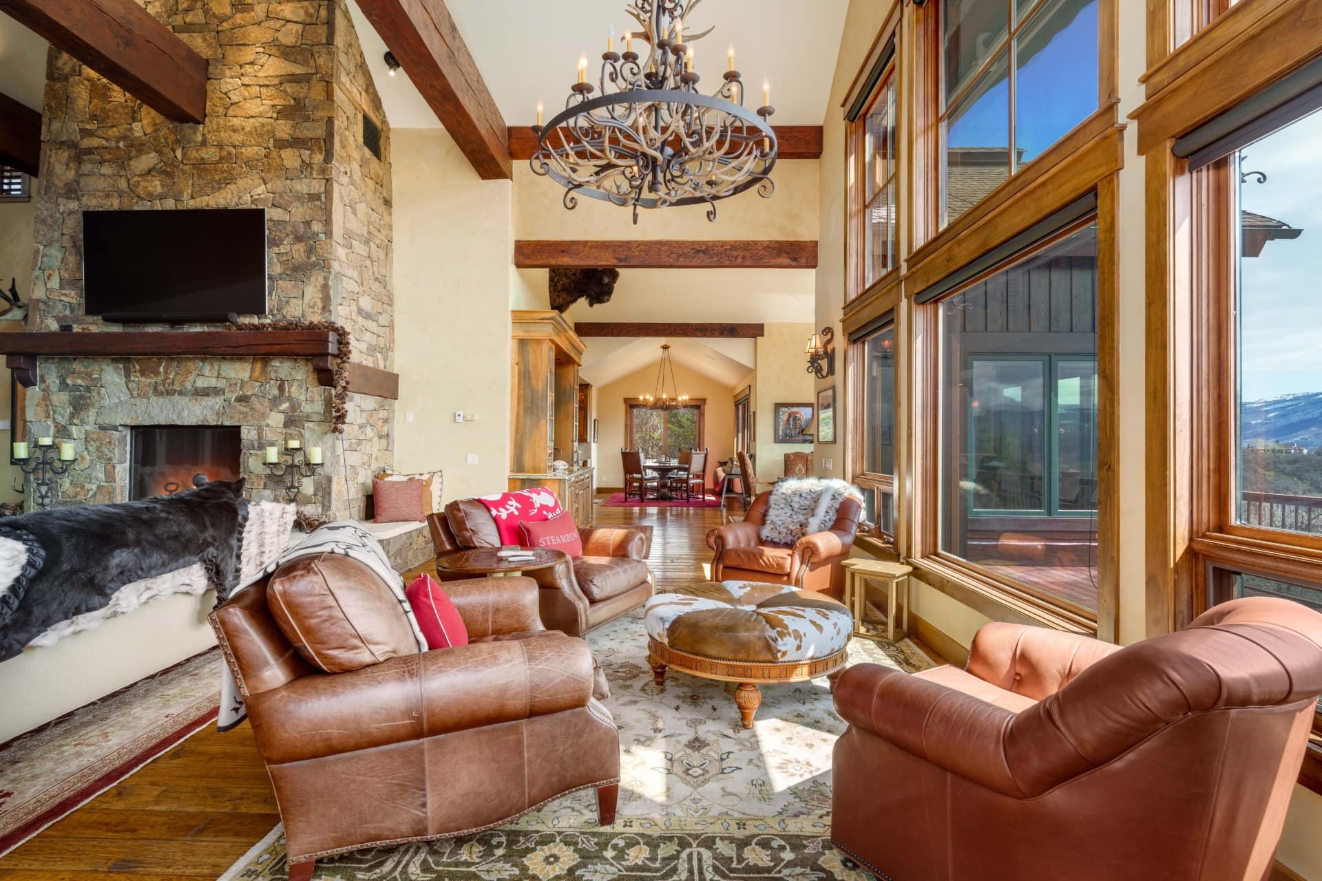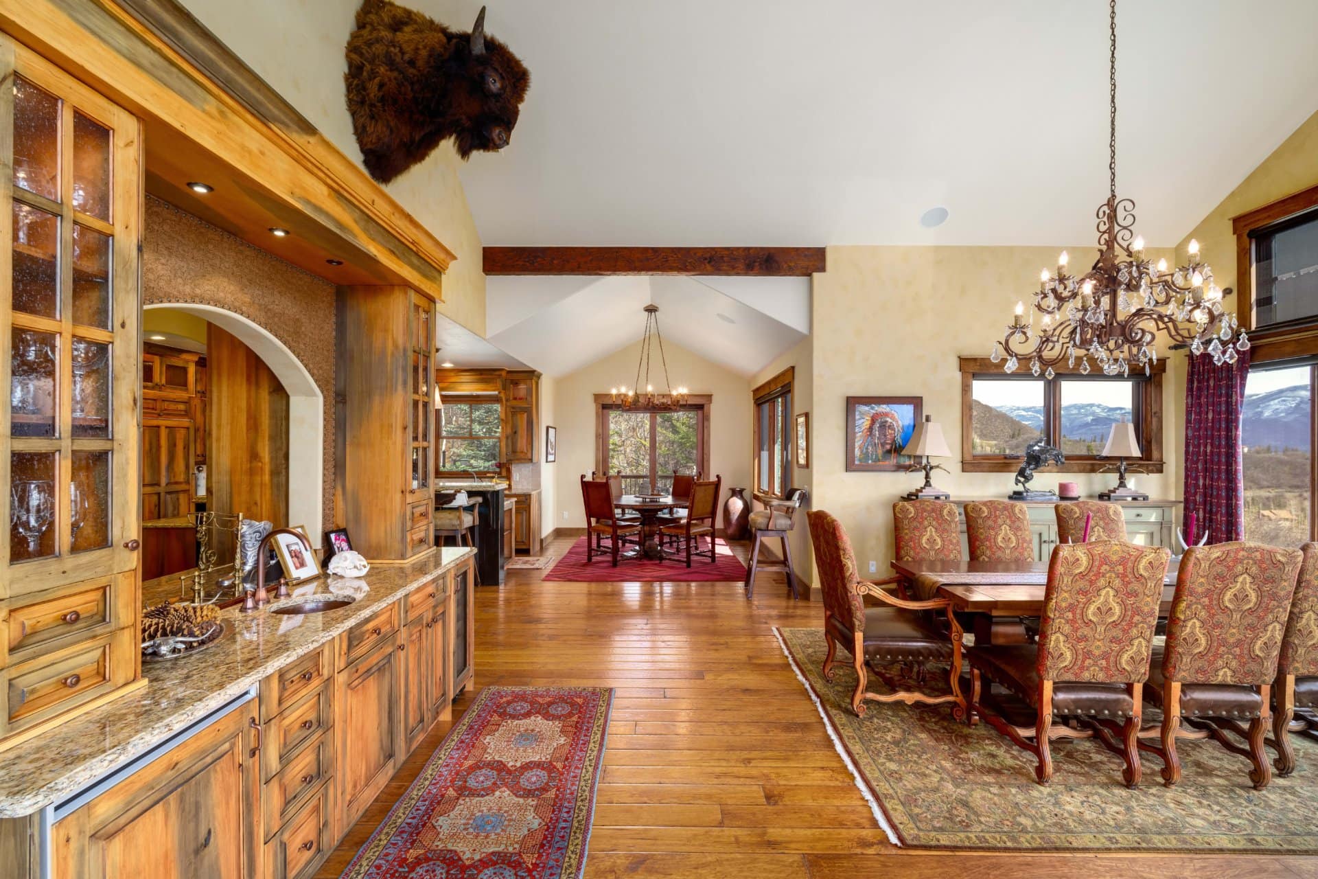 Upon entering the home, the great room welcomes you with cathedral ceilings, rough-hewn timber beams, a magnificent floor-to-ceiling custom rock fireplace, hand-scraped pecan floors, and large bay windows bathing the interior space in natural light. A gourmet kitchen with SubZero and Dacor appliances, custom cabinetry, a large breakfast area, a butler’s pantry, and just off the kitchen is a private deck for grilling. The dining room includes vaulted ceilings and picture-framed views of Steamboat Ski Mountain.
