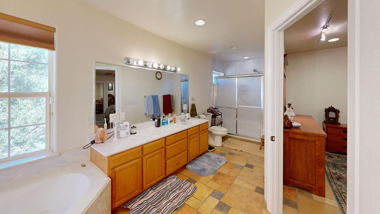 Bathroom: Features 2 showers, a garden tub, and a spacious walk-thru closet