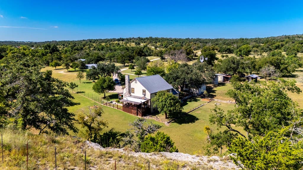 Welcome to your private oasis in the heart of the Texas Hill County. Live water and this peaceful 80 acre, ag exempt ranch, provides an unparalleled blend of tranquailty and natural beauty. Whether you envision it as a family home or weekend getaway, this property offers versatility to suit your dreams. Steps from your home, a picturesque spring fed creek nestled at the bottom of a bluff allows for swimming, wading, and relaxation watching the many species of wildlife coming in for a drink. 3 wells, 2 windmills, pasture stock tank, hay barn, livestock barn with feed room, loading chutes, pens and storage. High fenced garden with shed, chicken run with coop, deer blinds and feeders. The spacious home features an eat in country kitchen, inviting living area with fireplace for those chilly evenings, primary bedroom suite and large laundry room that leads to a cellar for your sundries and favorite wine. Upstairs offers 2 bedrooms and a full bath, expansive bonus room and a personal office. 1 Bedroom, 1 bath guest cabin is perfect for your weekend visitors or added revenue as a Bed and Breafast. Minutes from Fredericksburg and Kerrville this slice of Heaven awaits you.