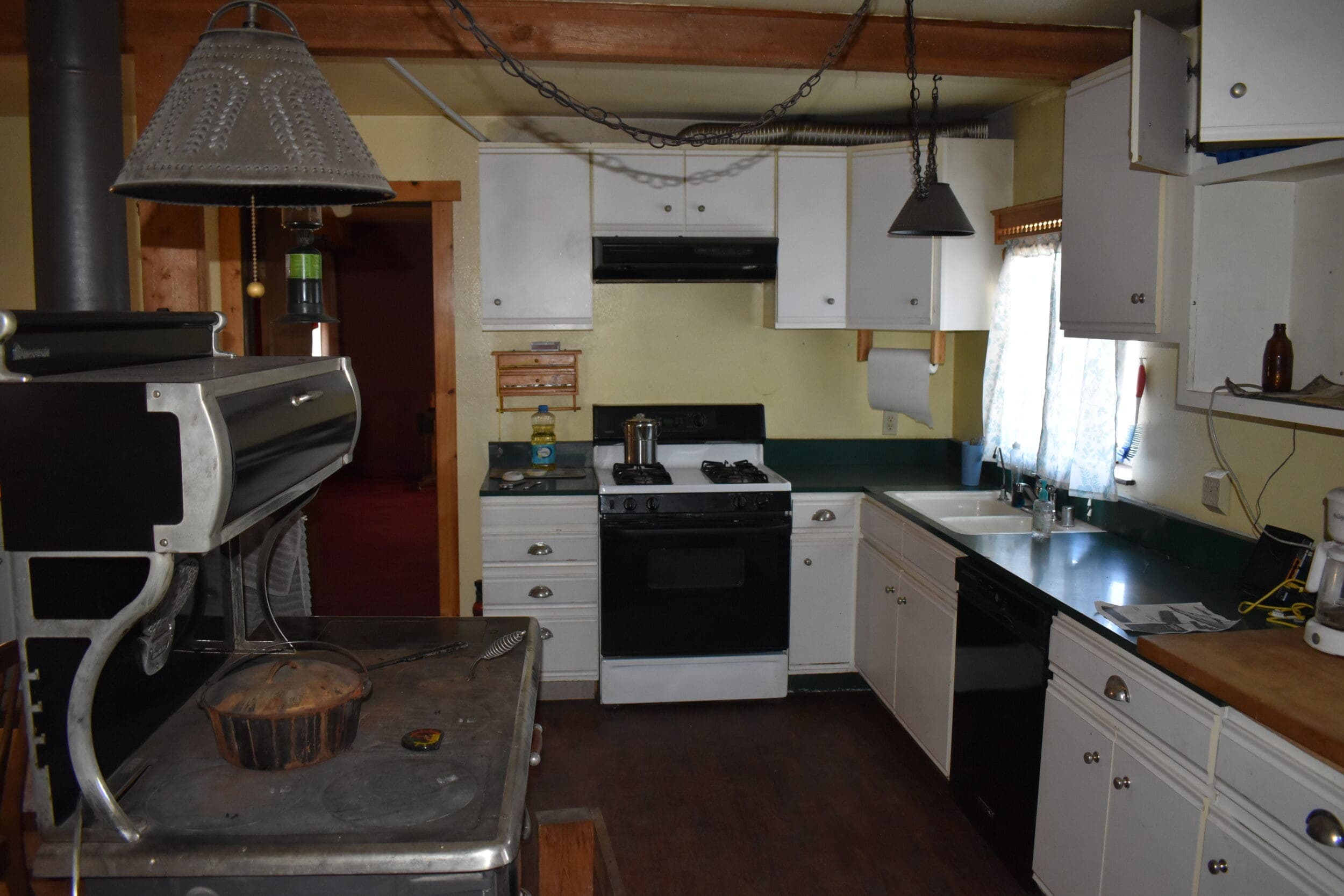 Main Home: 2,260 sq ft, built in 1995, 3 bedrooms, 1 bathroom. The large kitchen with a wood-burning stove is a great touch, especially for off-grid living.