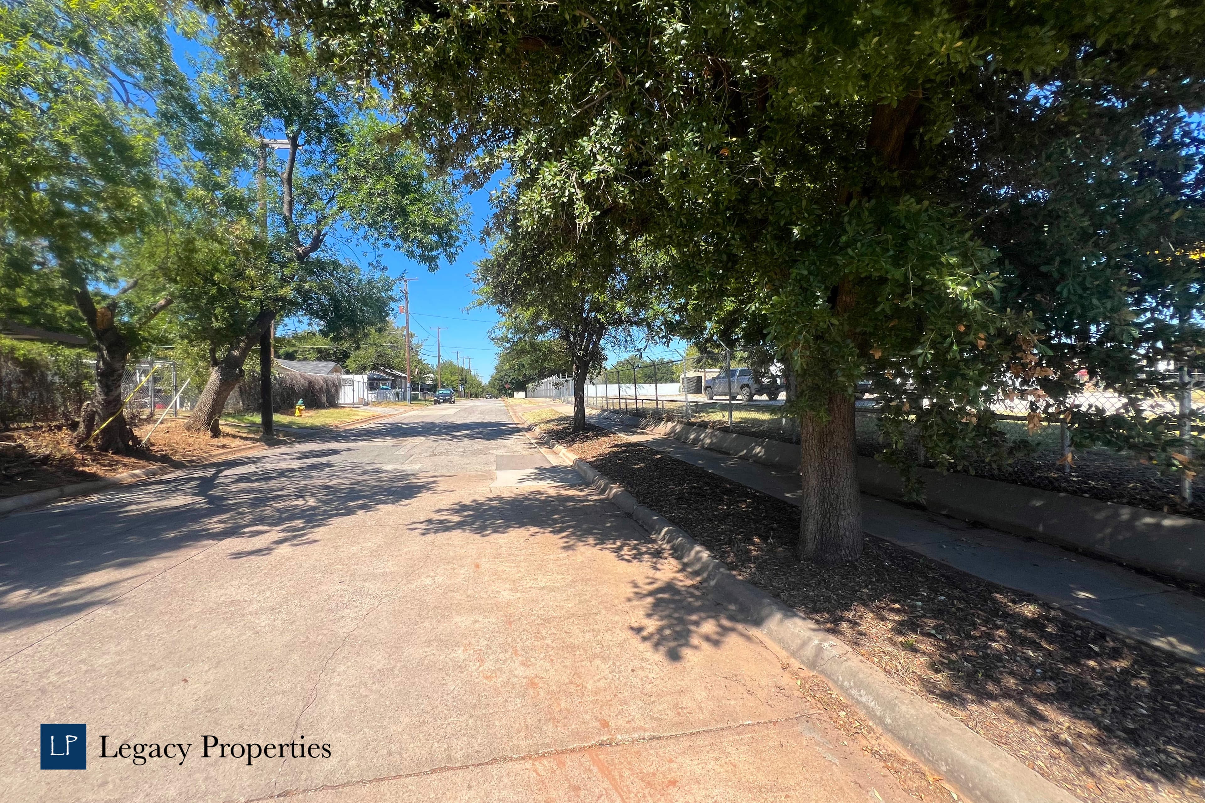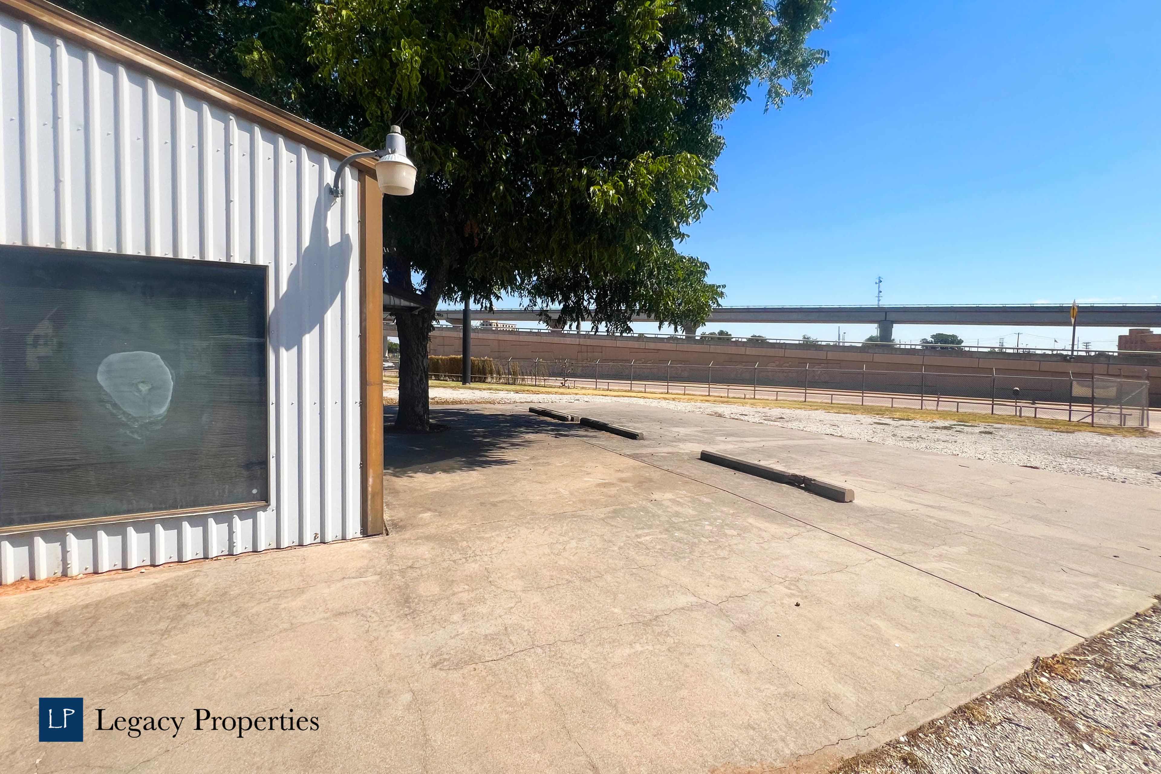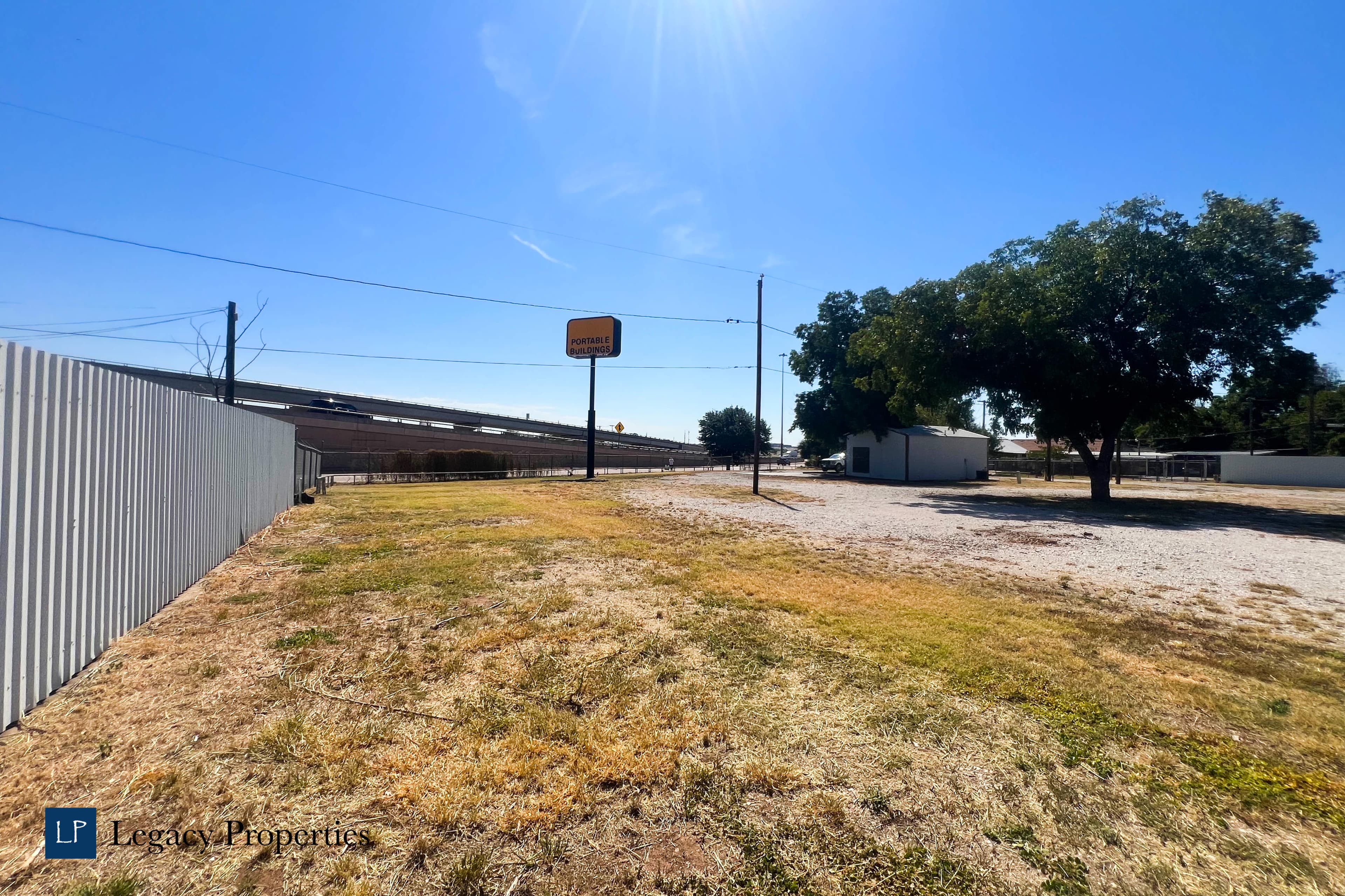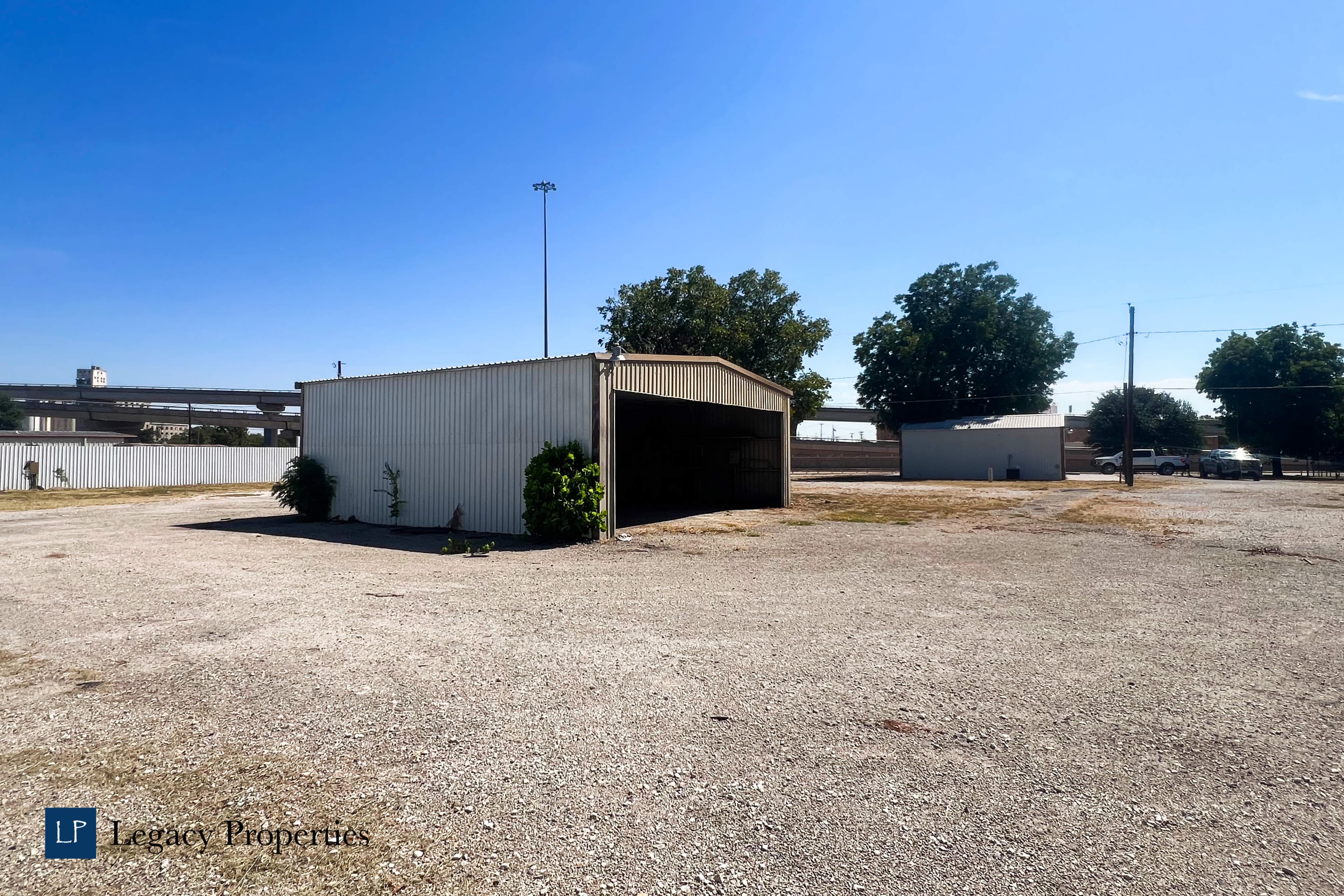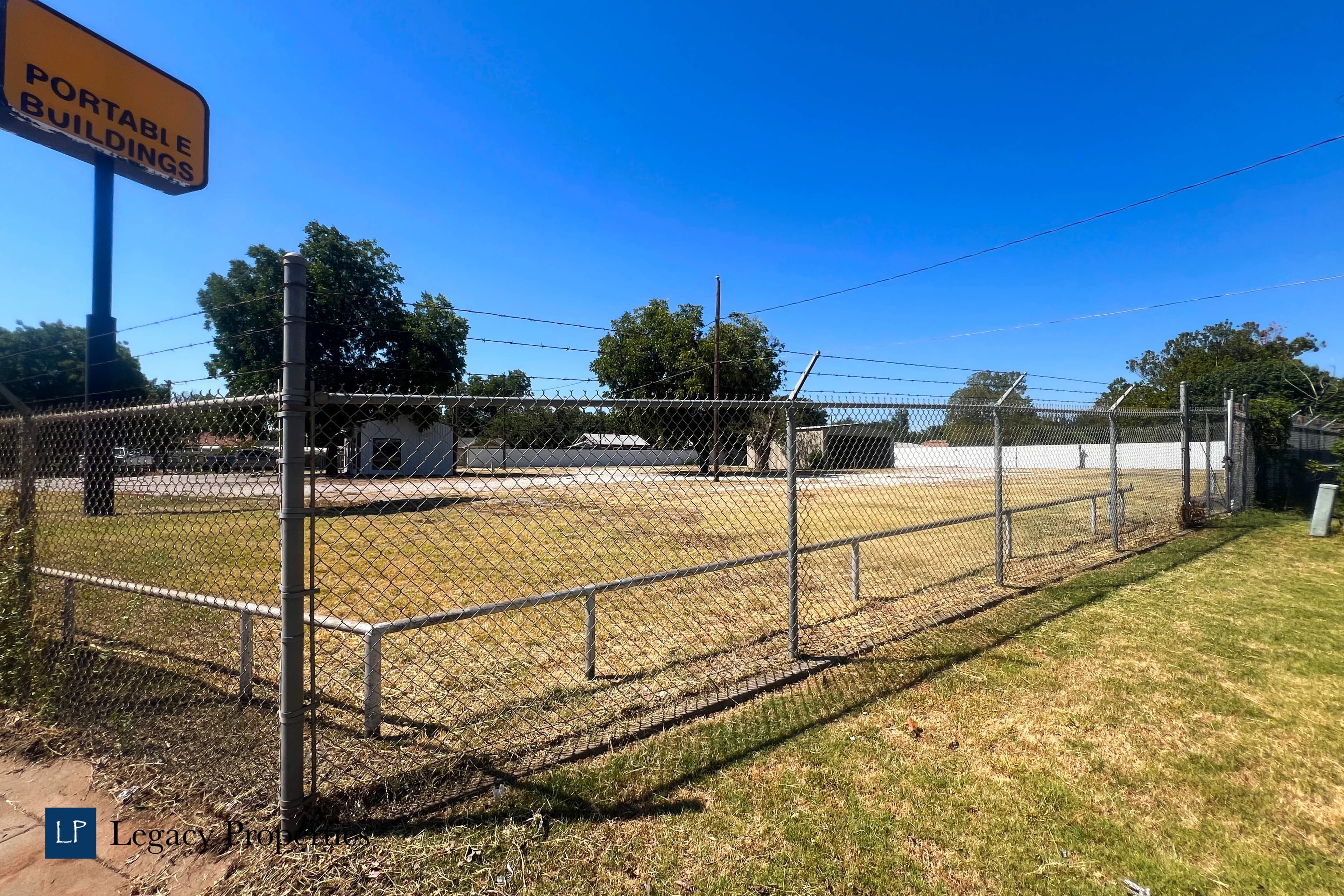 These two city lots total approximately 1.09 acres, per the appraisal district, and have a 7 ft tall chainlink security fence with top barbed wire around its perimeter; the back half also has a metal privacy fence. The property is bordered by two other city streets in addition to the highway frontage road; double gates on three sides allow easy access to all of these streets. Most of the property is gravel, with a concrete parking pad by the office.