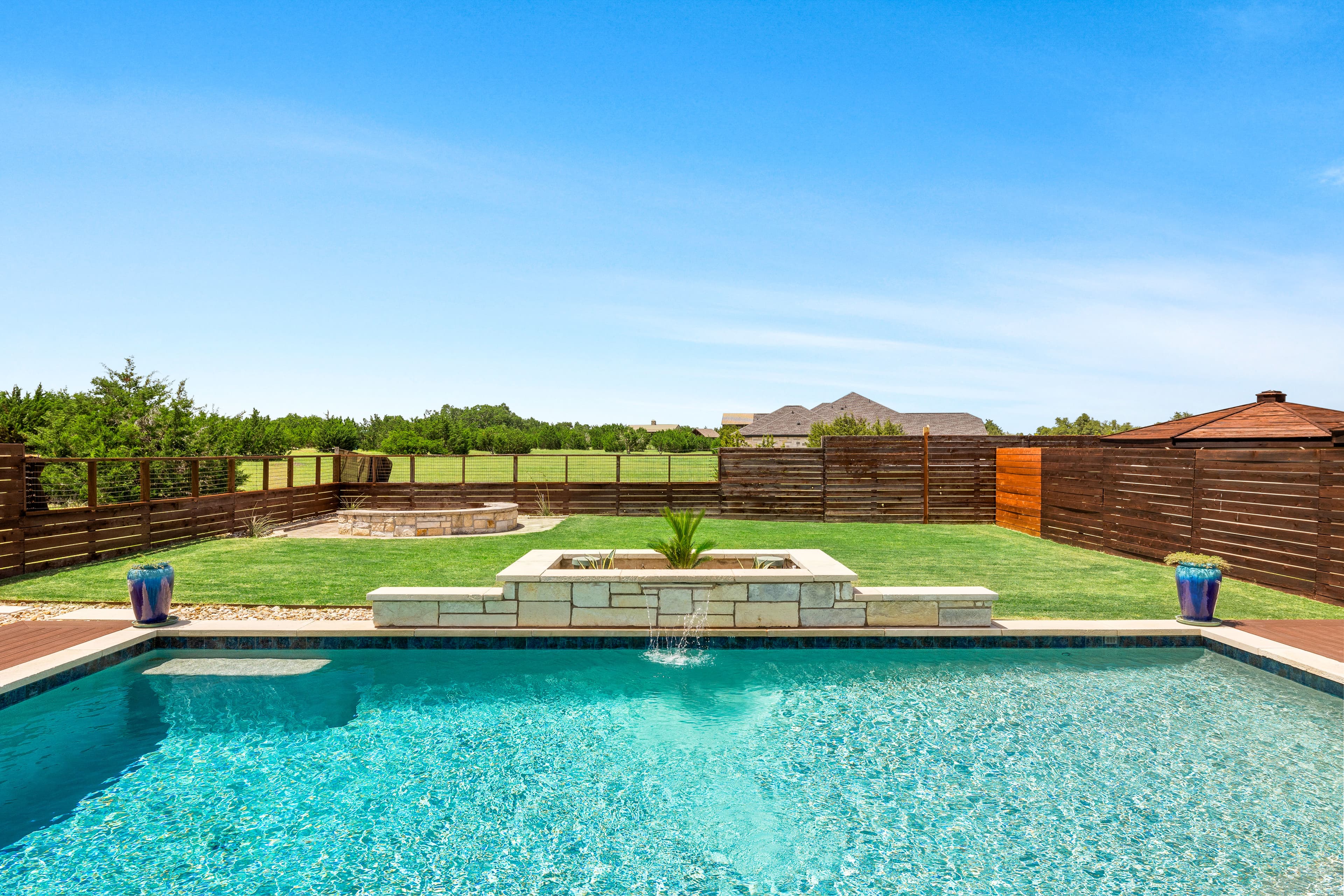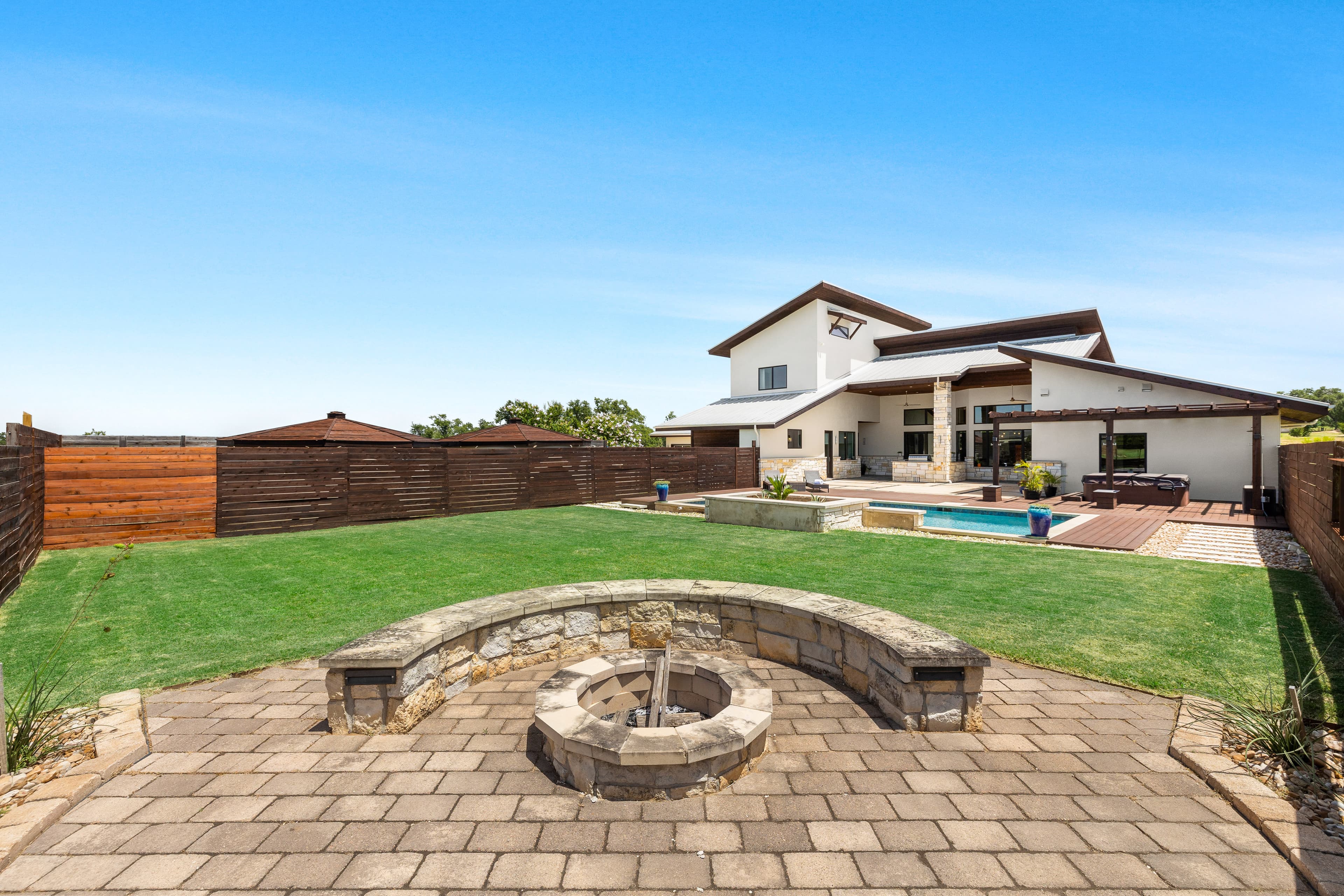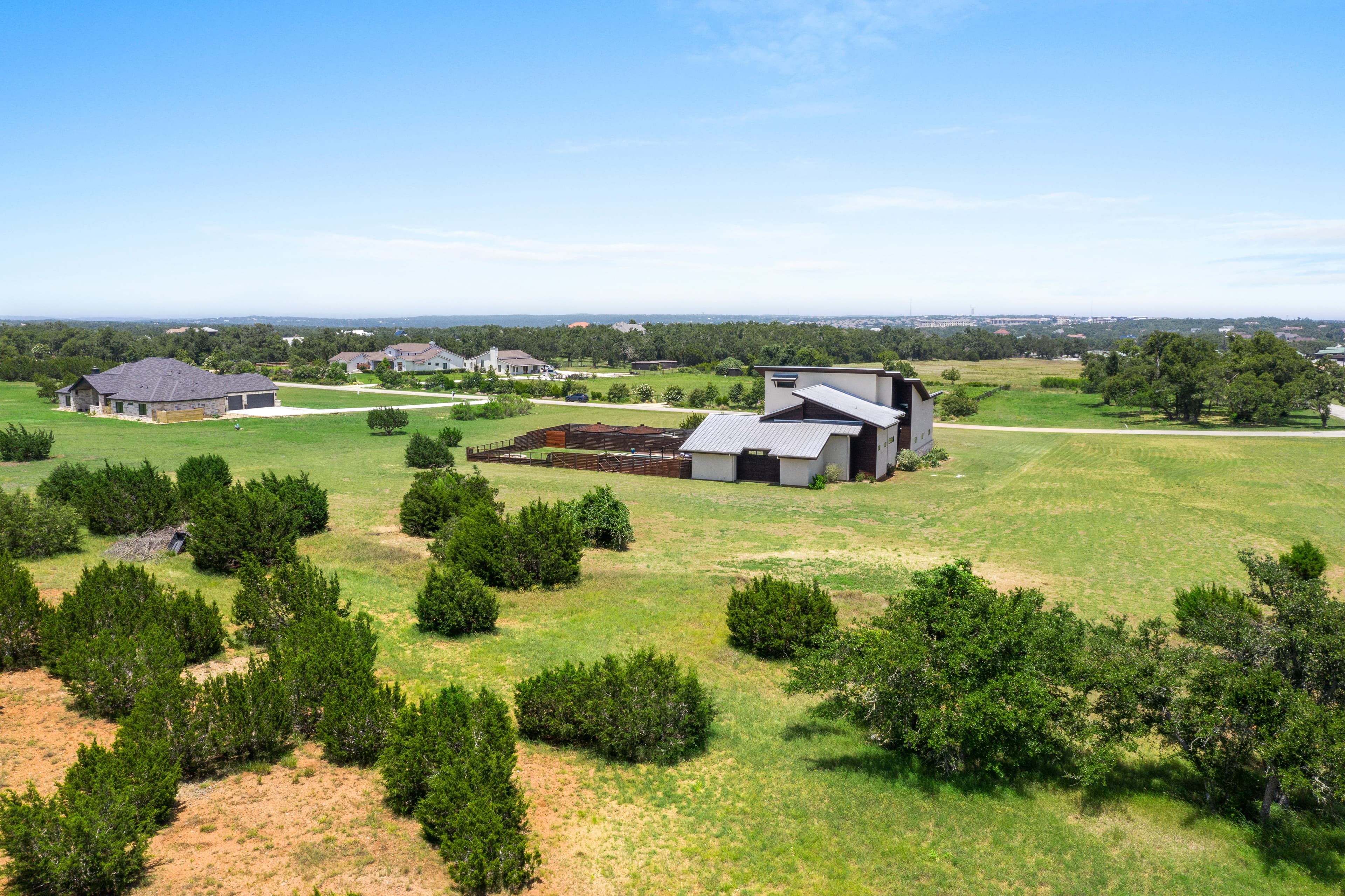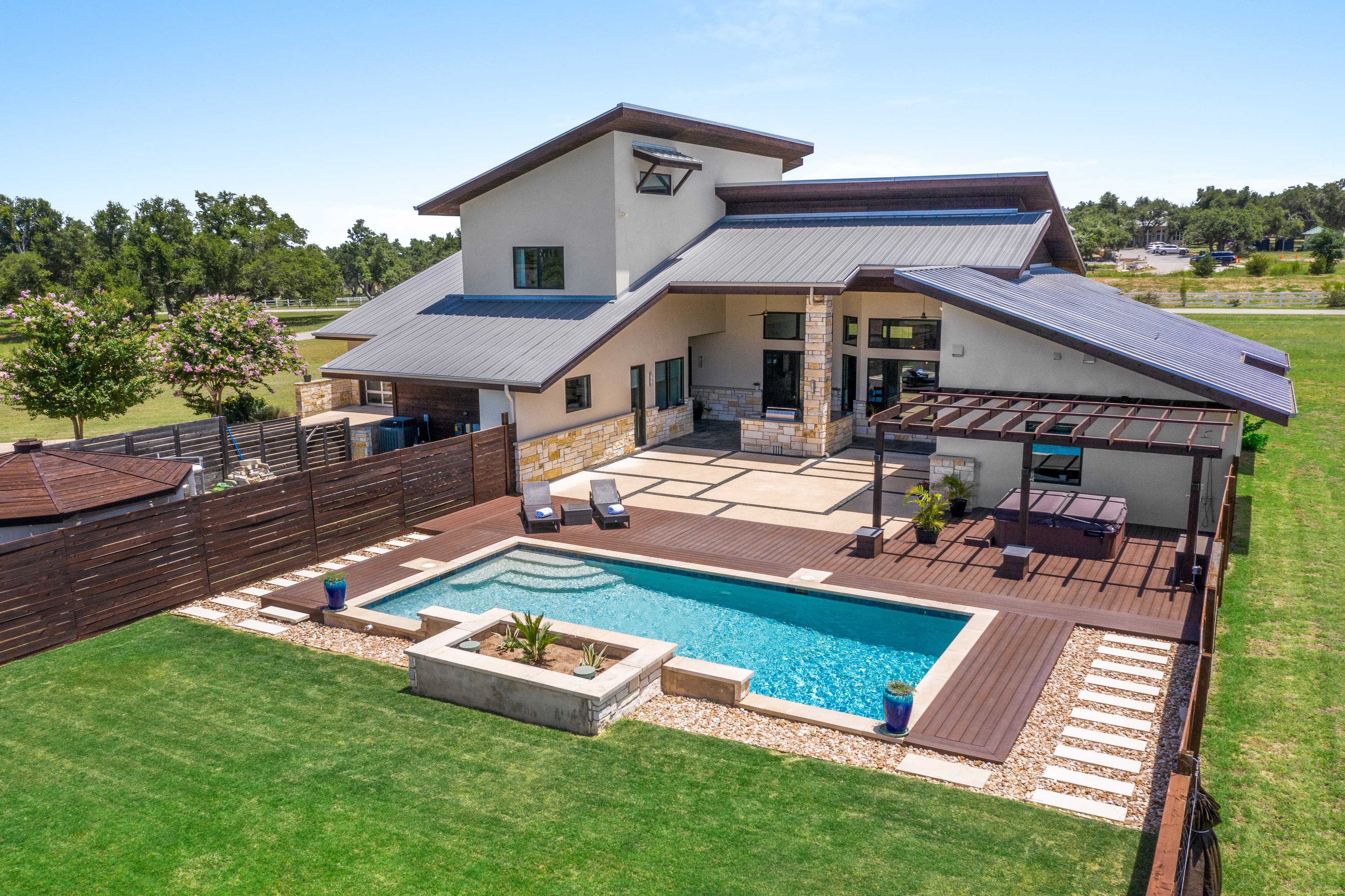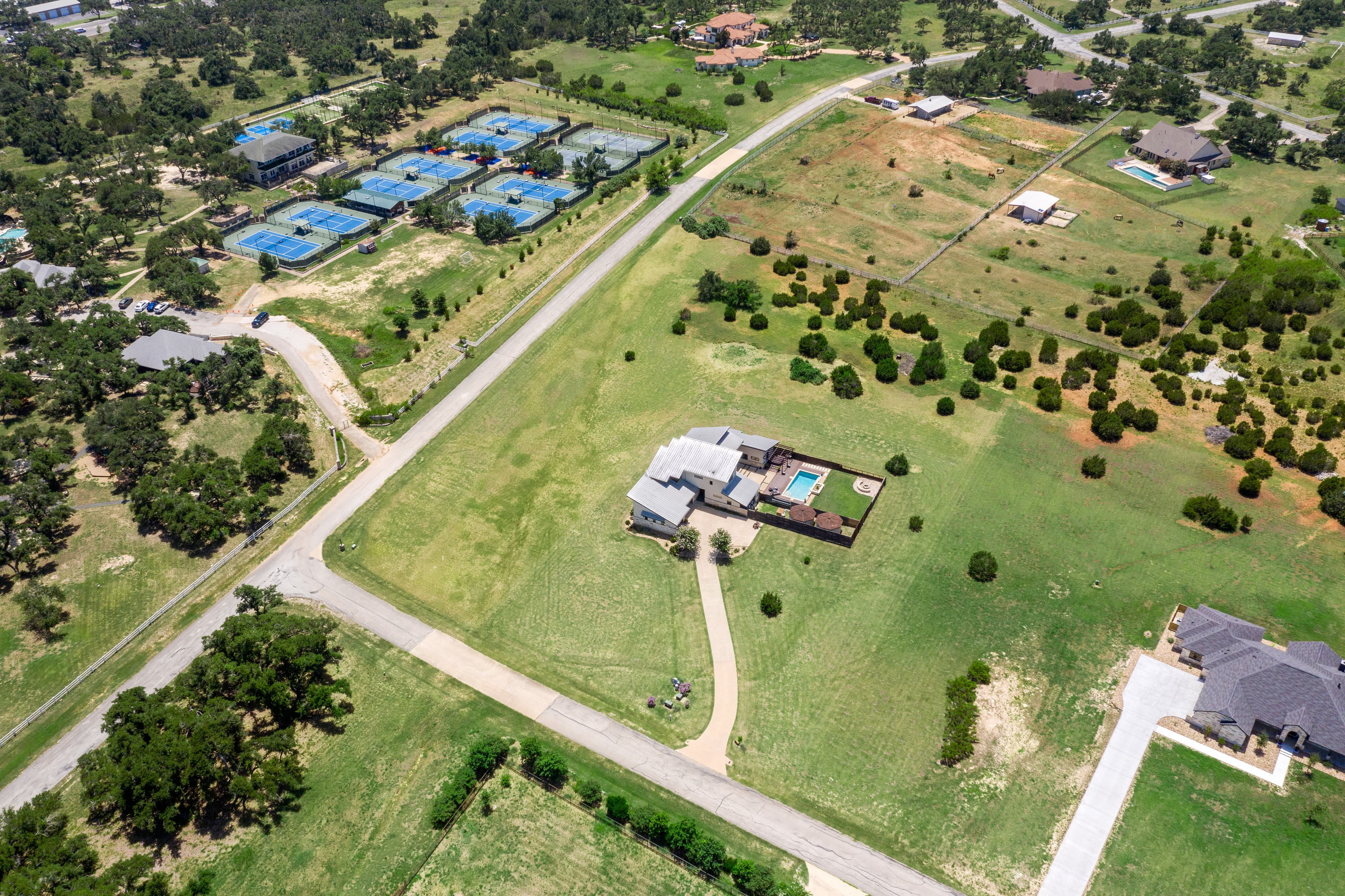 Welcome to 135 Winning Colors, a custom-built 2015 home in the prestigious gated community of Key Ranch at the Polo Club. Situated within the renowned Dripping Springs ISD, this modern 4-bedroom, 3.5-bathroom residence offers luxury, comfort, and functionality. The home features 3,262 square feet, including a 2,805 square foot main dwelling and a 457 square foot guest casita, perfect for guests or multigenerational living. Set on a sprawling 3.67-acre corner lot, there's ample room for additional structures that could include a barn and paddock, or sports court. Inside, discover bamboo plank and tile flooring. The main kitchen is a chef's dream, equipped with a Whirlpool refrigerator, Bertazonni 36" range and oven, wine refrigerator, and walnut butcher block island. The primary bathroom boasts heated floors, a soaking tub, and a large walk-in shower with dual shower heads. The outdoor living space features 750 square feet of covered patio, an outdoor kitchen, pool, hot tub, and fire pit. The property also includes a 30,000-gallon rainwater harvesting system with three-stage filtration and UV sterilization, ensuring a sustainable water supply. Recent updates include fresh exterior paint and stain (2024). Additional amenities include a 1,029 square foot three-car attached garage and a luxurious pool. Conveniently located near AESA Prep Academy, the POLO Tennis Club (featuring Tennis, Pickleball, and Padel courts), and The XS Equine Stables, this property is ideal for sports and equestrian enthusiasts. Key Ranch offers equestrian-friendly homesites ranging from 3 to 10 acres, just 18 miles west of downtown Austin. Experience modern living in a serene, gated community at 135 Winning Colors. This property offers a luxurious lifestyle in a prime location.