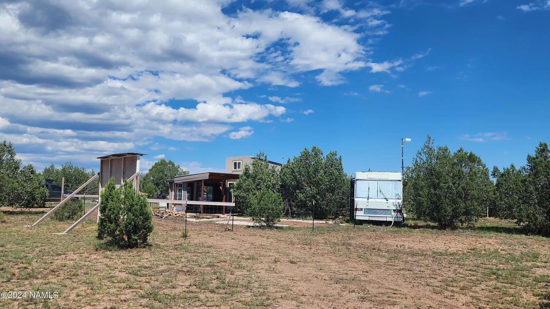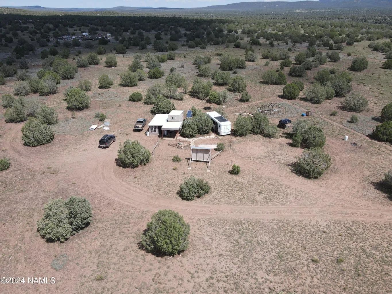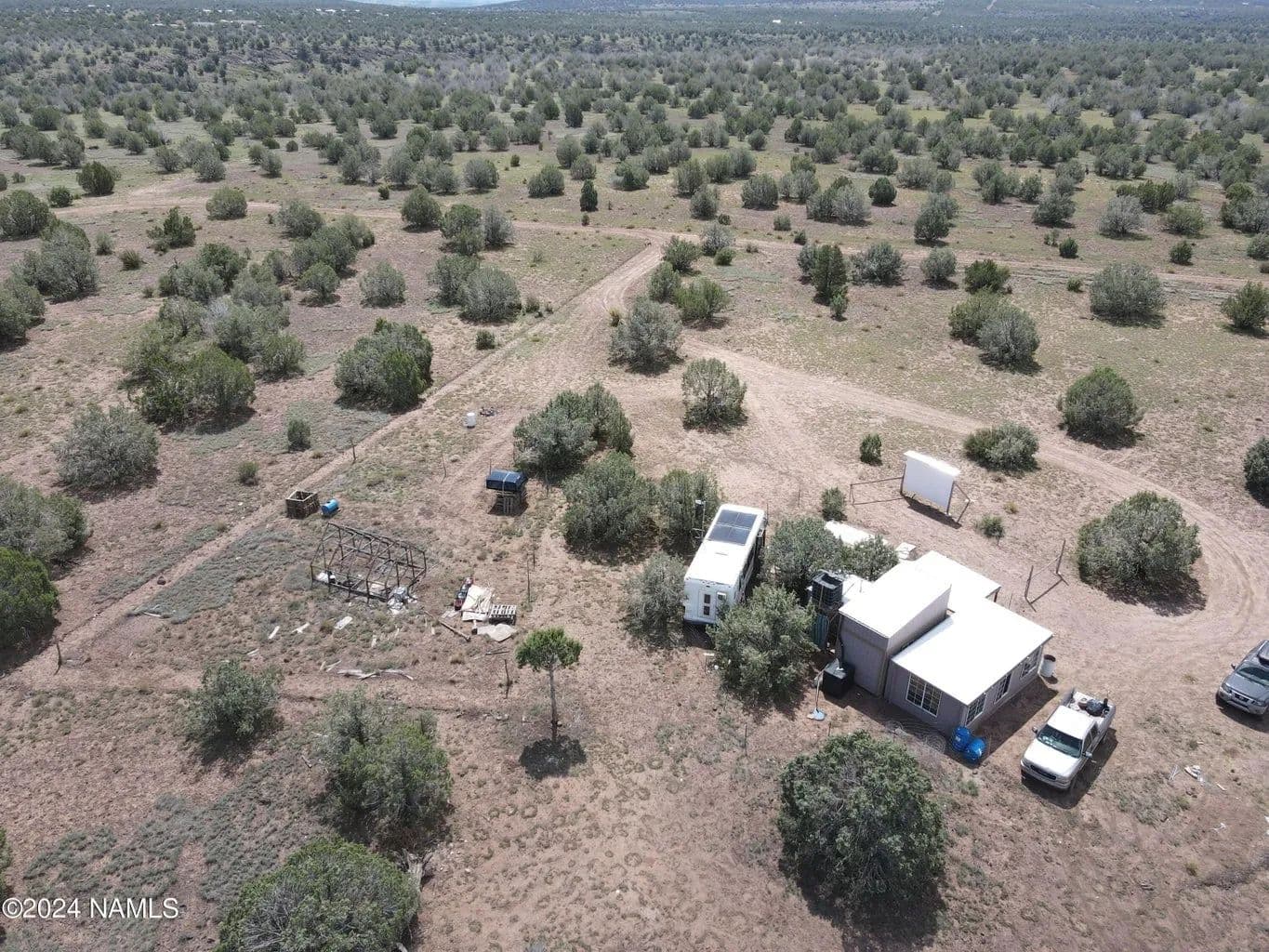 For sale is a unique & off-grid property, Crow's Foot Ranch, nestled on 2.22 acres of land in Ash Fork, AZ. The property features various improvements designed for sustainability and minimalist living. Located at 5300 ft elevation, this serene ranch offers breathtaking views of surrounding Mts. & is enveloped in a landscape of Pinon & Juniper trees. The Tiny Home is designed for comfort & sustainability. It includes: 2 lofts that provide sleeping space & storage; a kitchen for basic meal preparation; & a lounge area with efficient, innovative venting to maintain a cool environment in the summer & a wood stove to keep it warm during winter months. Property also includes a 12x24 sunroom, converted airport shuttle, a separate bathroom/ laundry structure, & an outdoor movie screen. AMAZING!