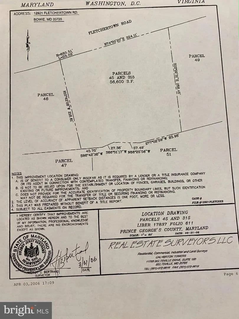 1.29 acres of wooded land located at 12921 Fletchertown Road, Bowie, Maryland. The parcel features mature trees and paved road access. Public water and sewer are reported to be available; buyers must verify all utilities. Zoned RR (Rural Residential). Buyers are responsible for all due diligence, including FEMA flood elevation certificates, environmental assessments, soil testing, grading analysis, utility connections, and permit requirements. Sale terms: Cash only. No financing, inspection, or appraisal contingencies. As-is condition. 30-day settlement. Proof of funds required with offers.