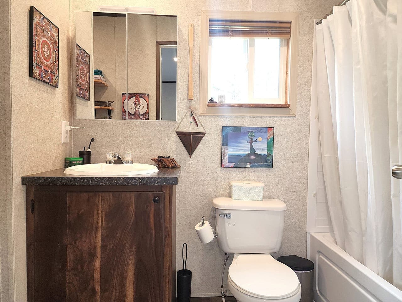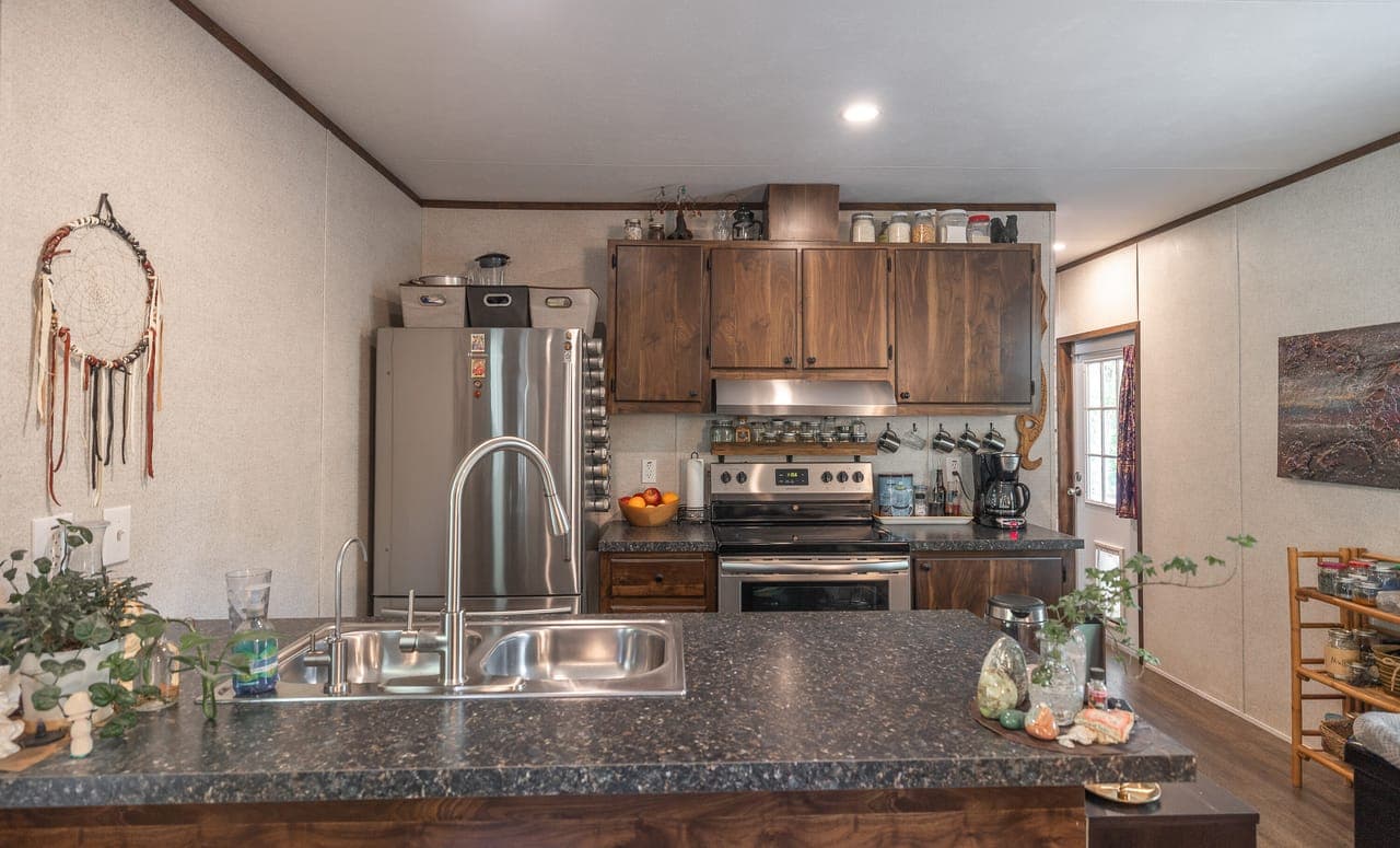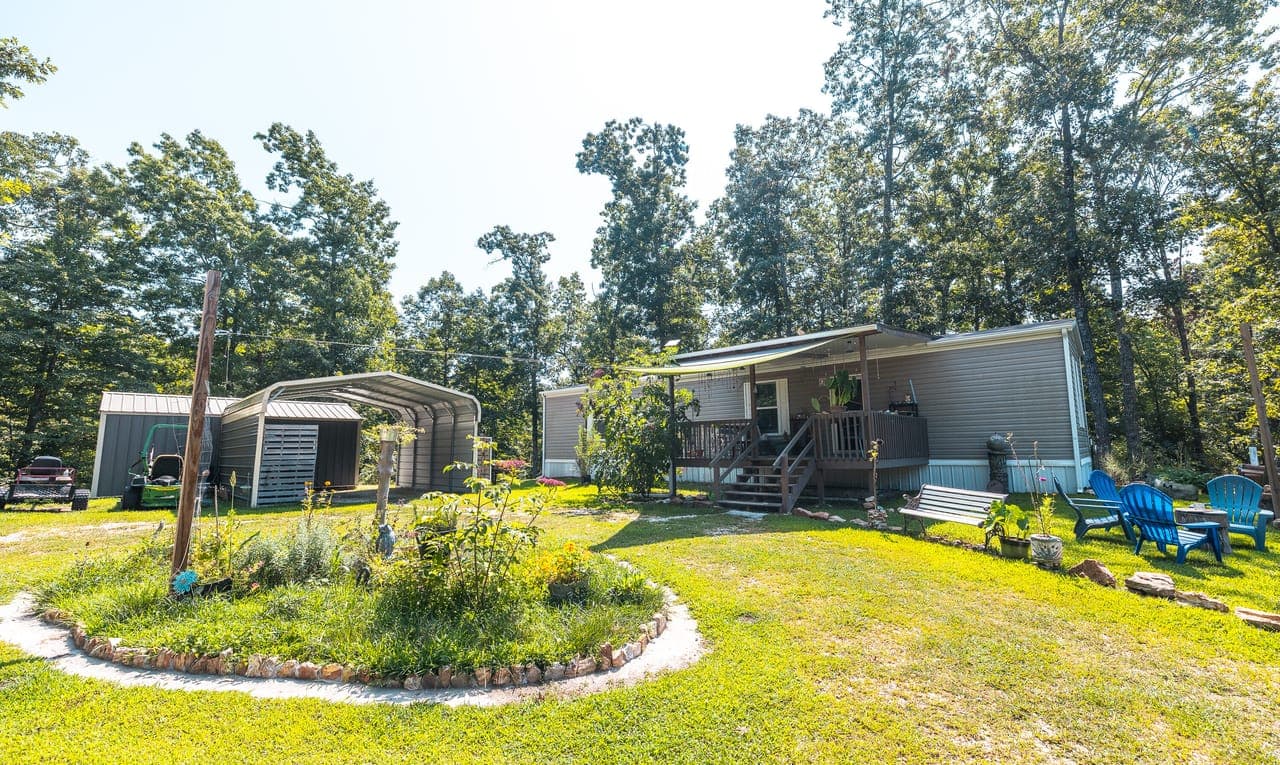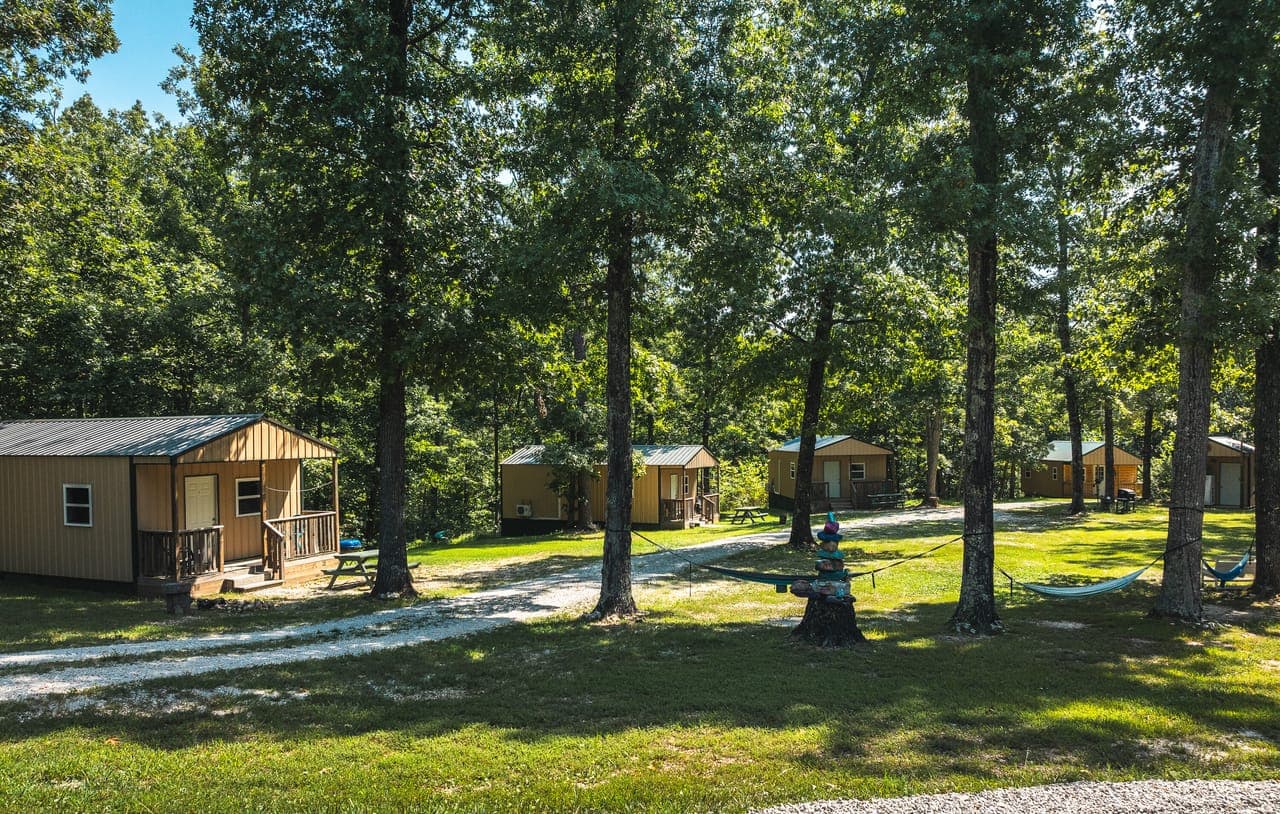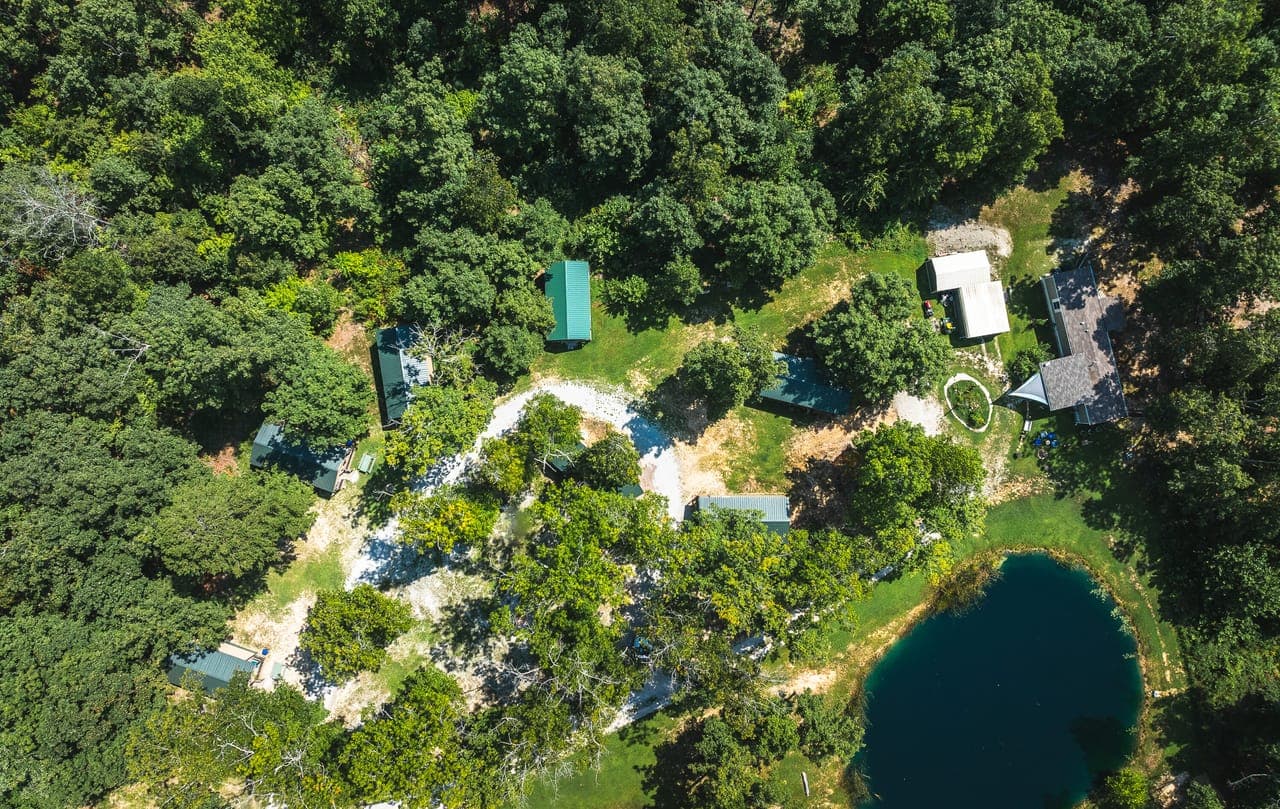 A gem in the heart of the Ozarks, on 22 acres, mostly wooded. Currently operating as vacation rentals near the Current River. Five fully furnished cabins and main residence. Residence is 2 bed/2 bath, fully furnished stylish modern 2020 mobile home, with stainless appliances, updated fixtures and covered porch overlooking the pond, could be additional rental. There are five cabins, each with its own porch, kitchenette, living area, full bathroom, separate bedroom, heating and cooling: accommodating 2-6 guests.