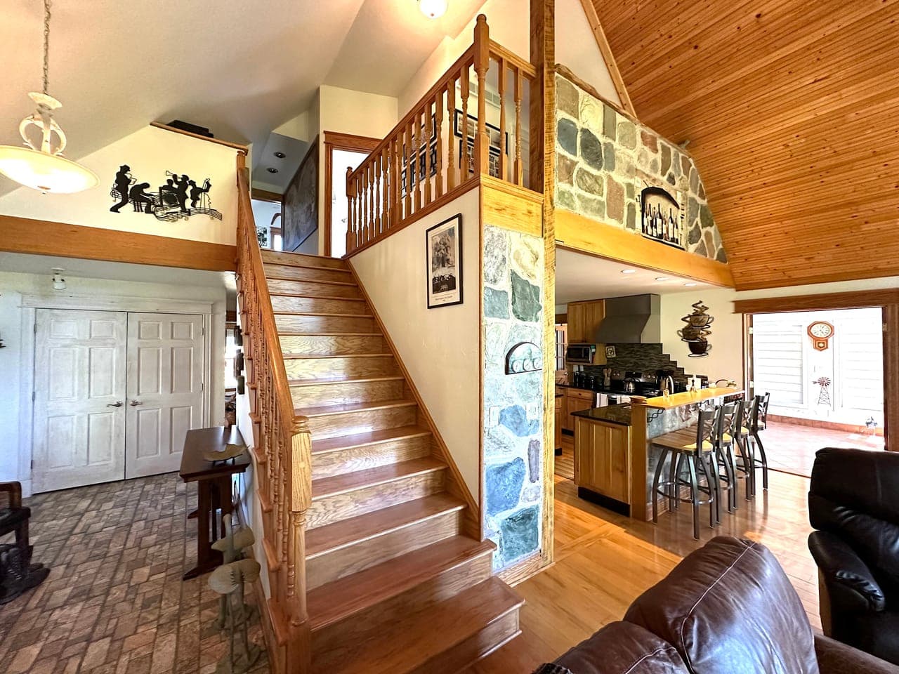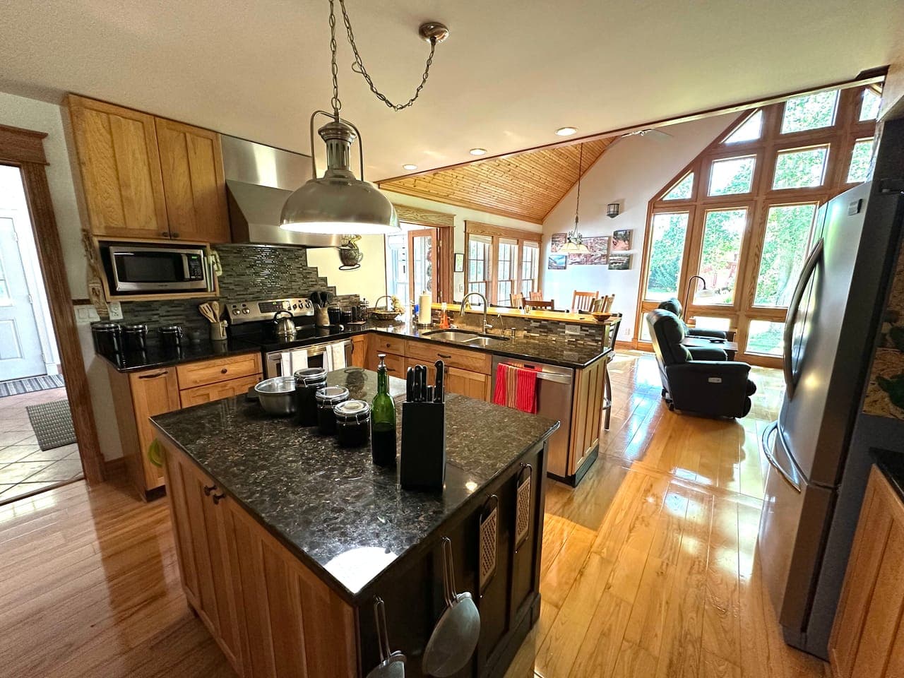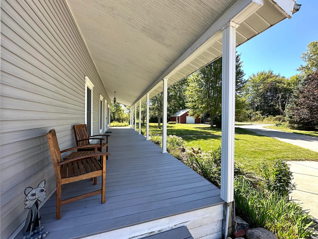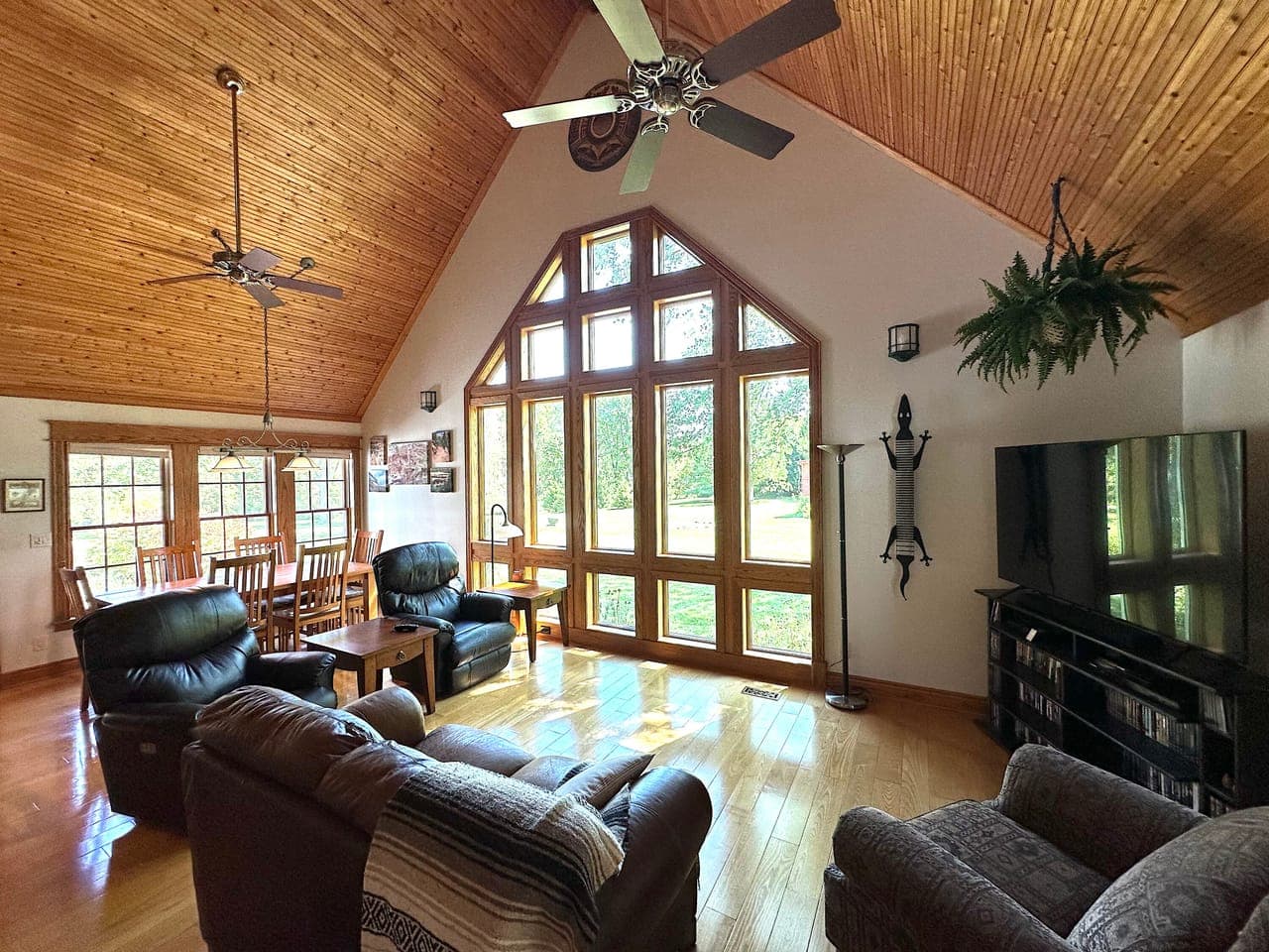 Located in Southwest Michigan, this 2,300-square-foot custom-built home features 4 bedrooms and 3 bathrooms. Situated on 38 acres it offers a comprehensive range of amenities. The entrance flows seamlessly into the living room, which boasts a 20-foot ceiling. The main living area has hardwood and tile flooring throughout. The centrally located kitchen includes an abundance of cabinets, a granite countertop, an induction stove, and a spacious island. Adjacent to the kitchen is the sunroom which includes a full bath, washer/dryer combo and a countertop sink. Beyond the sunroom is a screened-in porch where you can comfortably relax and view a variety of wildlife.