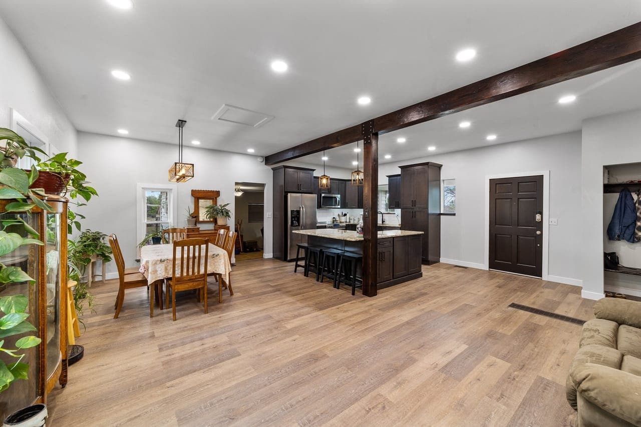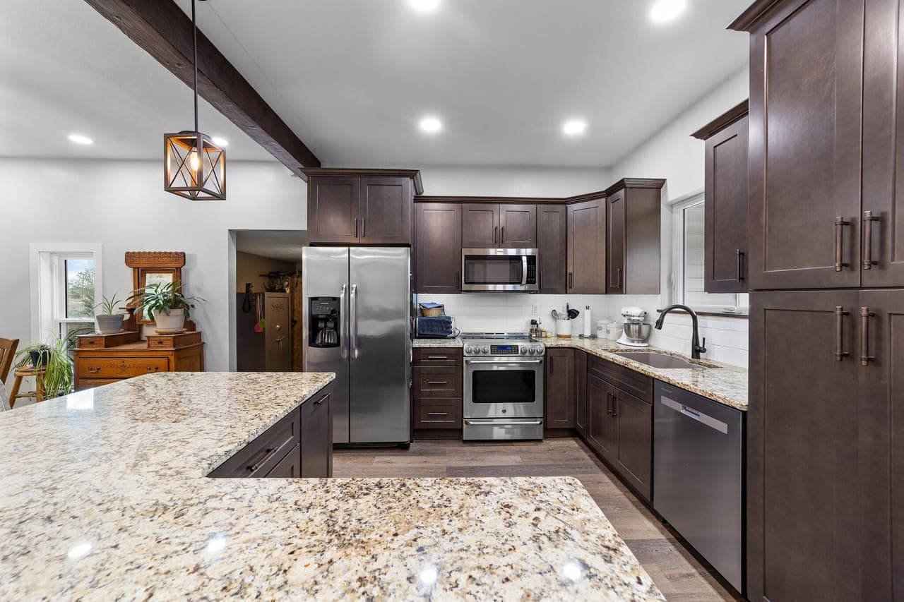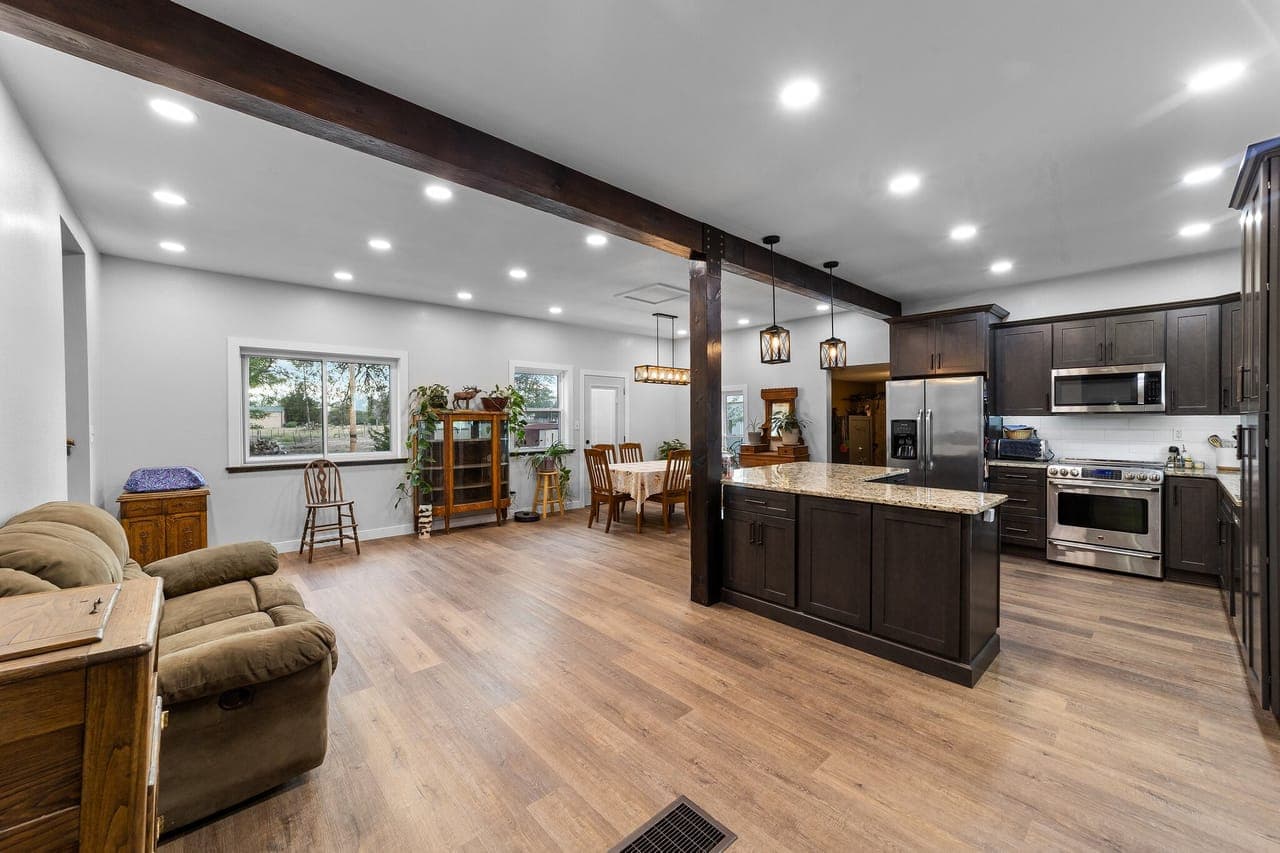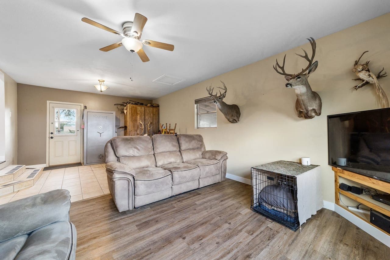 Enjoy country living on 3.45-acres, sitting on the edge of Las Animas City Limits. This 3-bedroom, 1.5 bath home is tucked behind mature trees at the end of a paved road with surrounding open fields. Let the lush front yard and flowering plants welcome you onto the property. The open concept main level includes a newly remodeled kitchen with granite countertops, and luxury vinyl plank flooring that spans into the 2 separate living rooms. The lower level includes 1 bedroom, half bath, and a laundry space with a stackable washer and dryer. The upper level has 2 bedrooms and a full bathroom with a tub and shower combo. Allow the 2 large additional living spaces of the home meet your needs as you see fit. Included on the property is an attached carport, a 2-car carport, and a 2-car garage with a separate workshop. The workshop has 110v and 220v outlets. There is an assortment of established trees watered by a drip irrigation system allowing for shade and additional privacy. The back yard has a chain link fence creating a defined space. This property has so much to offer to a new homeowner, let it be you!